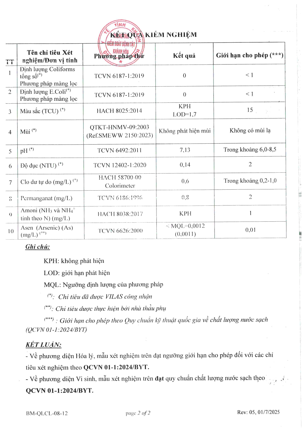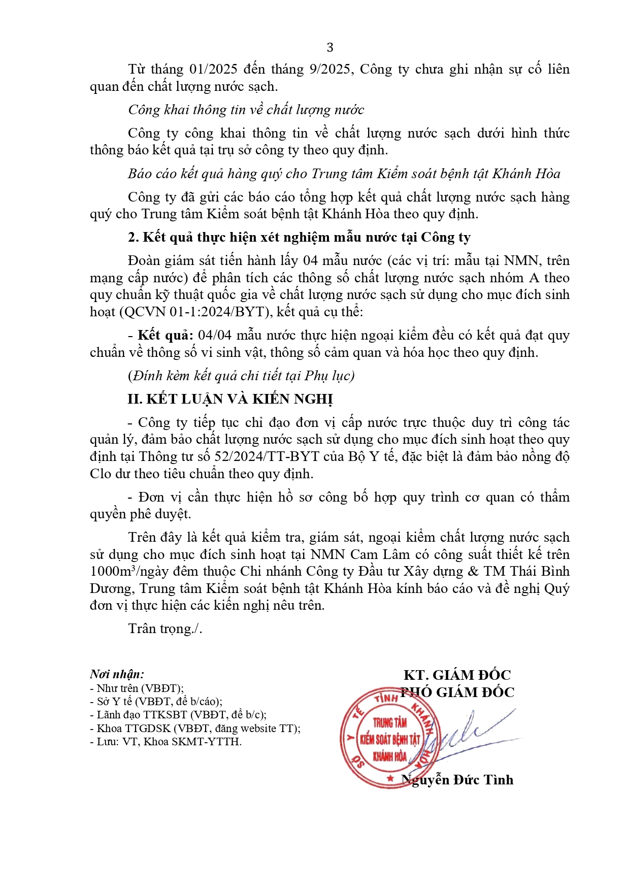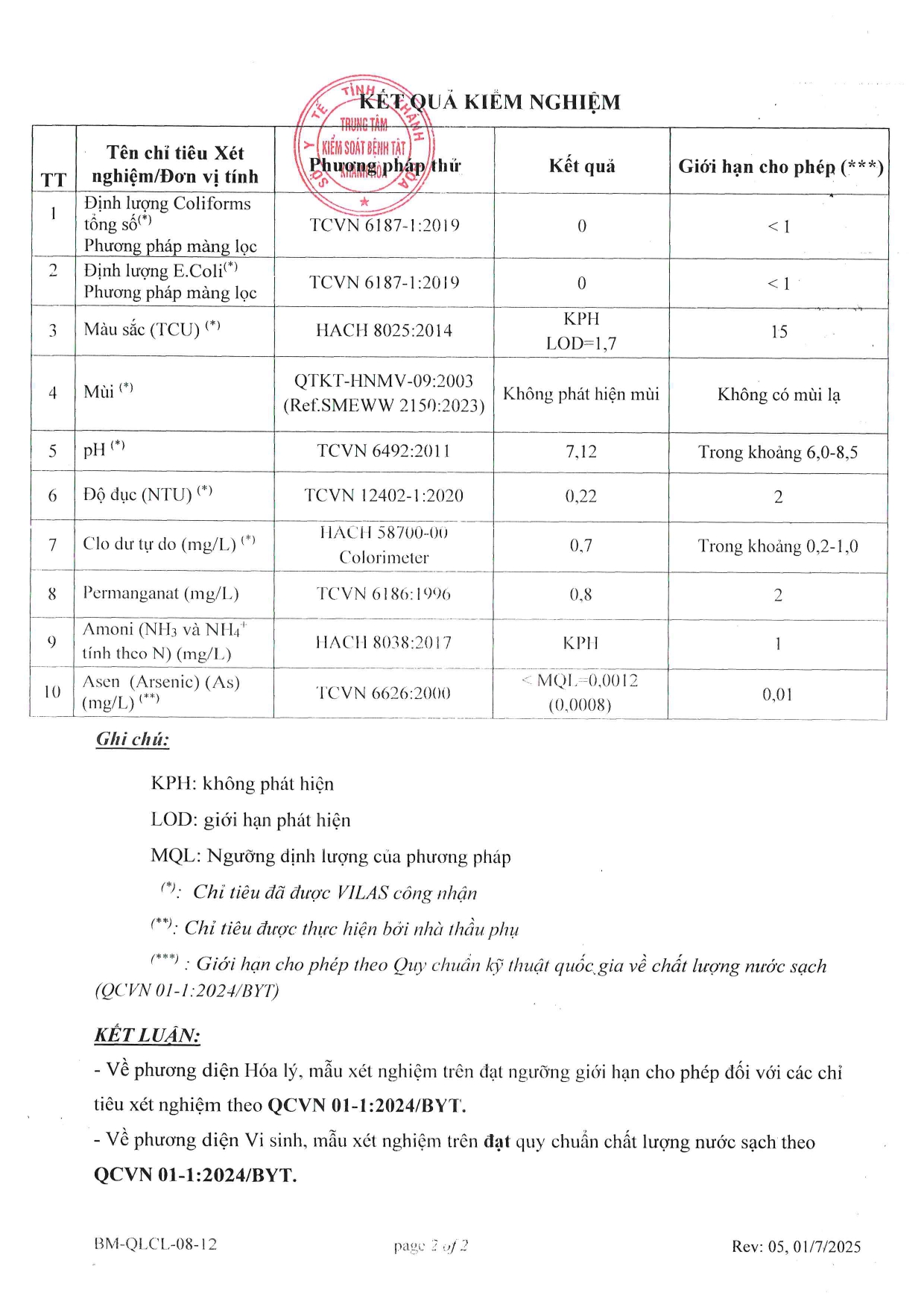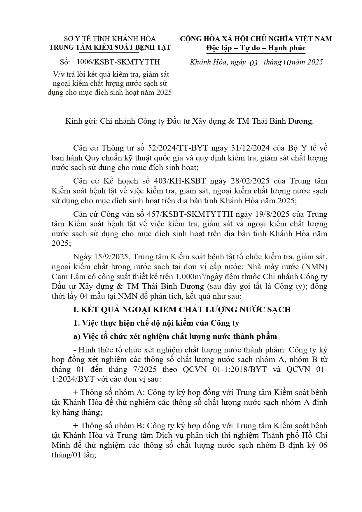V/v trả lời kết quả kiểm tra, giám sát ngoại kiểm chất lượng nước sạch sử dụng cho mục đích sinh hoạt năm 2025