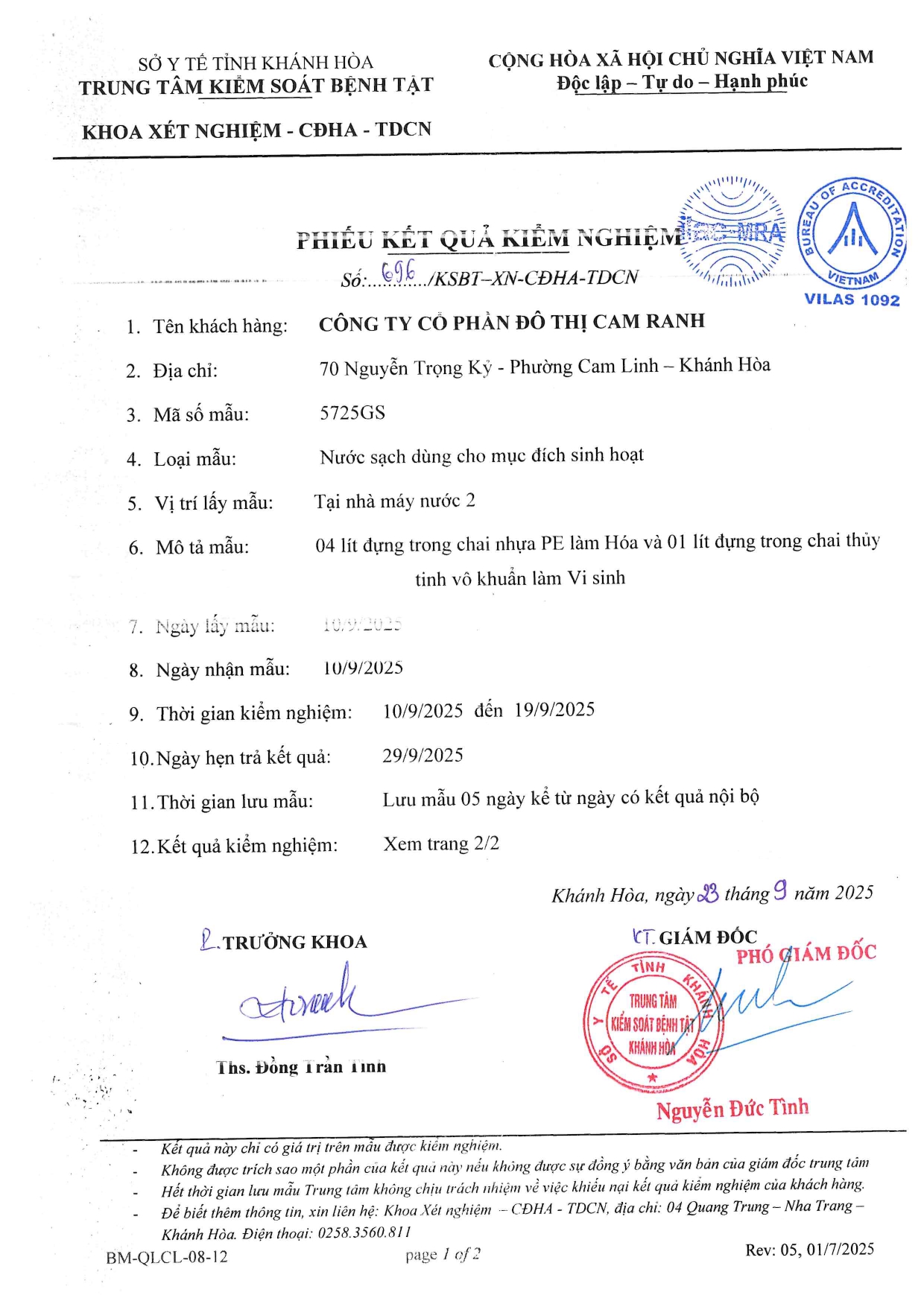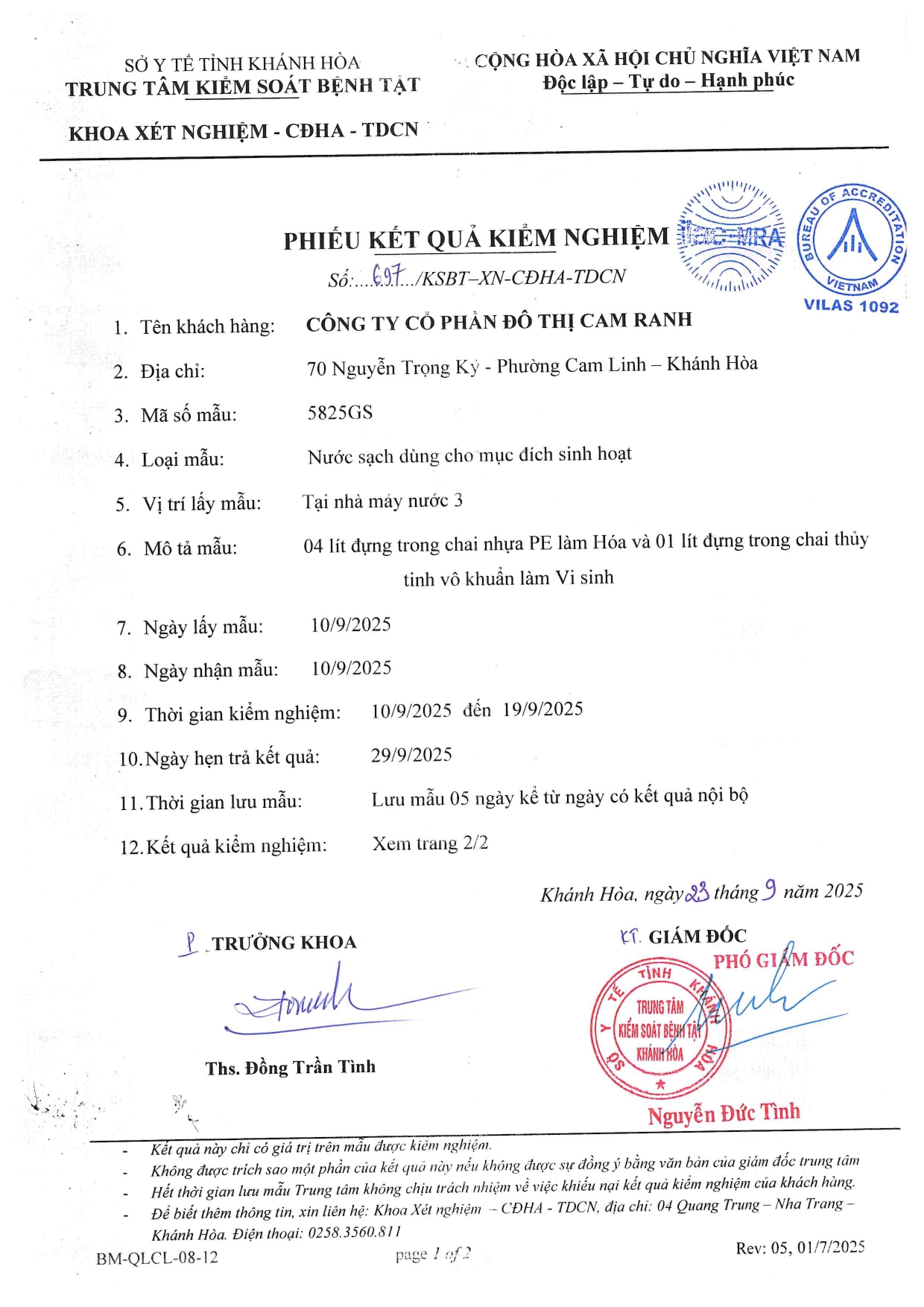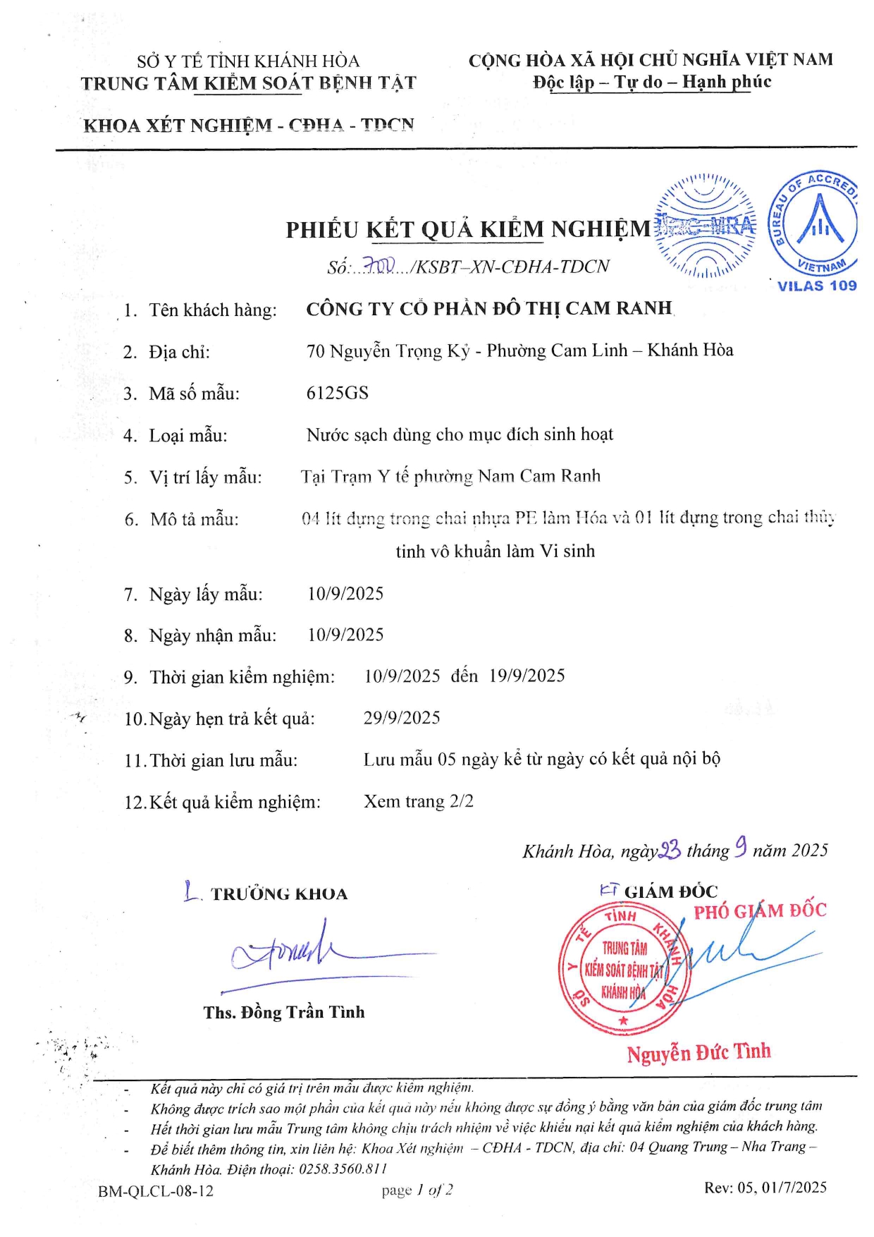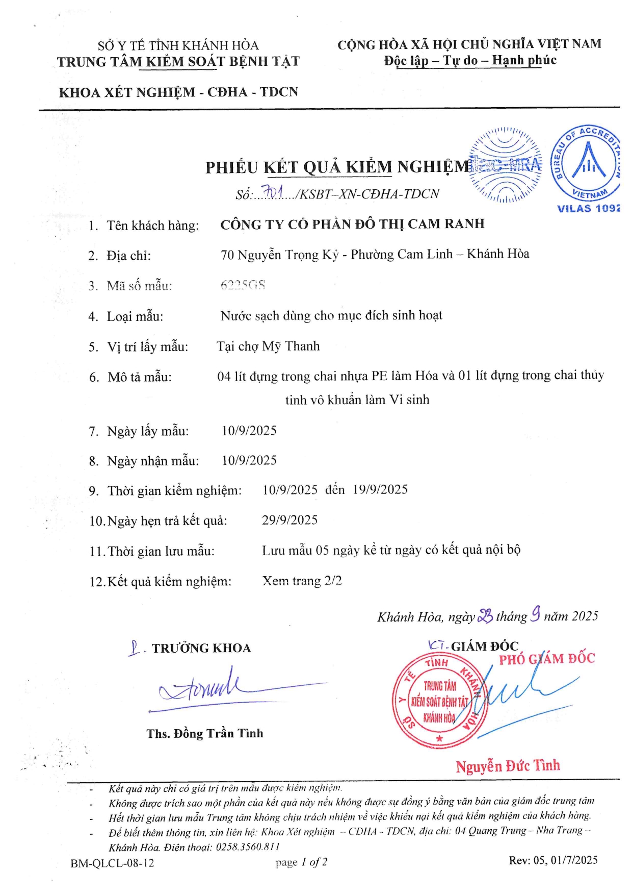 V/v trả lời kết quả kiểm tra, giám sát ngoại kiểm chất lượng nước sạch sử dụng cho mục đích sinh hoạt năm 2025