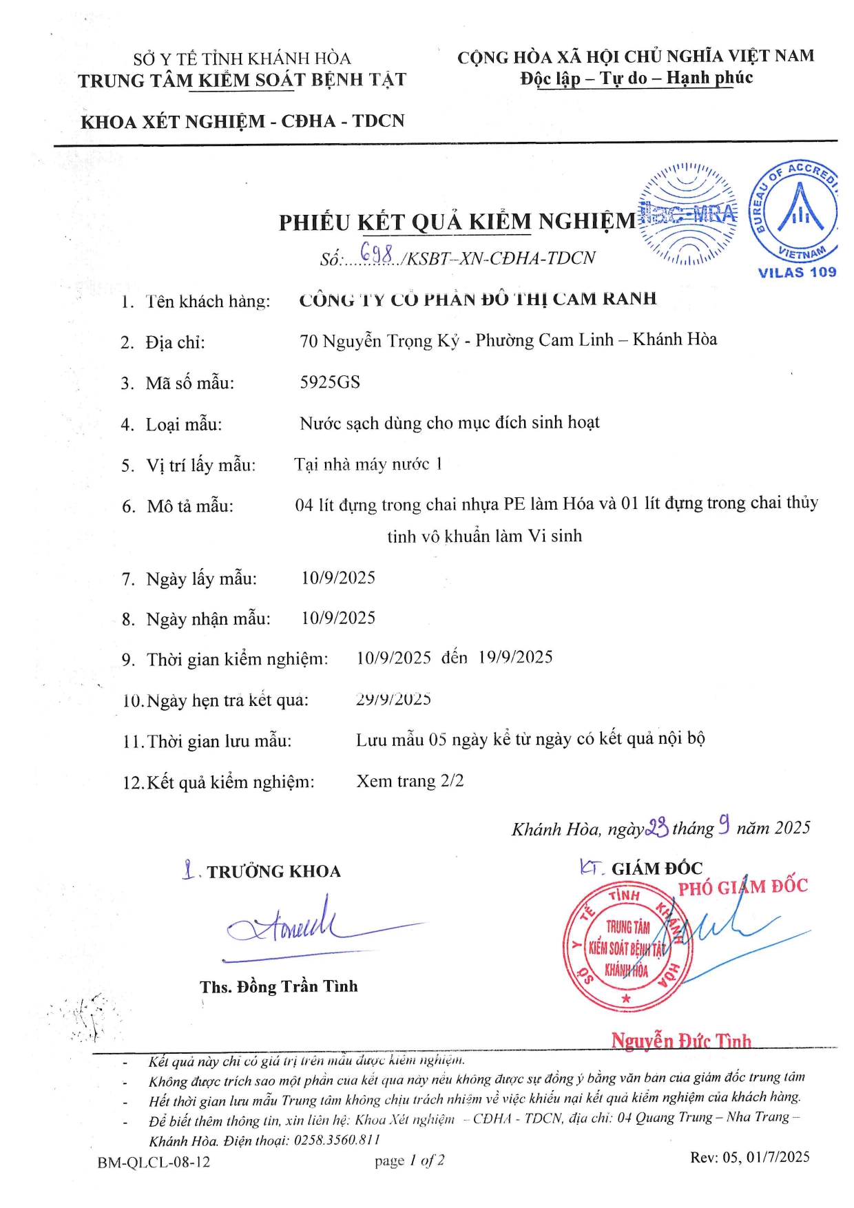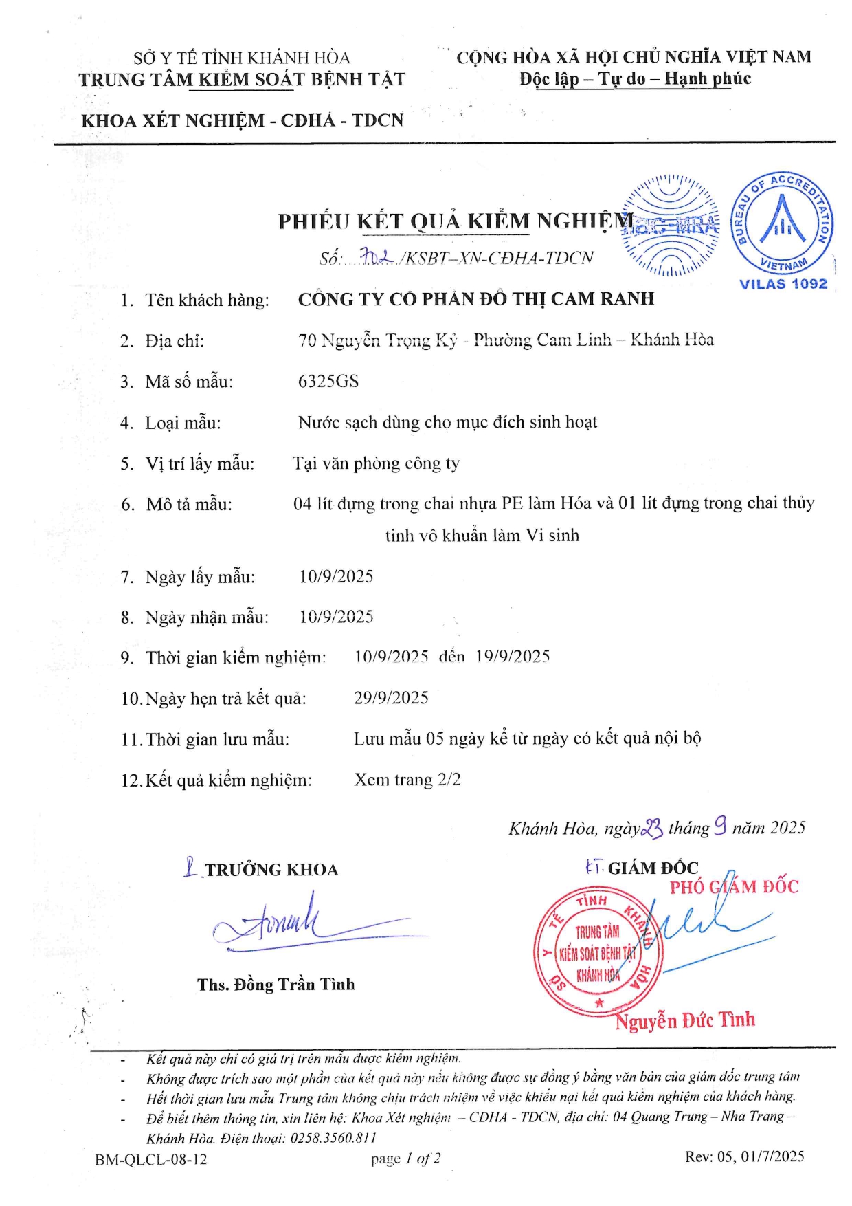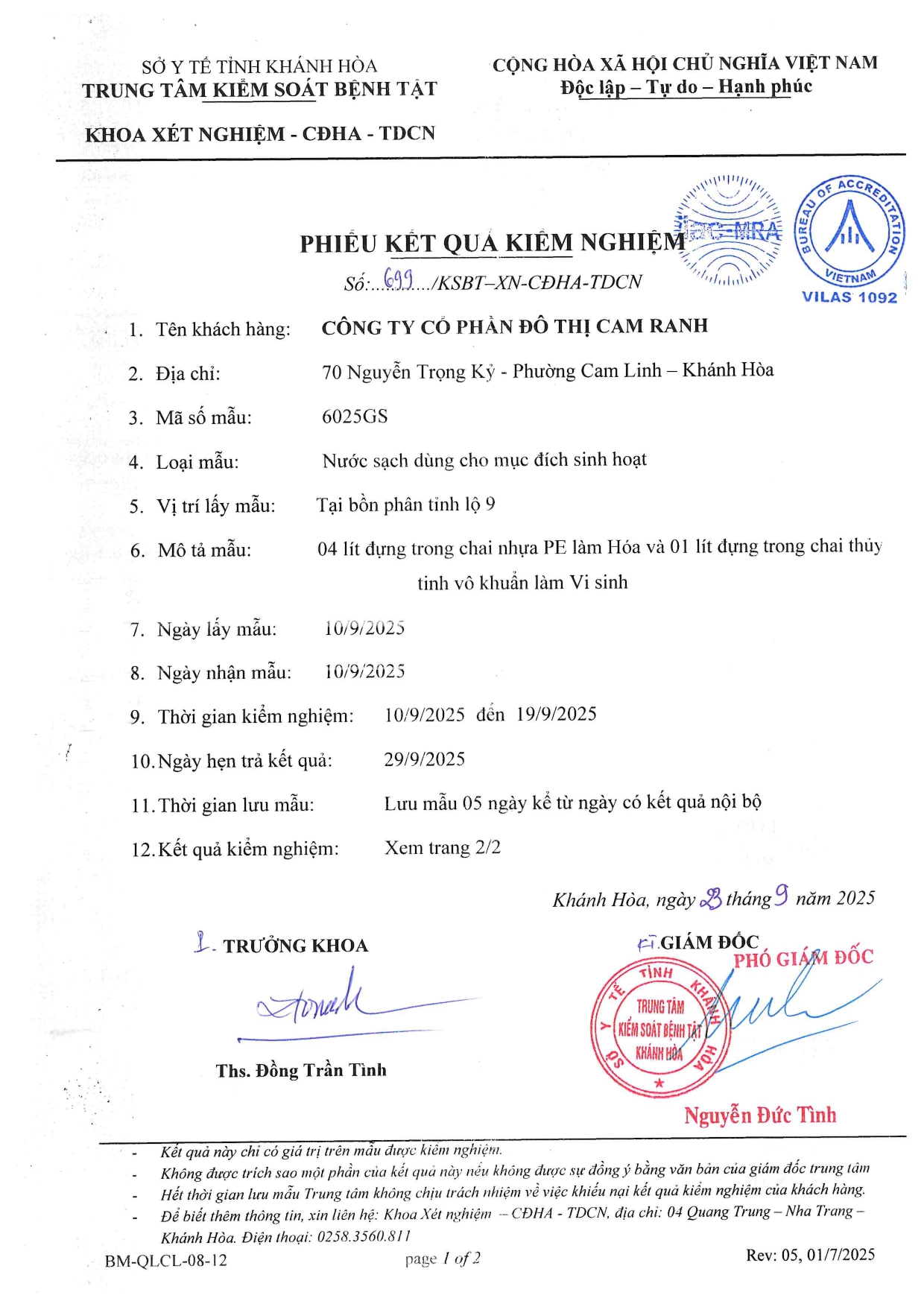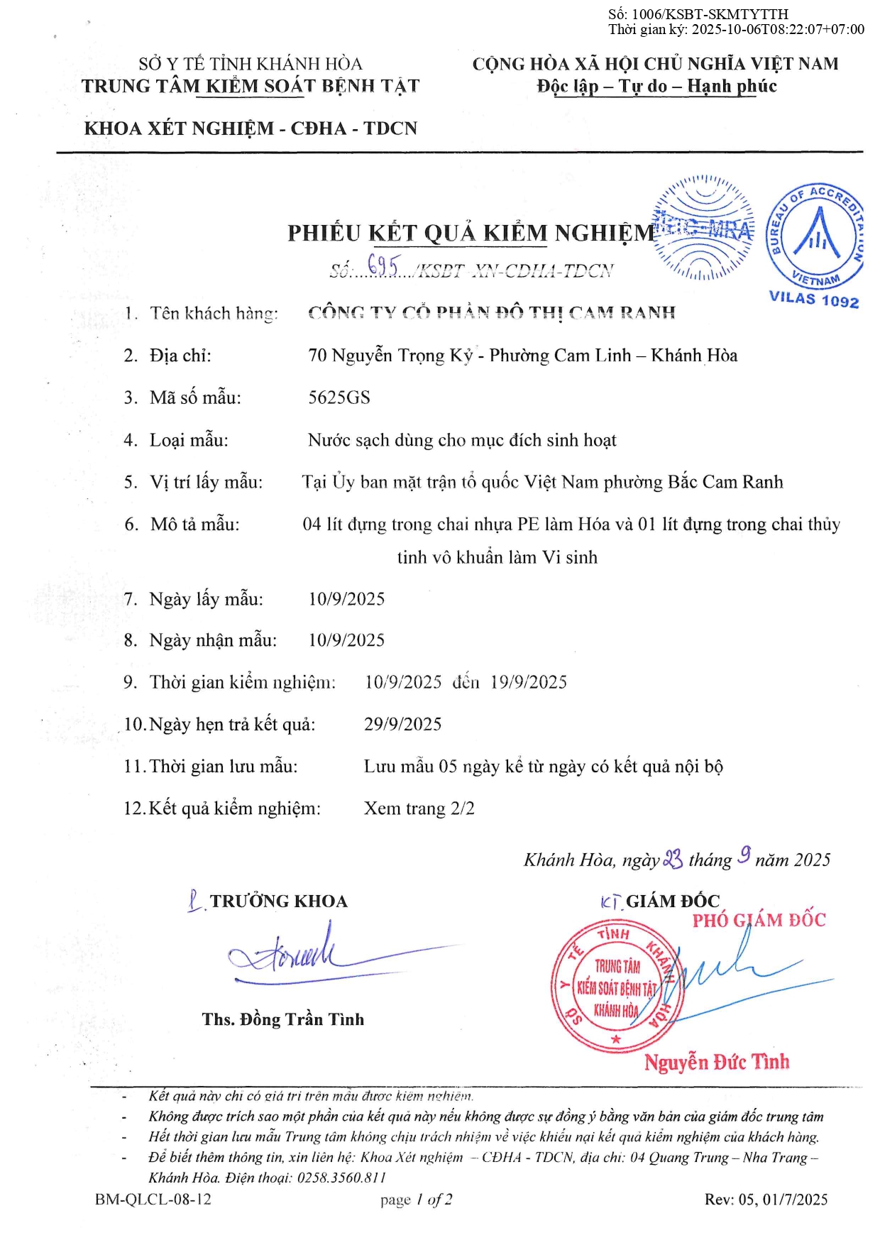 V/v trả lời kết quả kiểm tra, giám sát ngoại kiểm chất lượng nước sạch sử dụng cho mục đích sinh hoạt năm 2025
