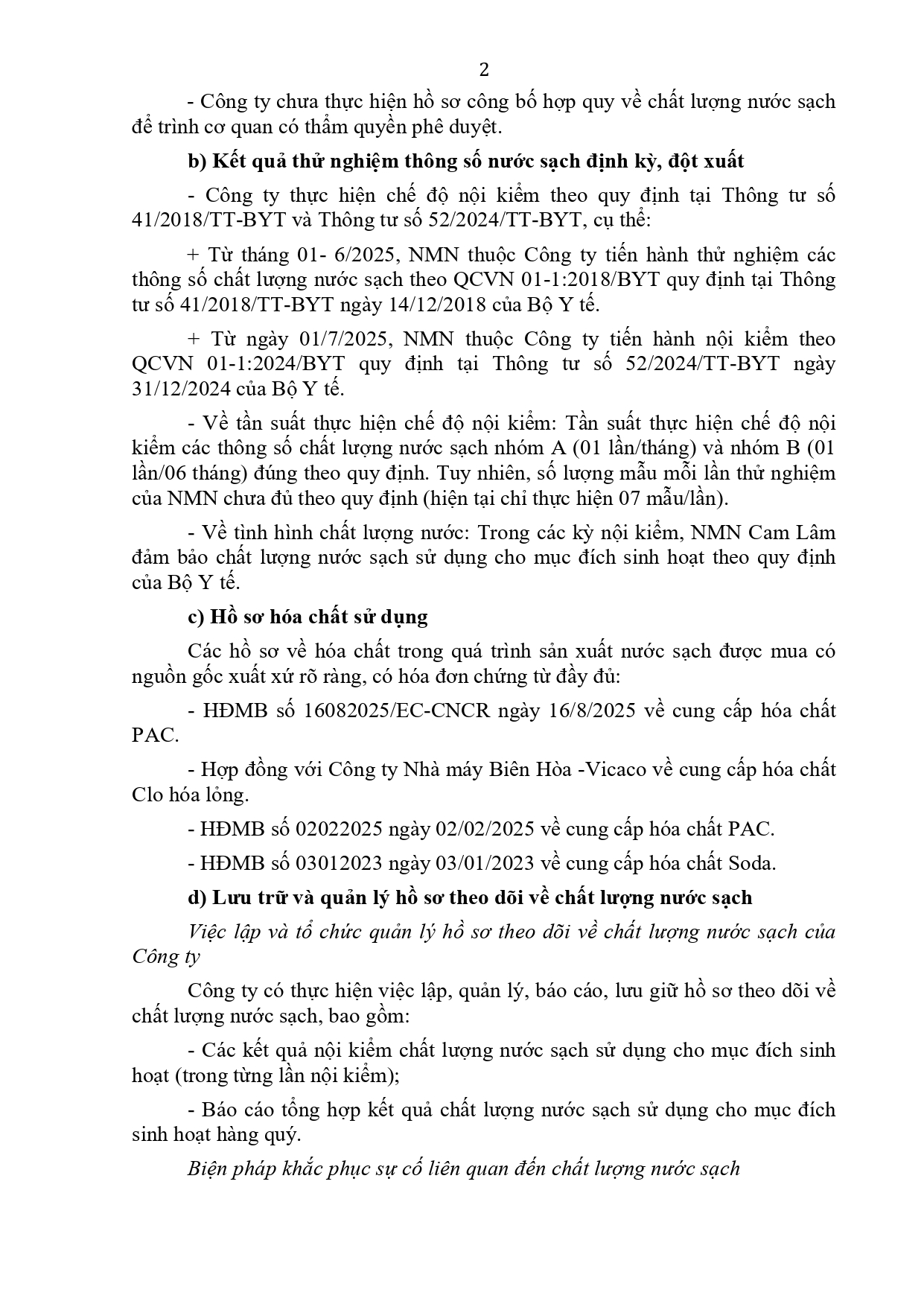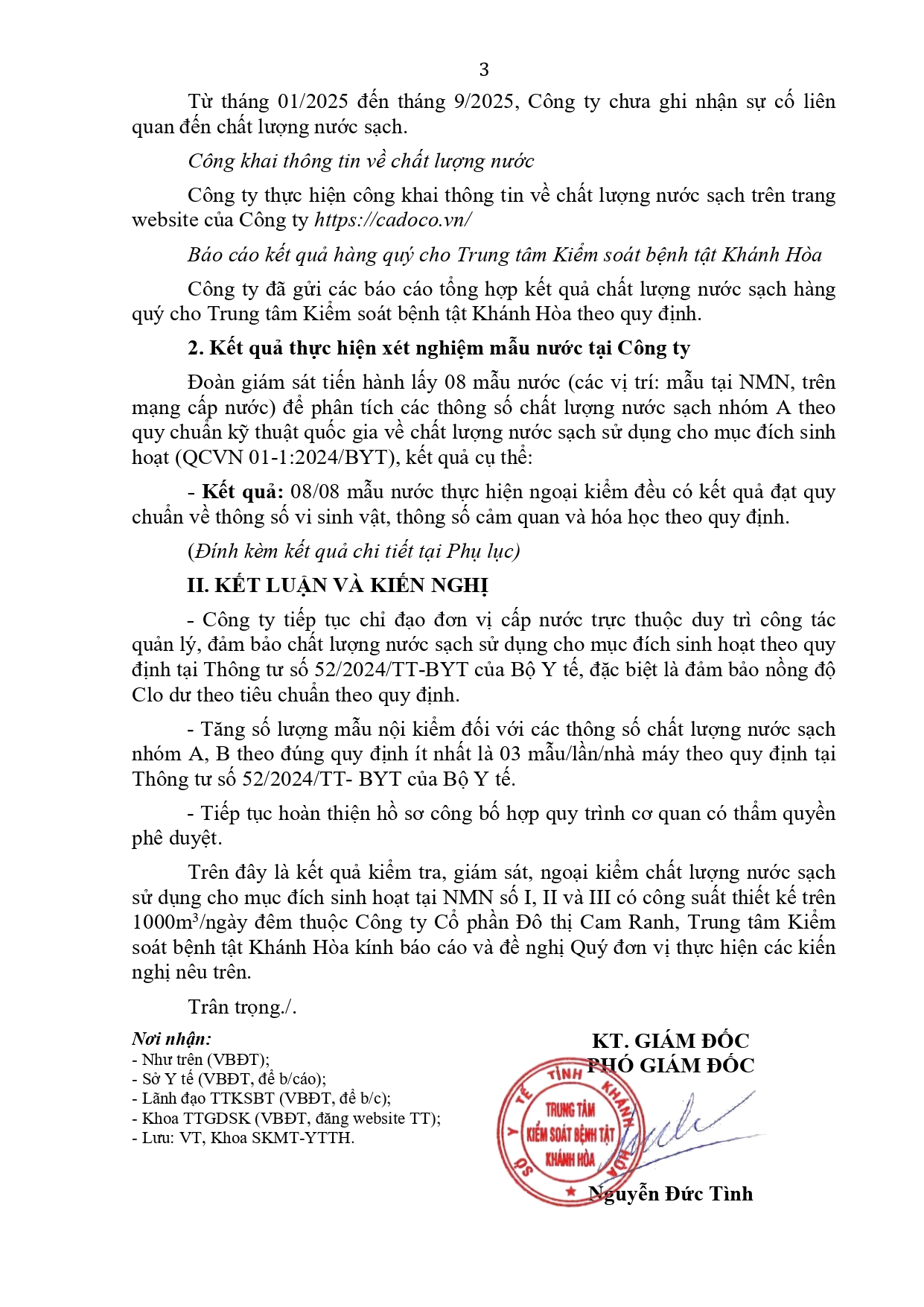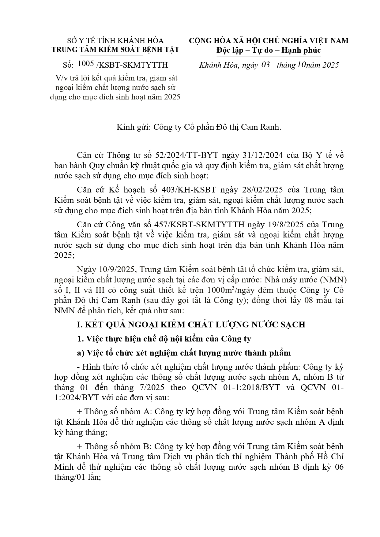 V/v trả lời kết quả kiểm tra, giám sát ngoại kiểm chất lượng nước sạch sử dụng cho mục đích sinh hoạt năm 2025