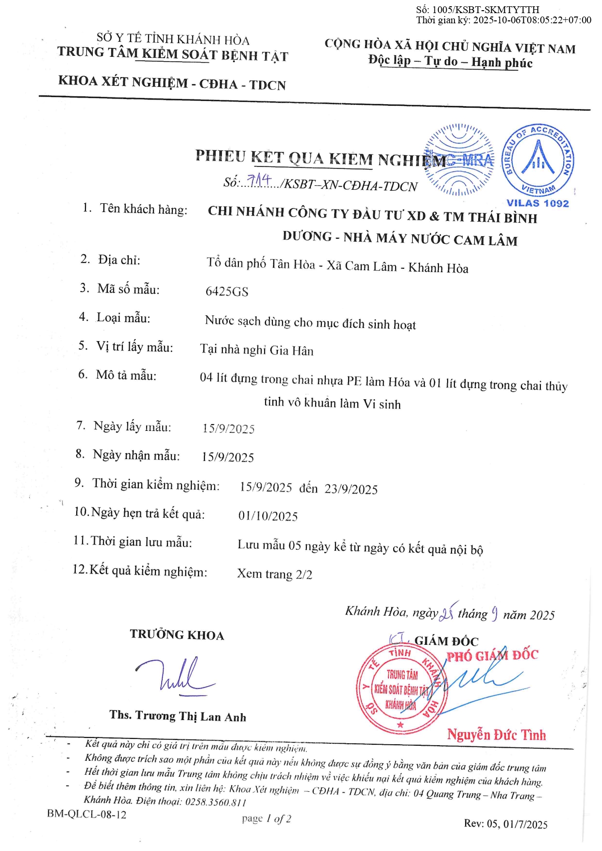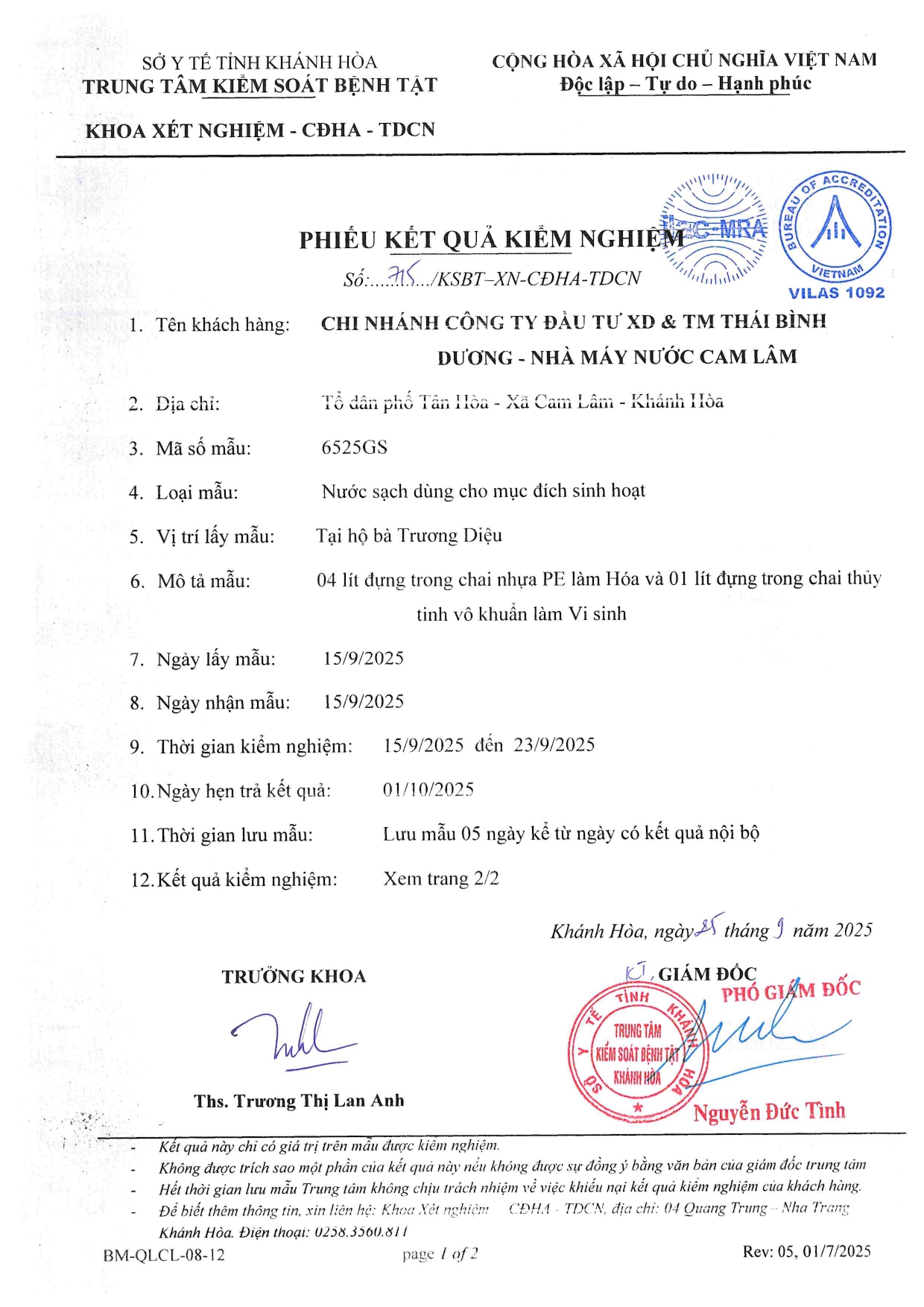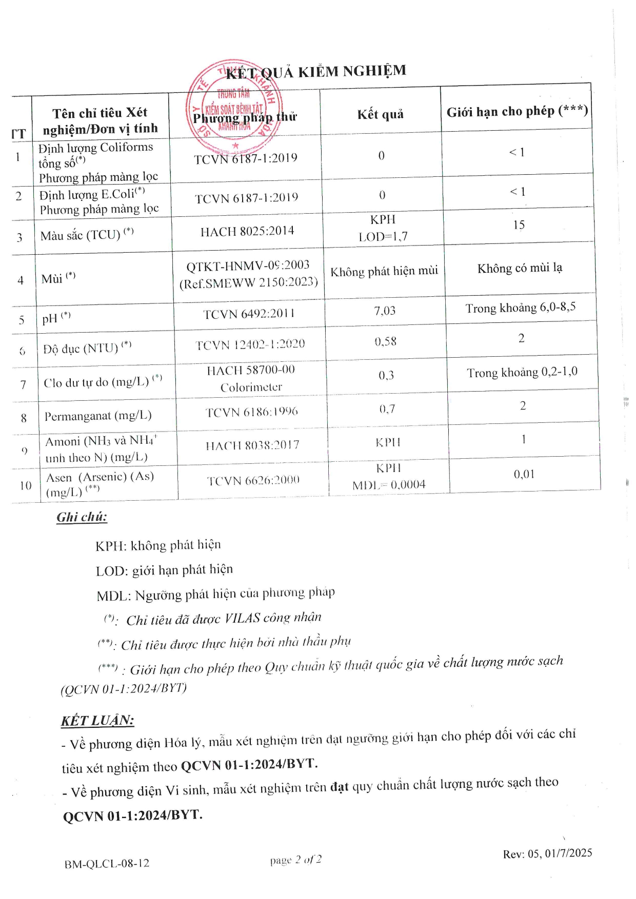 V/v trả lời kết quả kiểm tra, giám sát ngoại kiểm chất lượng nước sạch sử dụng cho mục đích sinh hoạt năm 2025