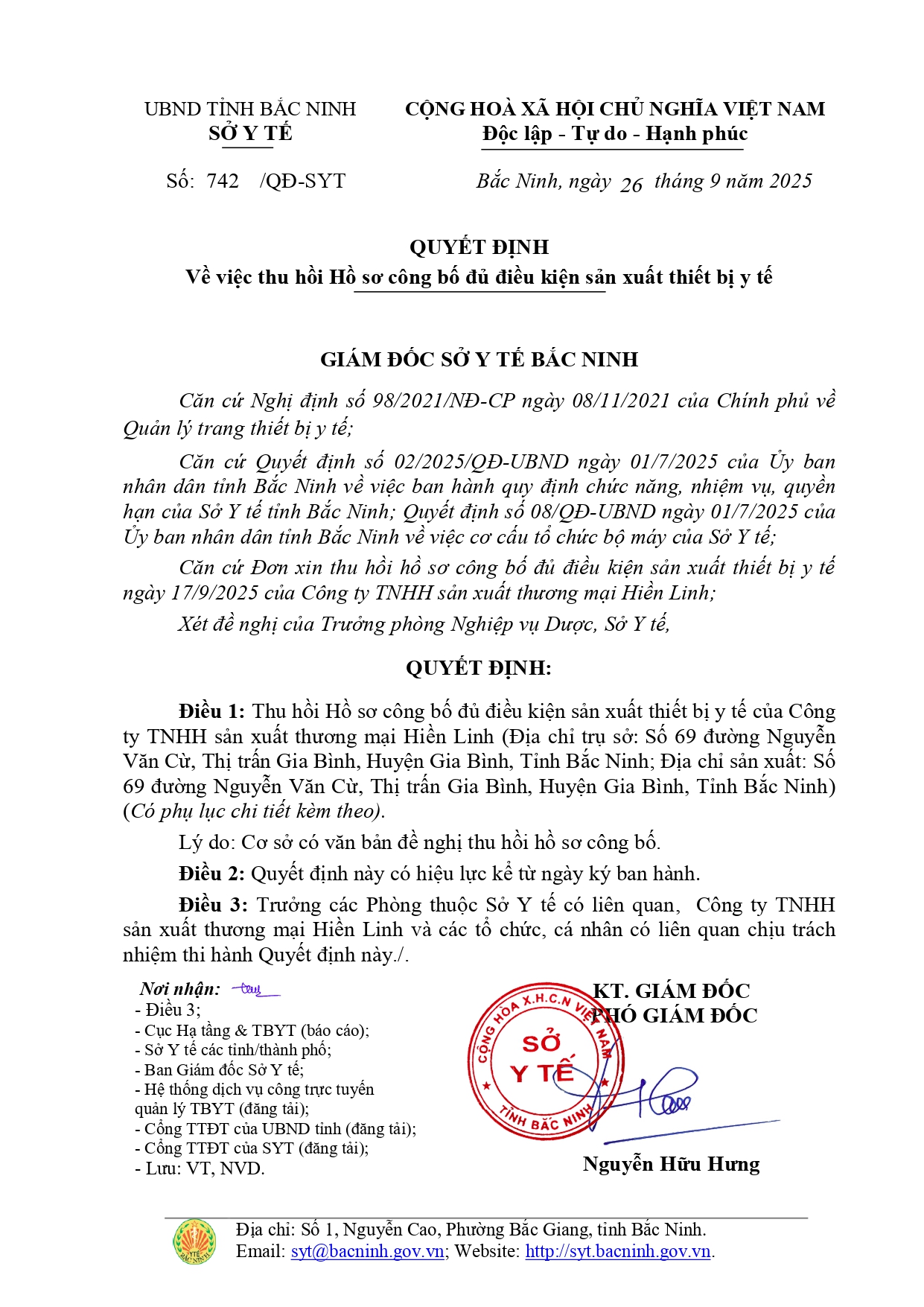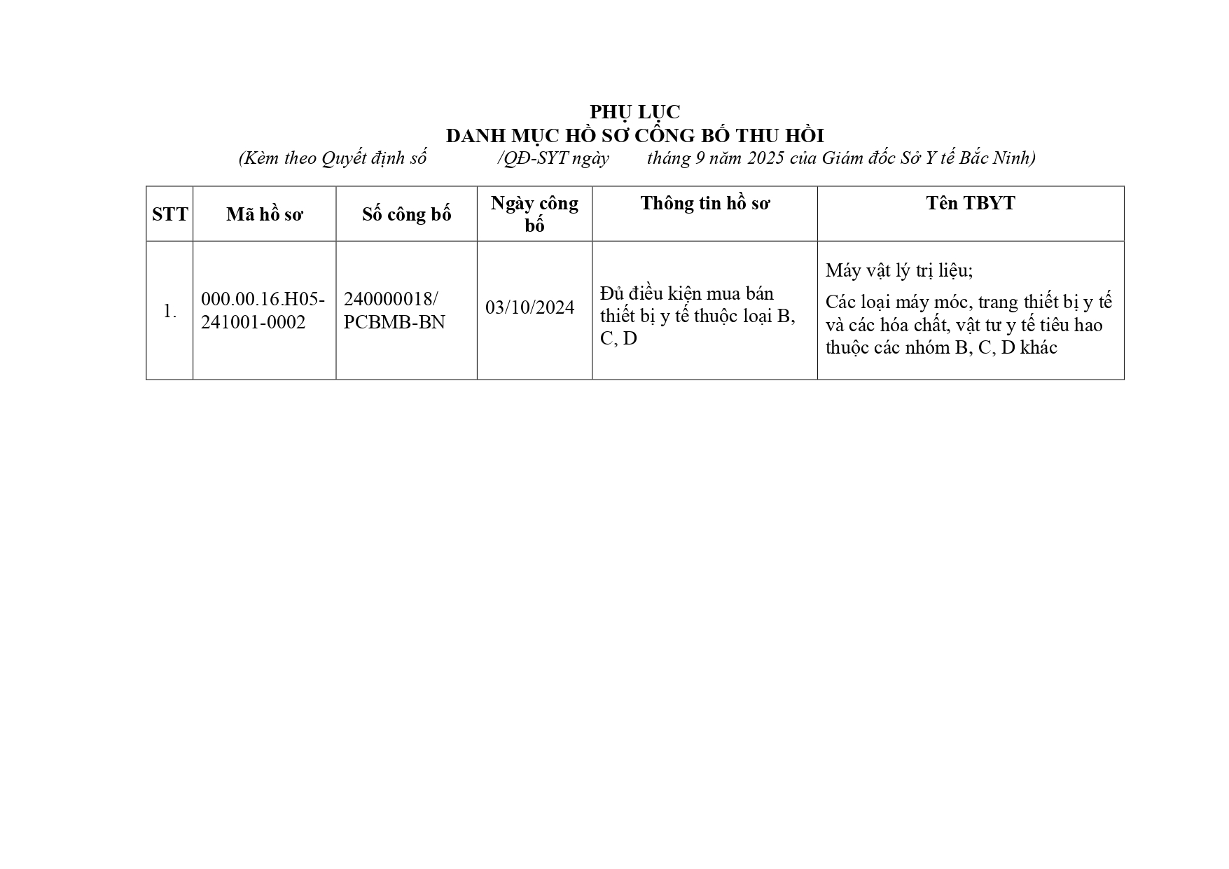 V/v thu hồi số công bố đối với thiết bị y tế thuộc thẩm quyền của các Sở Y tế tỉnh, thành phố