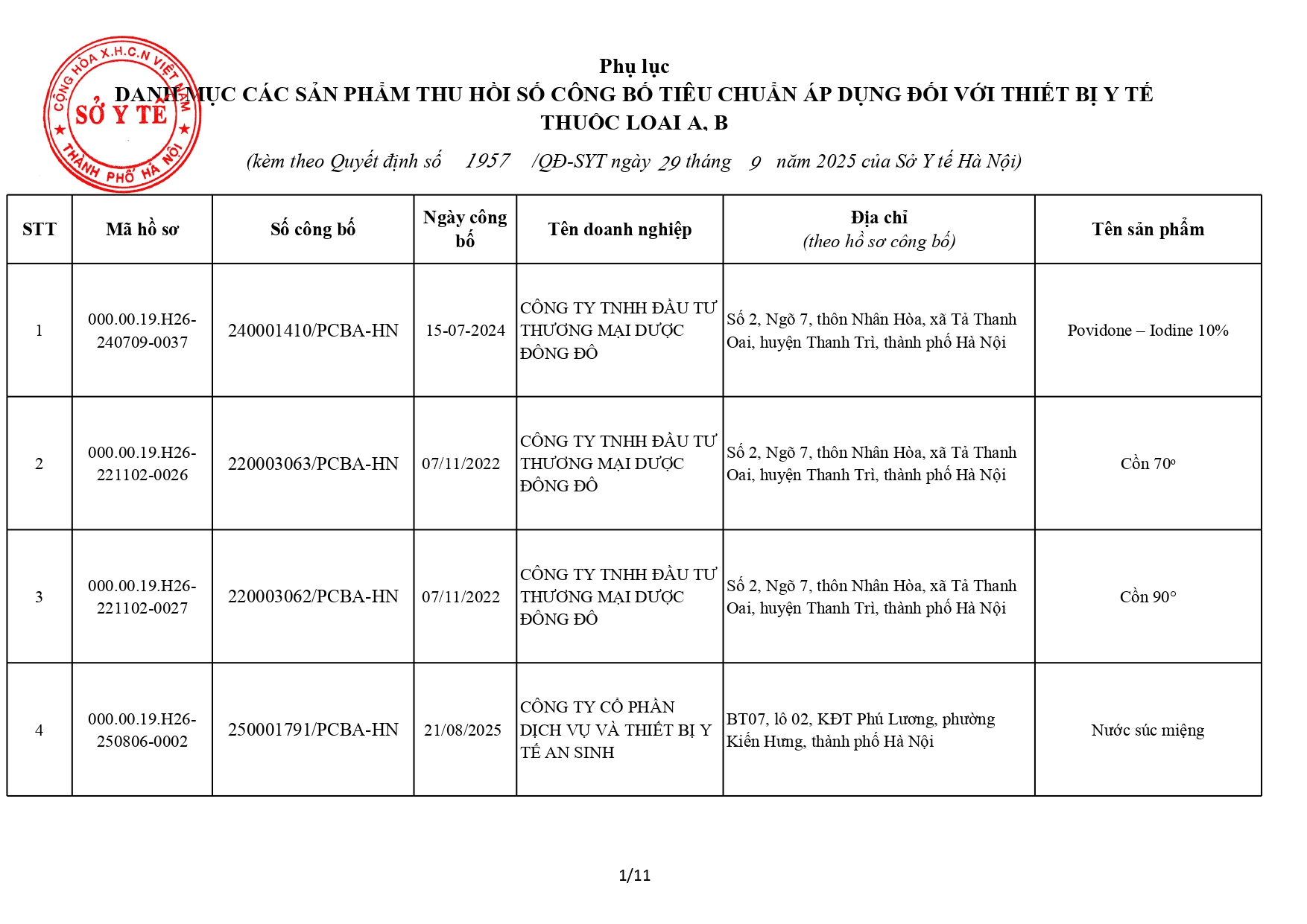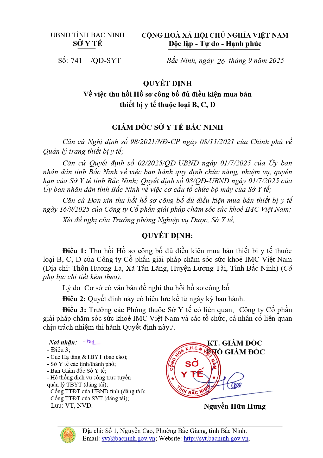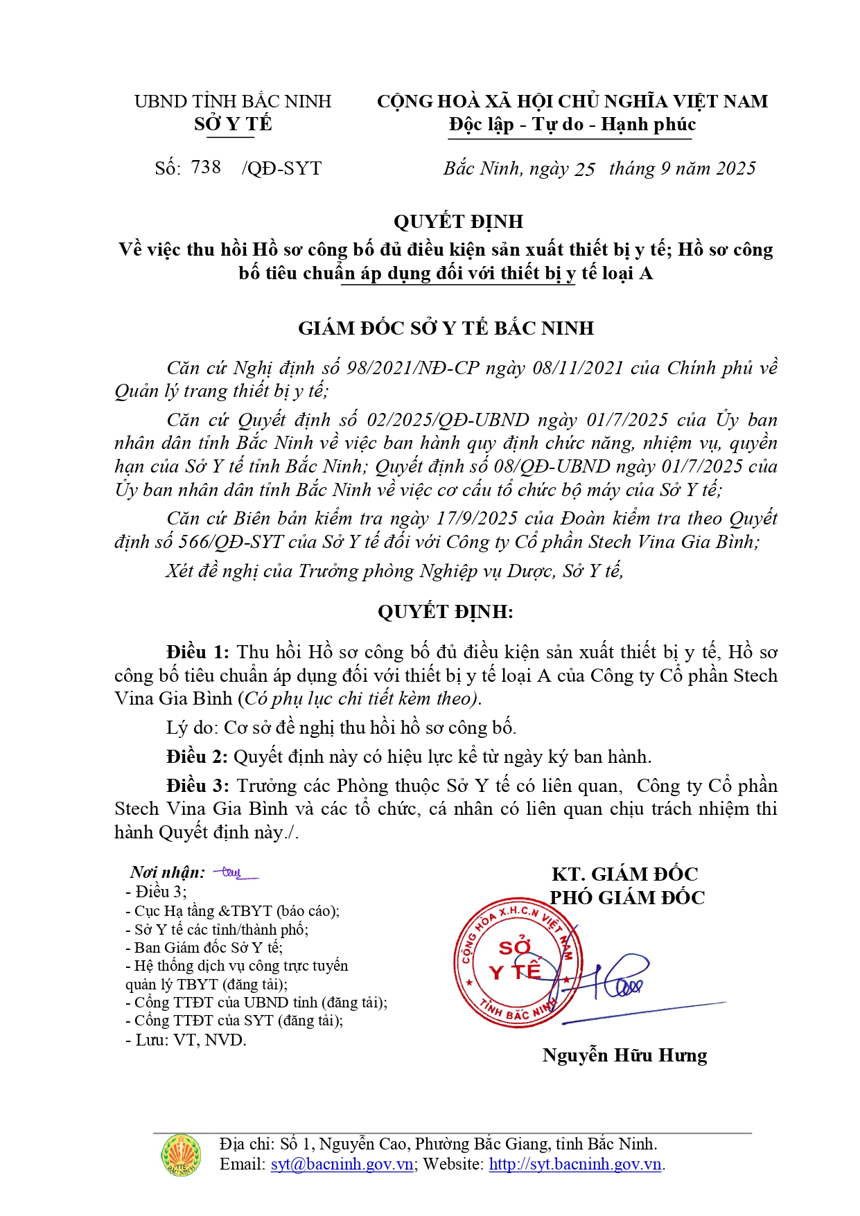 Quyết định Về việc thu hồi số công bố tiêu chuẩn áp dụng của thiết bị y tế thuộc loại A, B