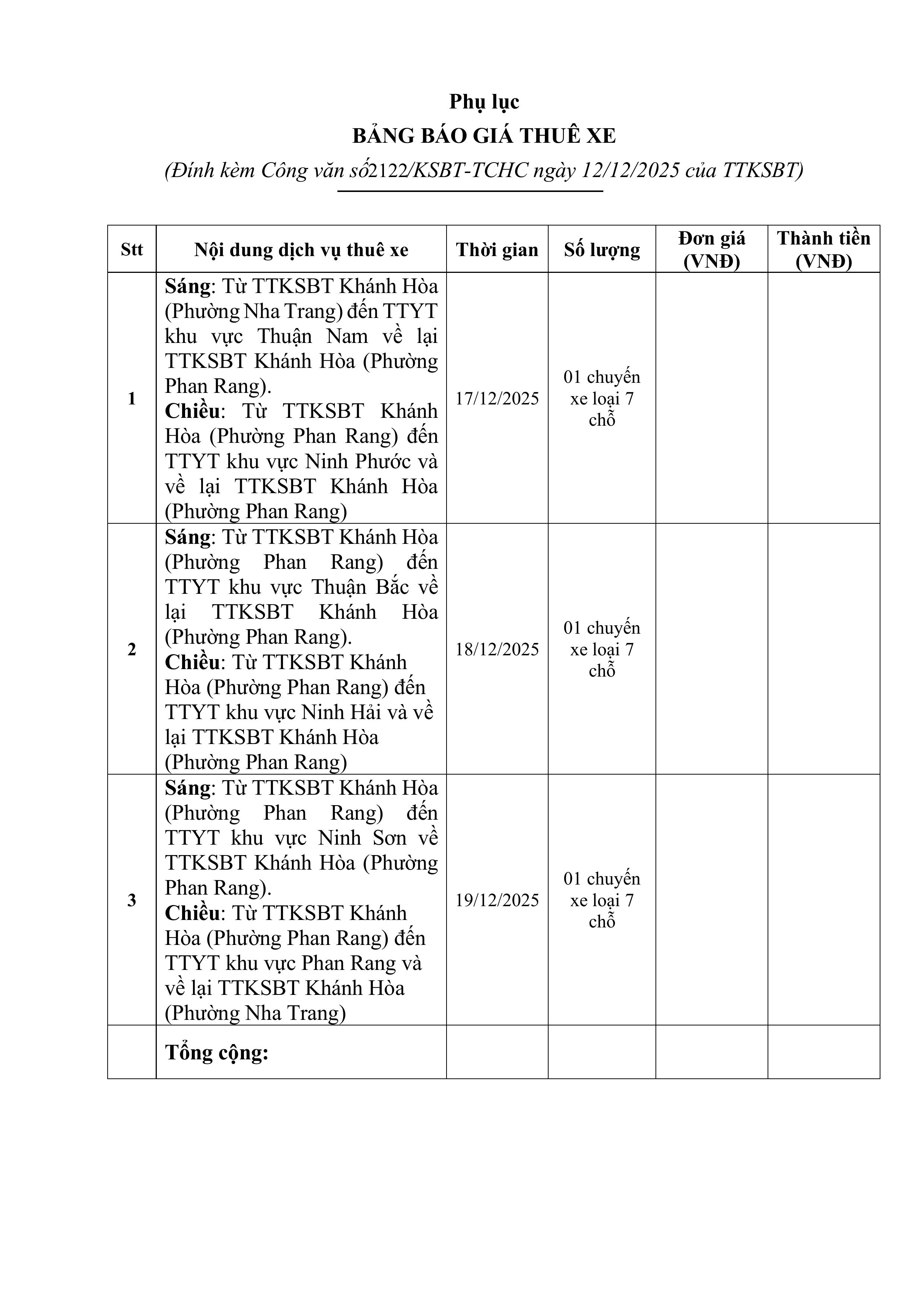 V/v mời chào giá thuê xe vận chuyển viên chức, người lao động đi công tác các huyện, thị xã, thành phố tỉnh Khánh Hòa