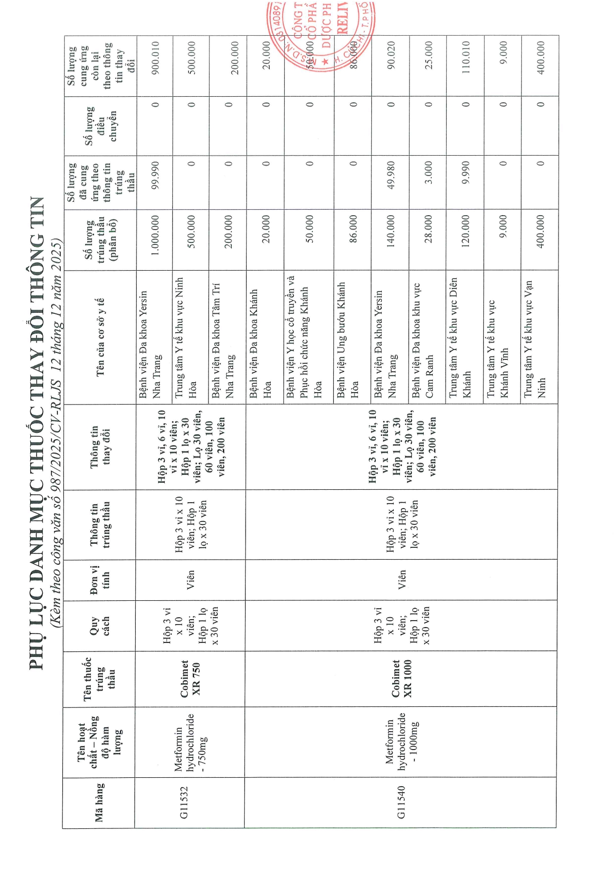 Quyết định Về việc điều chỉnh một số nội dung của Quyết định số 754/QĐ-SYT ngày 15/10/2025 của Sở Y tế về việc phê duyệt kết quả lựa chọn nhà thầu qua mạng gói số 1: Gói thầu thuốc Generic thuộc kế hoạch lựa chọn nhà thầu cung cấp thuốc: Mua sắm tập trung thuốc cấp địa phương tỉnh Khánh Hòa năm 2025-2027 (lần 2)