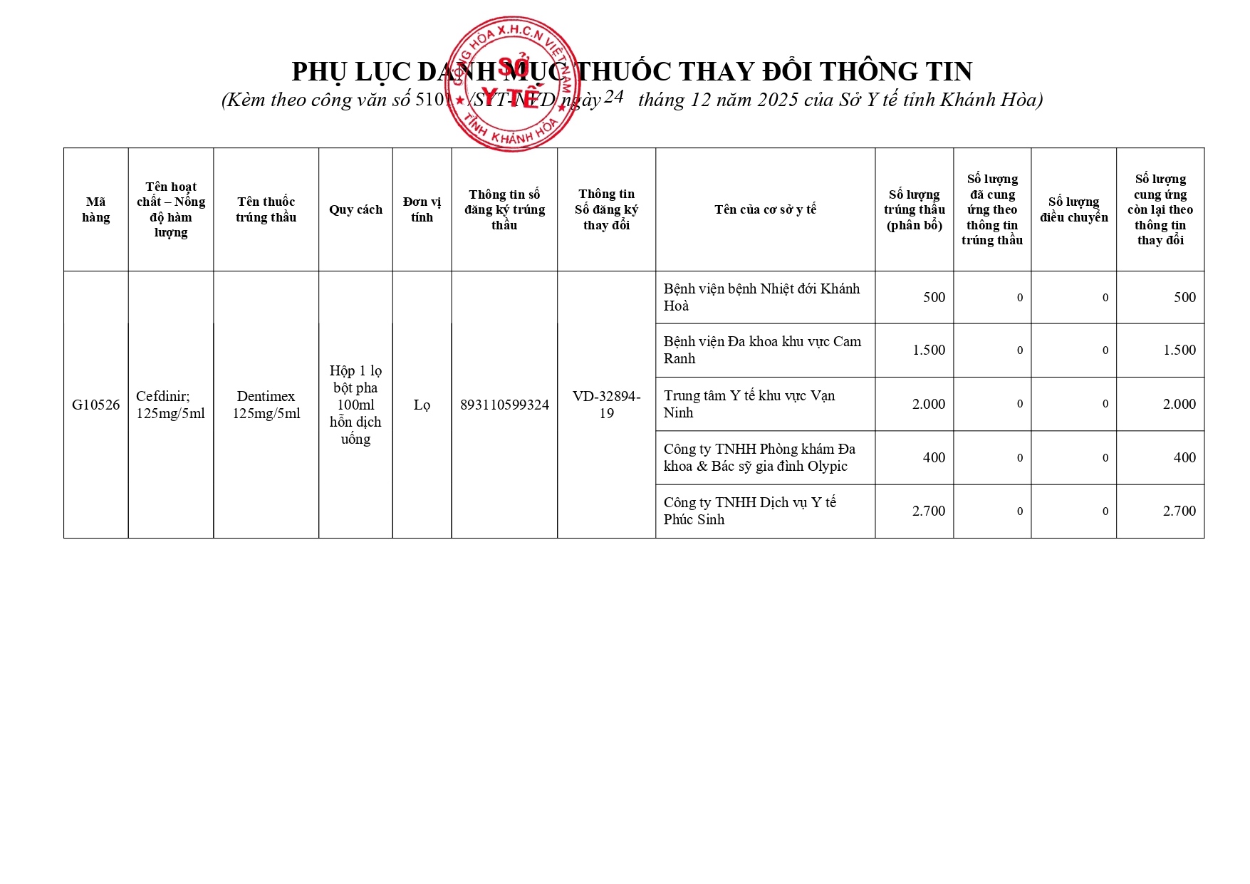 Quyết định Về việc điều chỉnh một số nội dung của Quyết định số 754/QĐ-SYT ngày 15/10/2025 của Sở Y tế về việc phê duyệt kết quả lựa chọn nhà thầu qua mạng gói số 1: Gói thầu thuốc Generic thuộc kế hoạch lựa chọn nhà thầu cung cấp thuốc: Mua sắm tập trung thuốc cấp địa phương tỉnh Khánh Hòa năm 2025-2027 (lần 2)