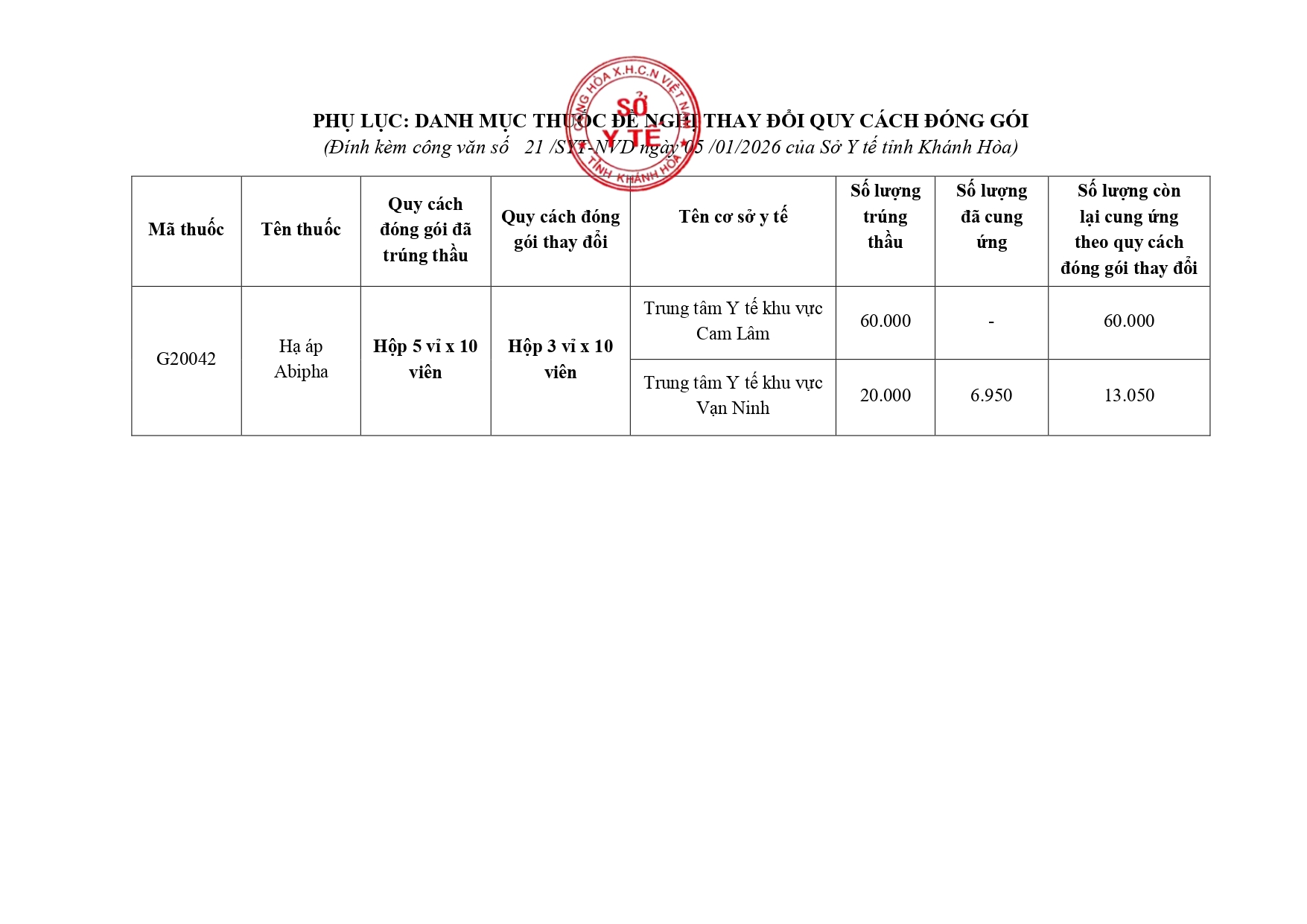 Quyết định Về việc điều chỉnh một số nội dung của Quyết định số 754/QĐ-SYT ngày 15/10/2025 của Sở Y tế về việc phê duyệt kết quả lựa chọn nhà thầu qua mạng gói số 1: Gói thầu thuốc Generic thuộc kế hoạch lựa chọn nhà thầu cung cấp thuốc: Mua sắm tập trung thuốc cấp địa phương tỉnh Khánh Hòa năm 2025-2027