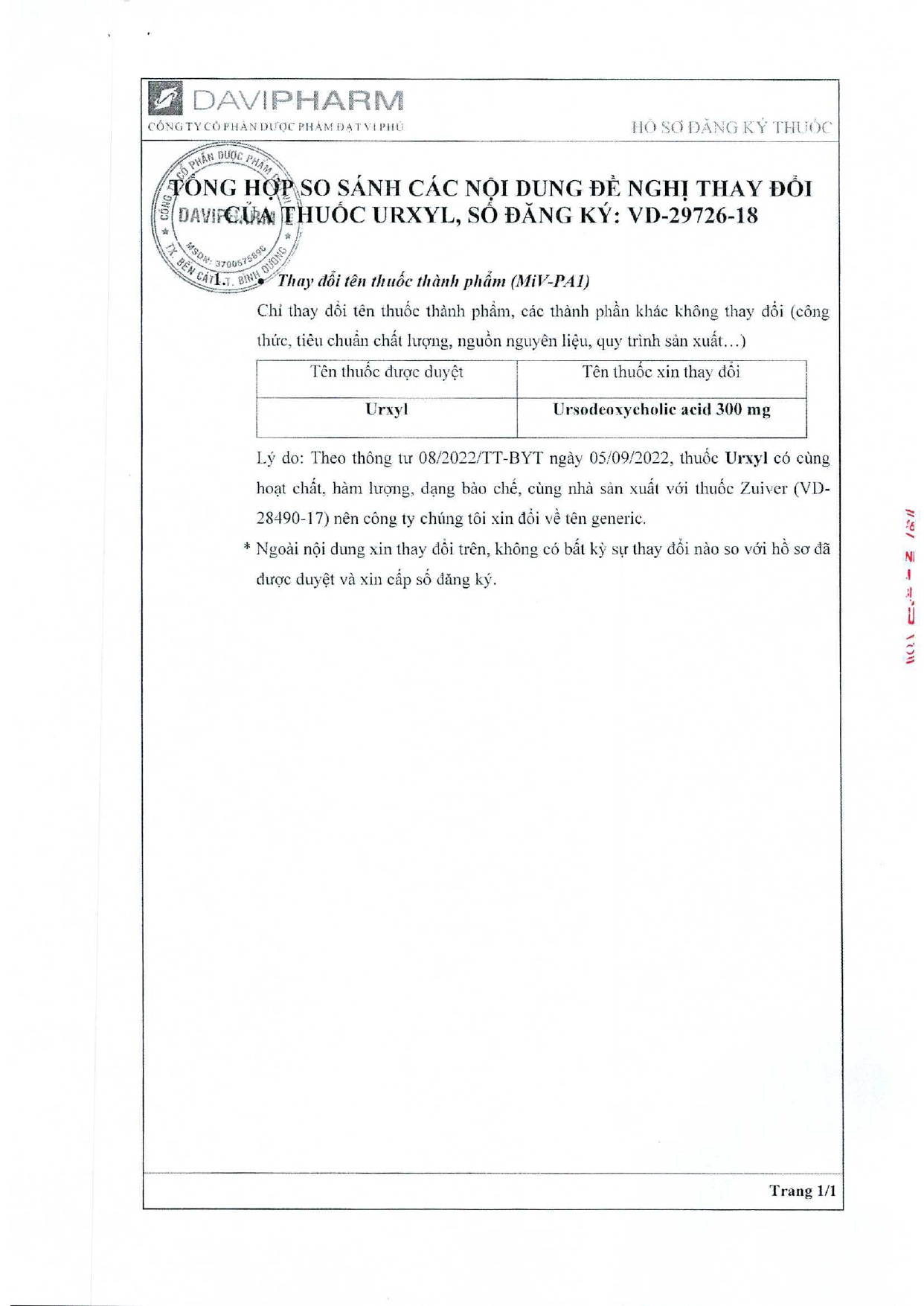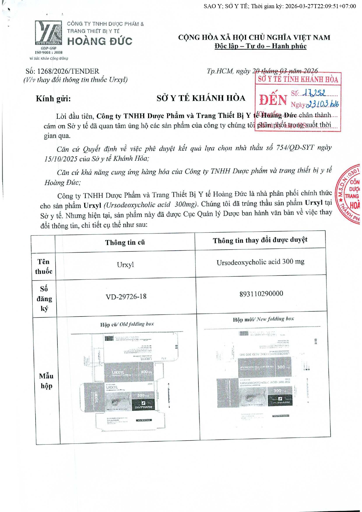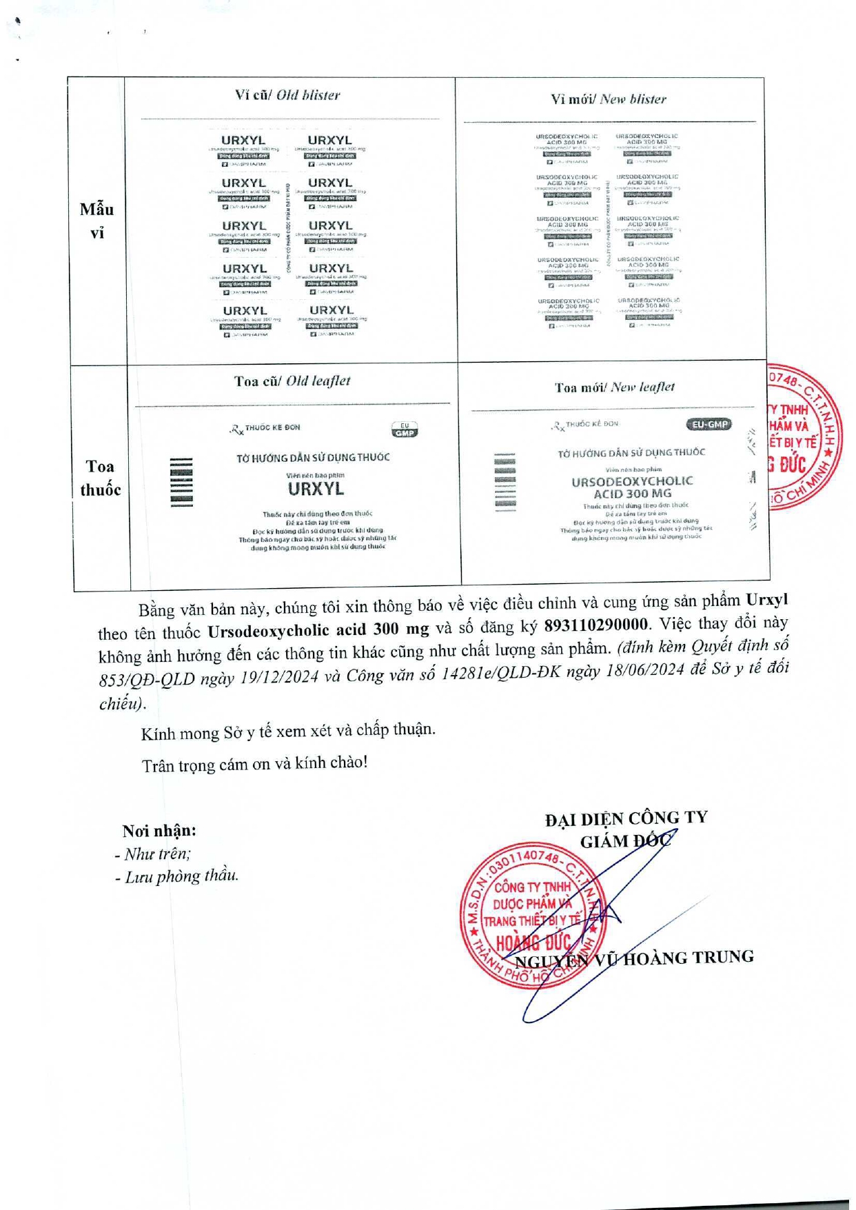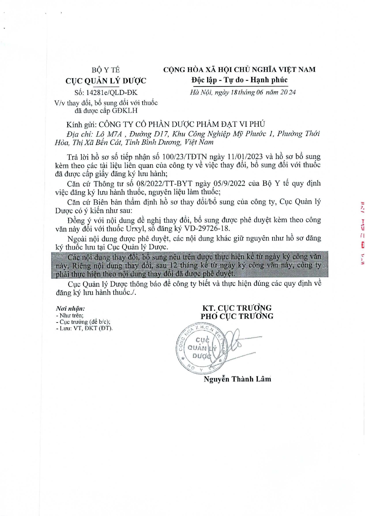 V/v thay đổi tên thuốc, số đăng ký của mặt hàng trúng thầu