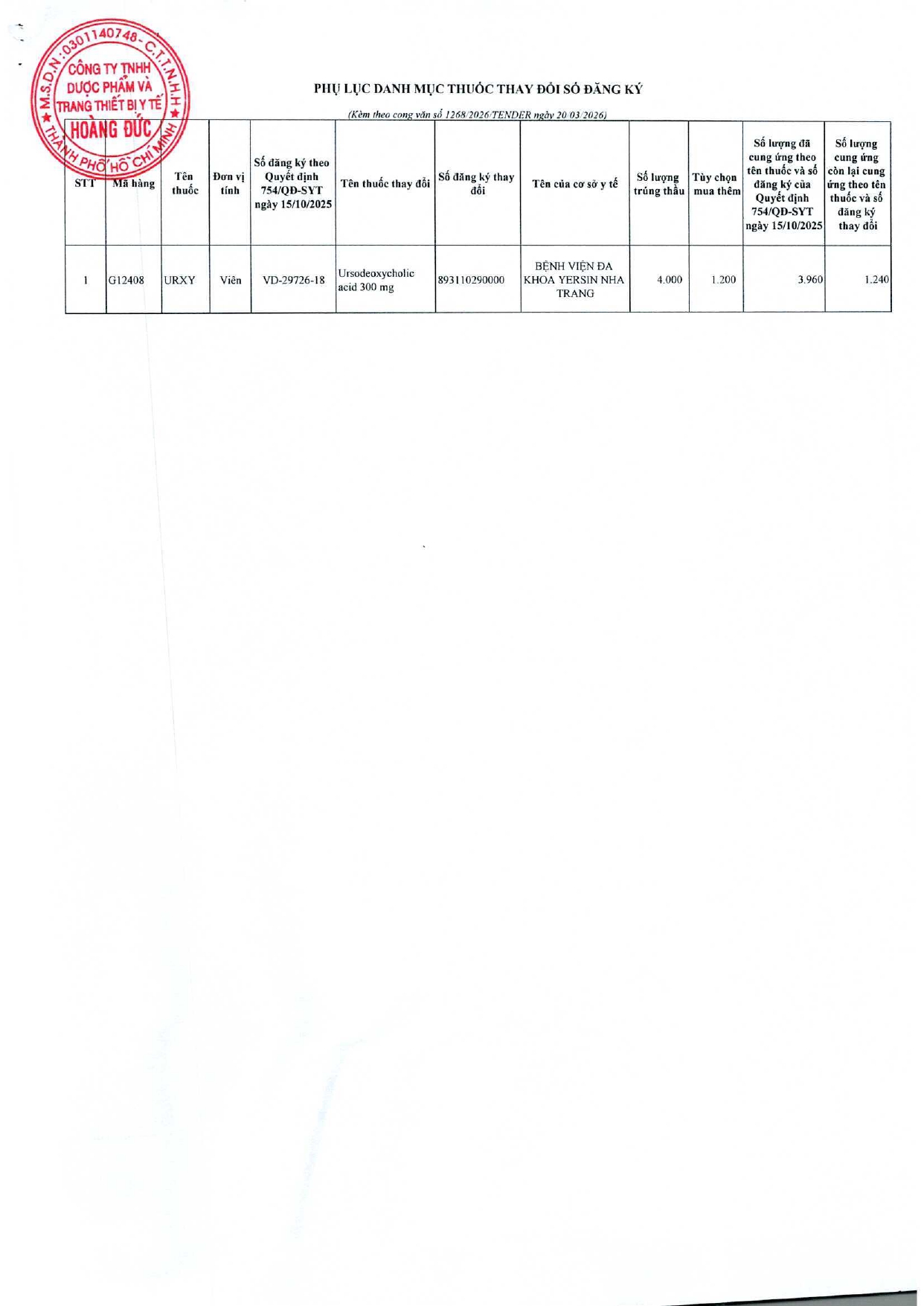 Quyết định Về việc điều chỉnh một số nội dung của Quyết định số 754/QĐ-SYT ngày 15/10/2025 của Sở Y tế về việc phê duyệt kết quả lựa chọn nhà thầu qua mạng gói số 1: Gói thầu thuốc Generic thuộc kế hoạch lựa chọn nhà thầu cung cấp thuốc: Mua sắm tập trung thuốc cấp địa phương tỉnh Khánh Hòa năm 2025-2027