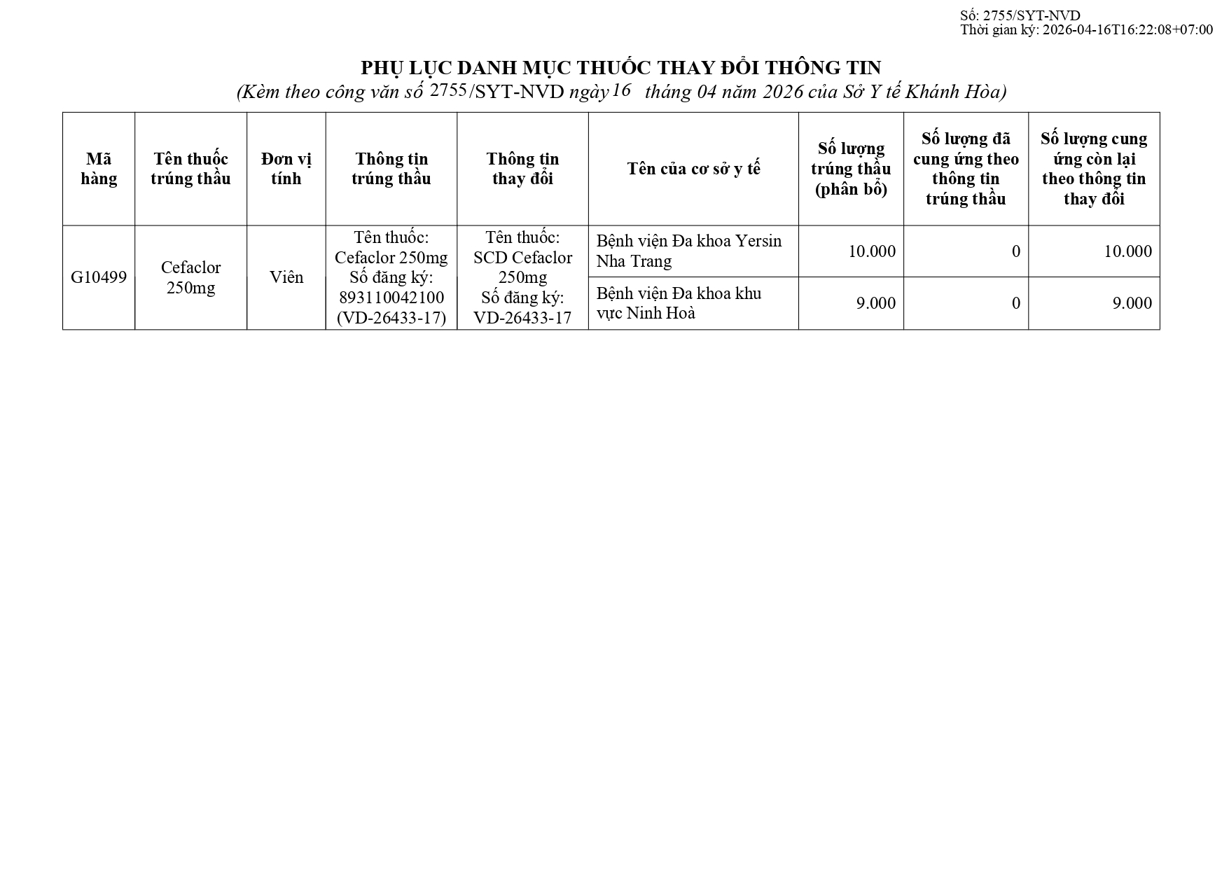 Quyết định Về việc điều chỉnh một số nội dung của Quyết định số 754/QĐ-SYT ngày 15/10/2025 của Sở Y tế về việc phê duyệt kết quả lựa chọn nhà thầu qua mạng gói số 1: Gói thầu thuốc Generic thuộc kế hoạch lựa chọn nhà thầu cung cấp thuốc: Mua sắm tập trung thuốc cấp địa phương tỉnh Khánh Hòa năm 2025-2027