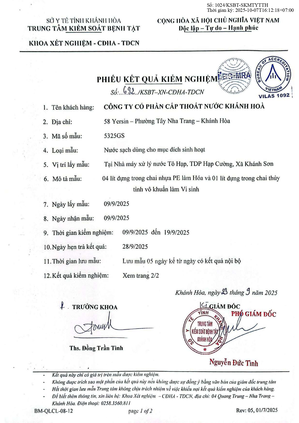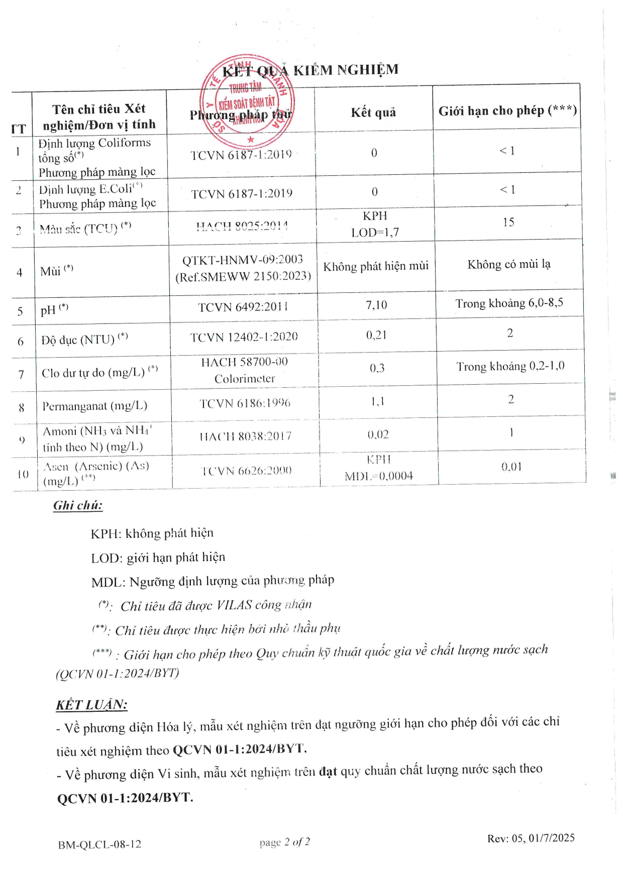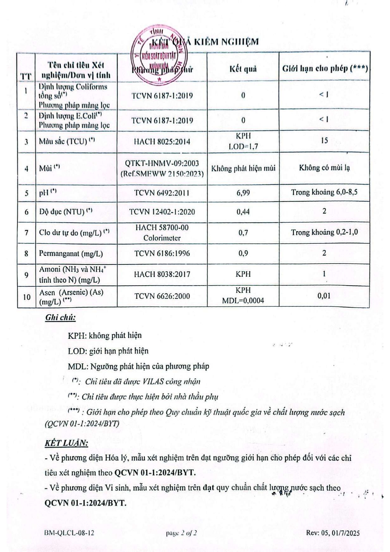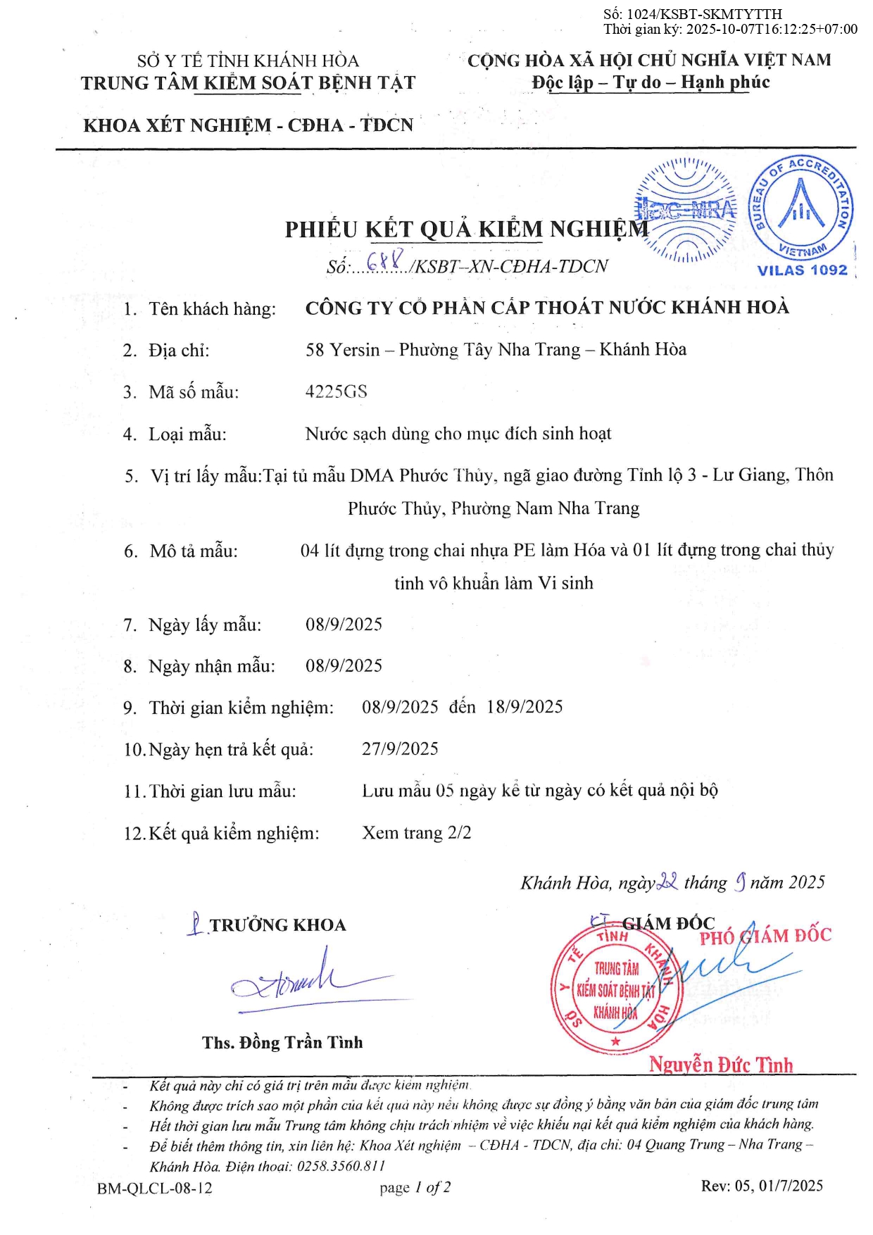 V/v trả lời kết quả kiểm tra, giám sát ngoại kiểm chất lượng nước sạch sử dụng cho mục đích sinh hoạt năm 2025