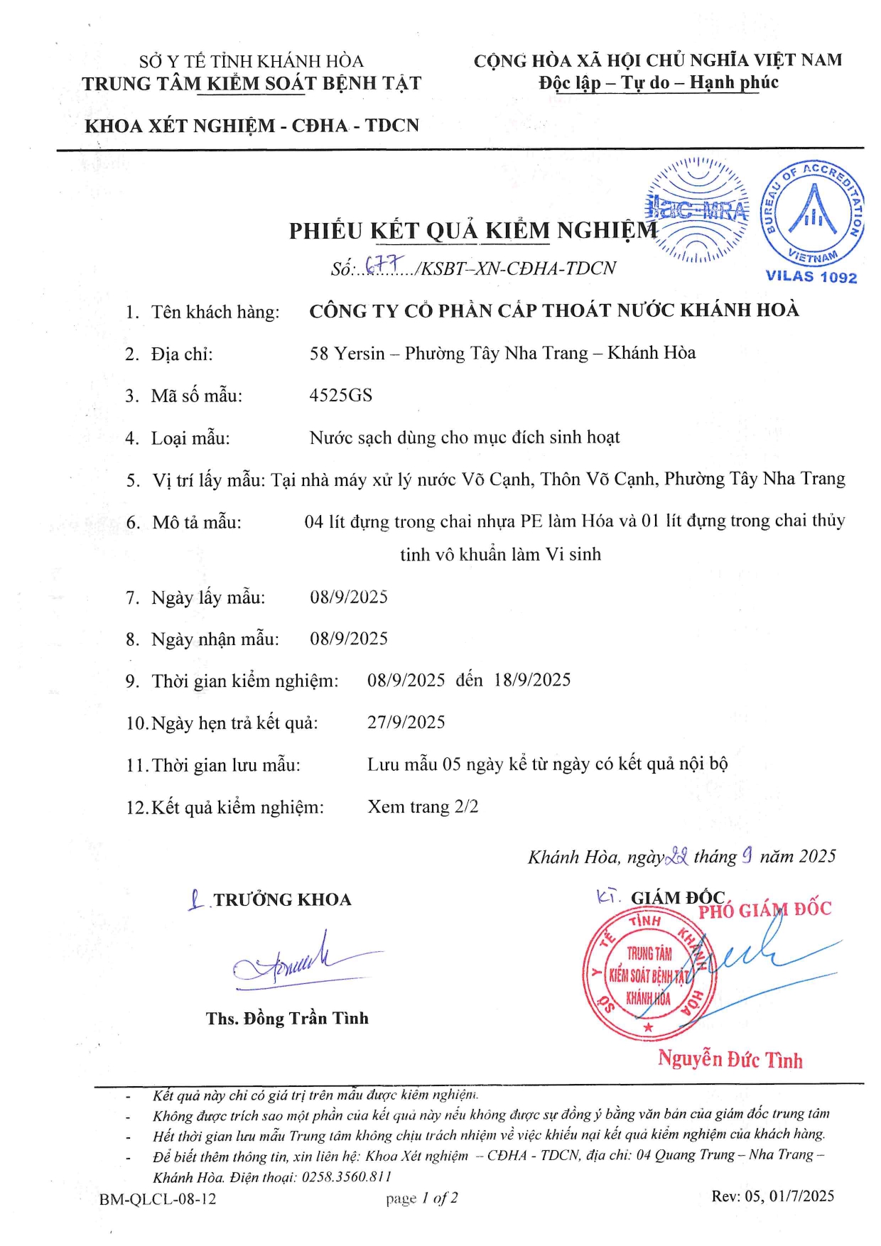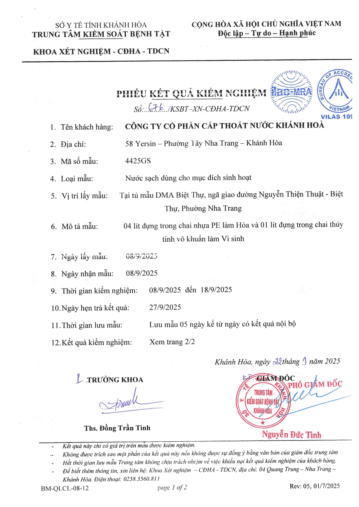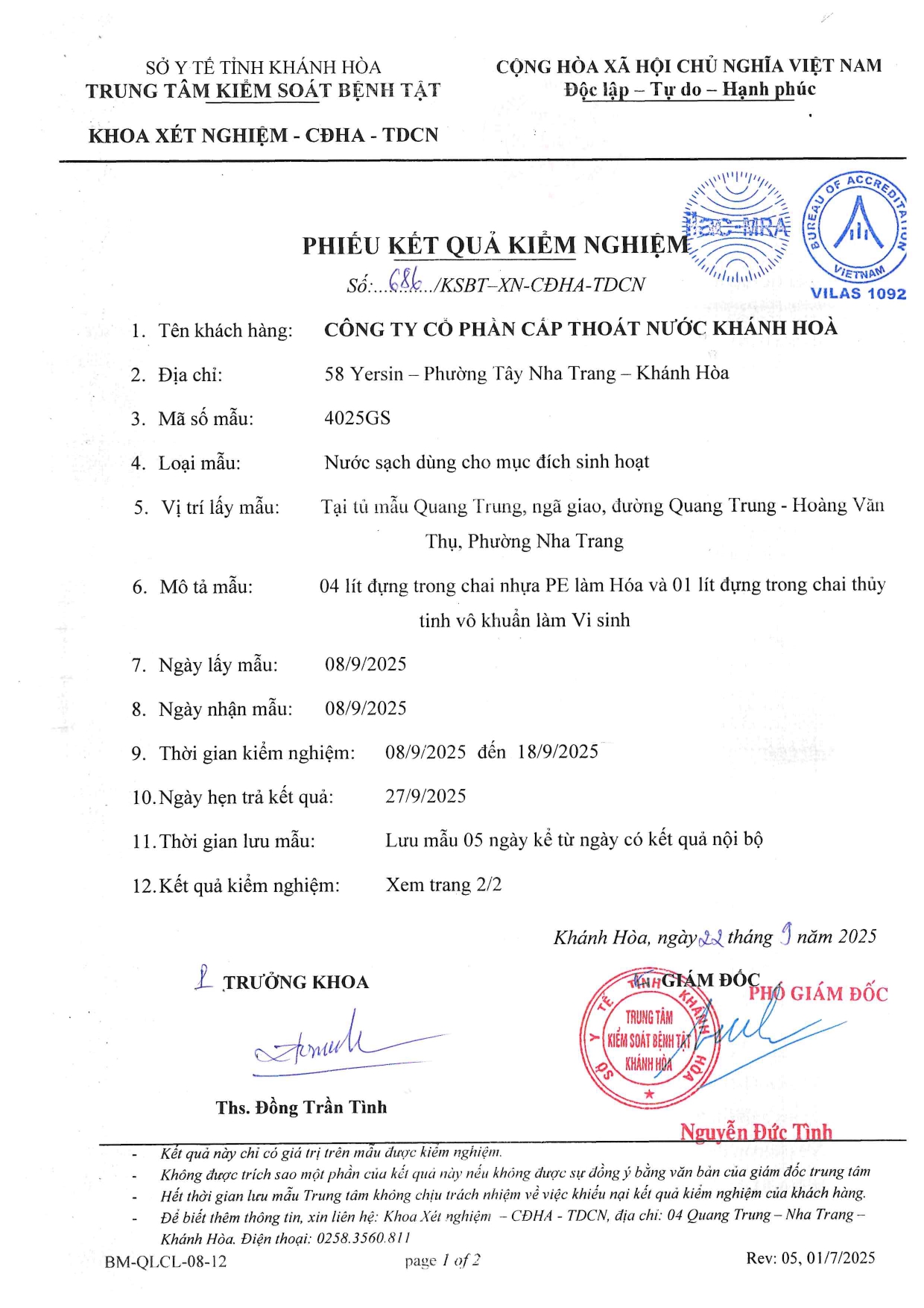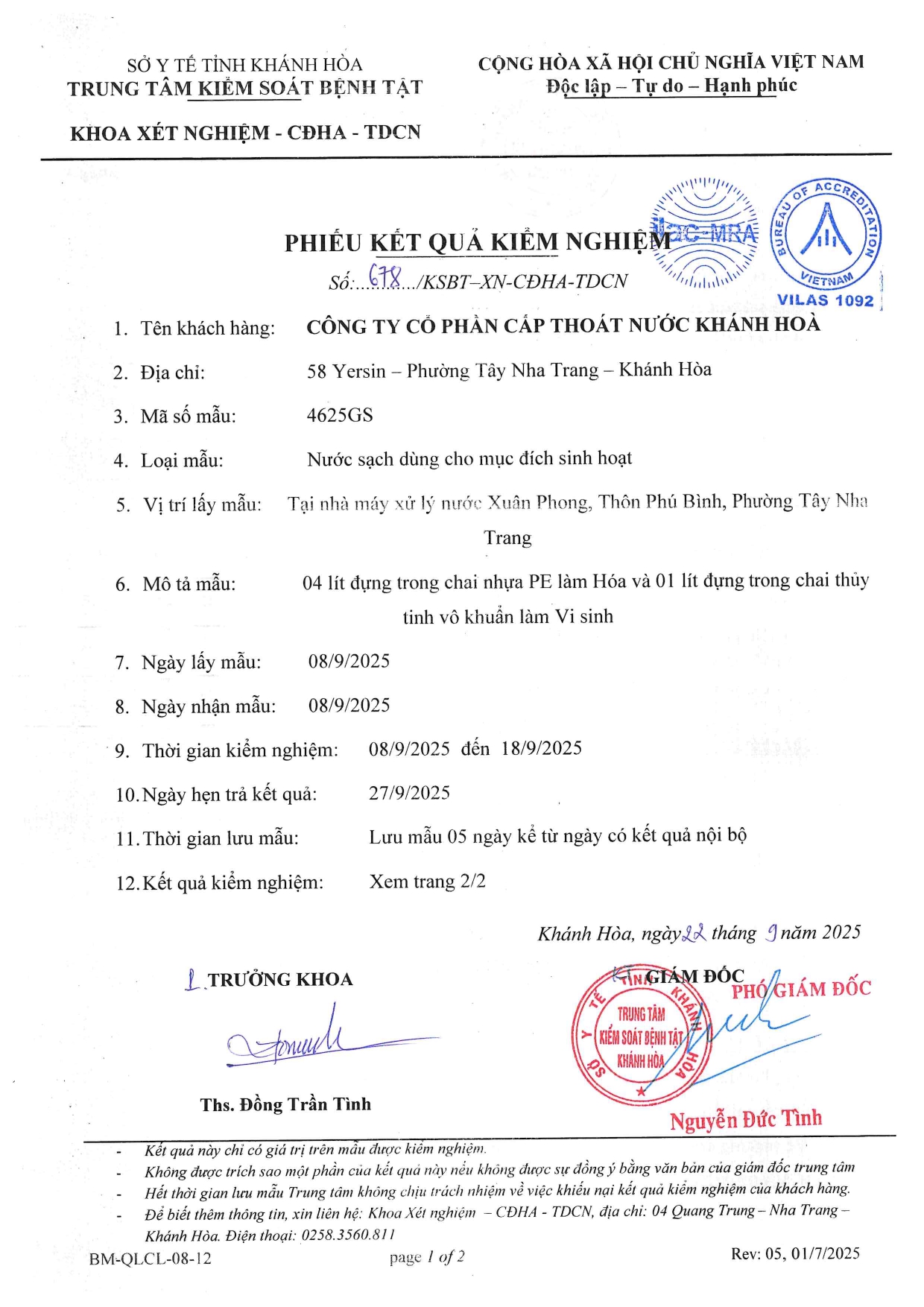 V/v trả lời kết quả kiểm tra, giám sát ngoại kiểm chất lượng nước sạch sử dụng cho mục đích sinh hoạt năm 2025
