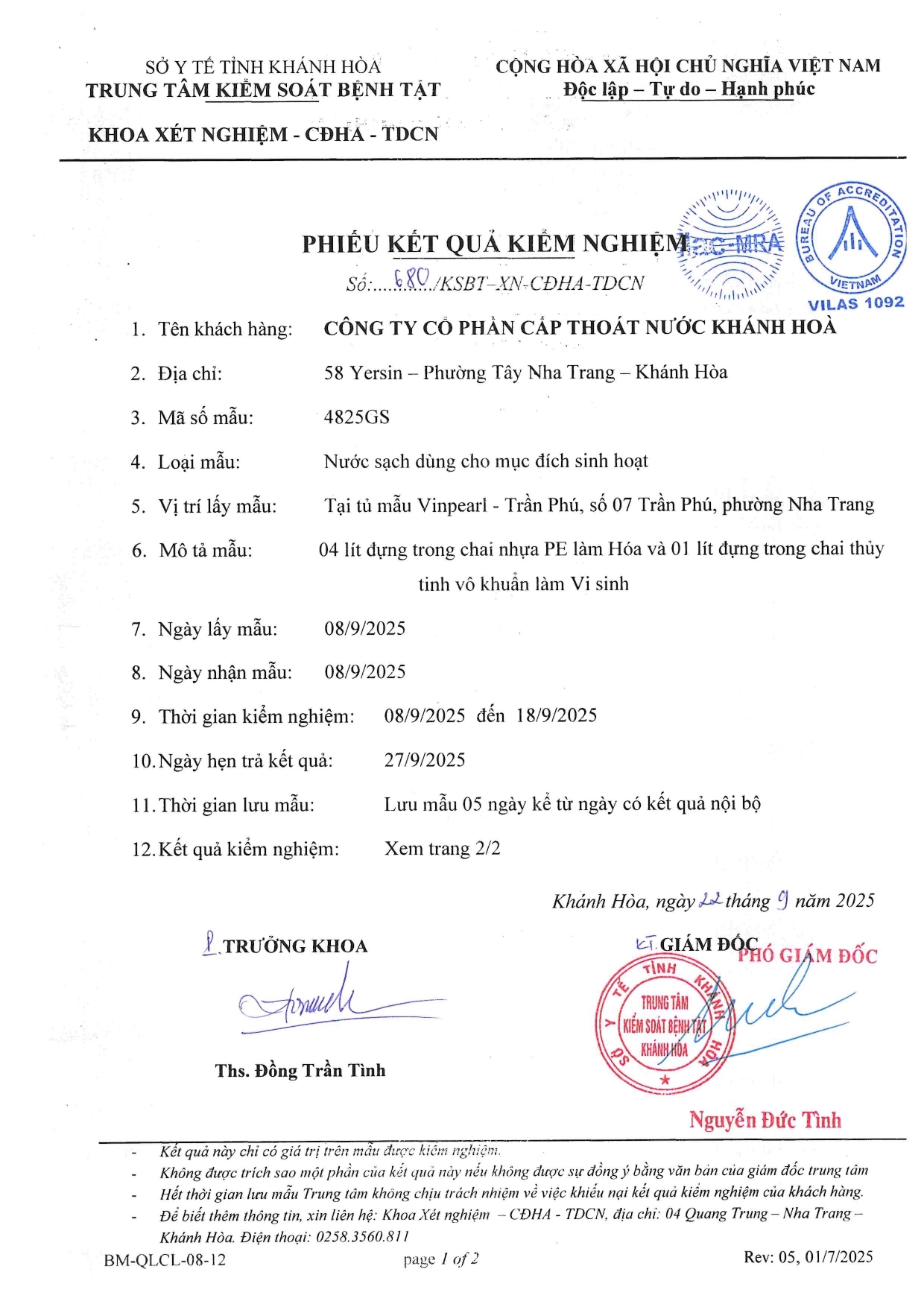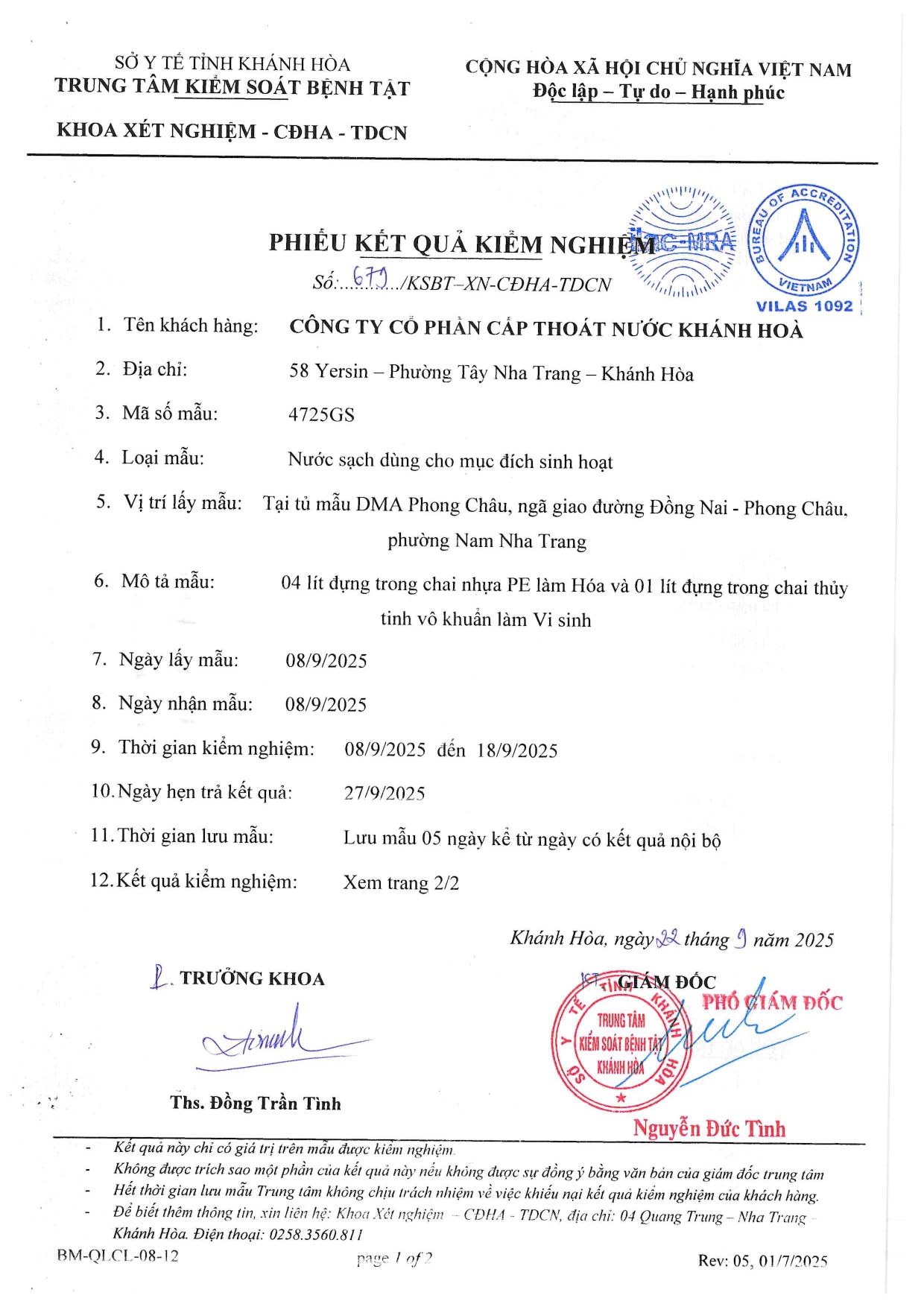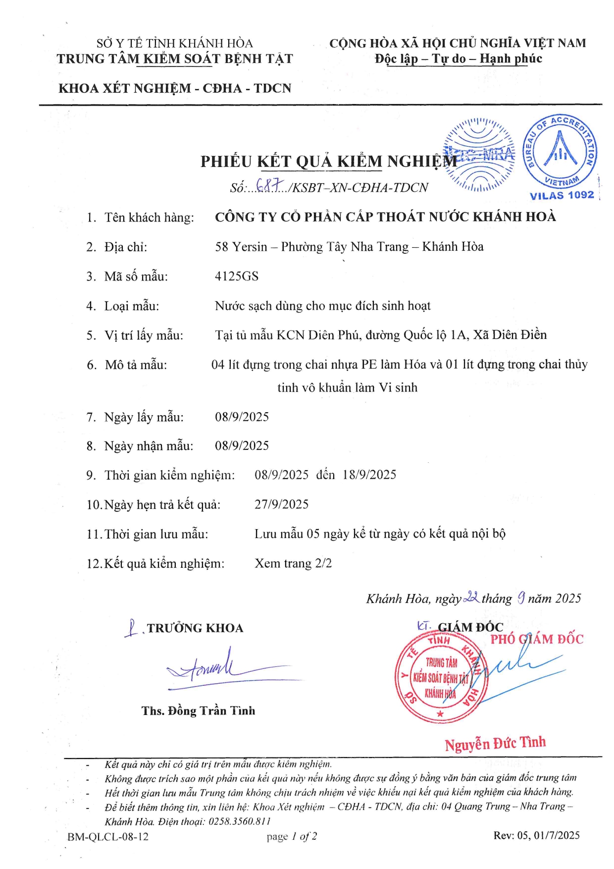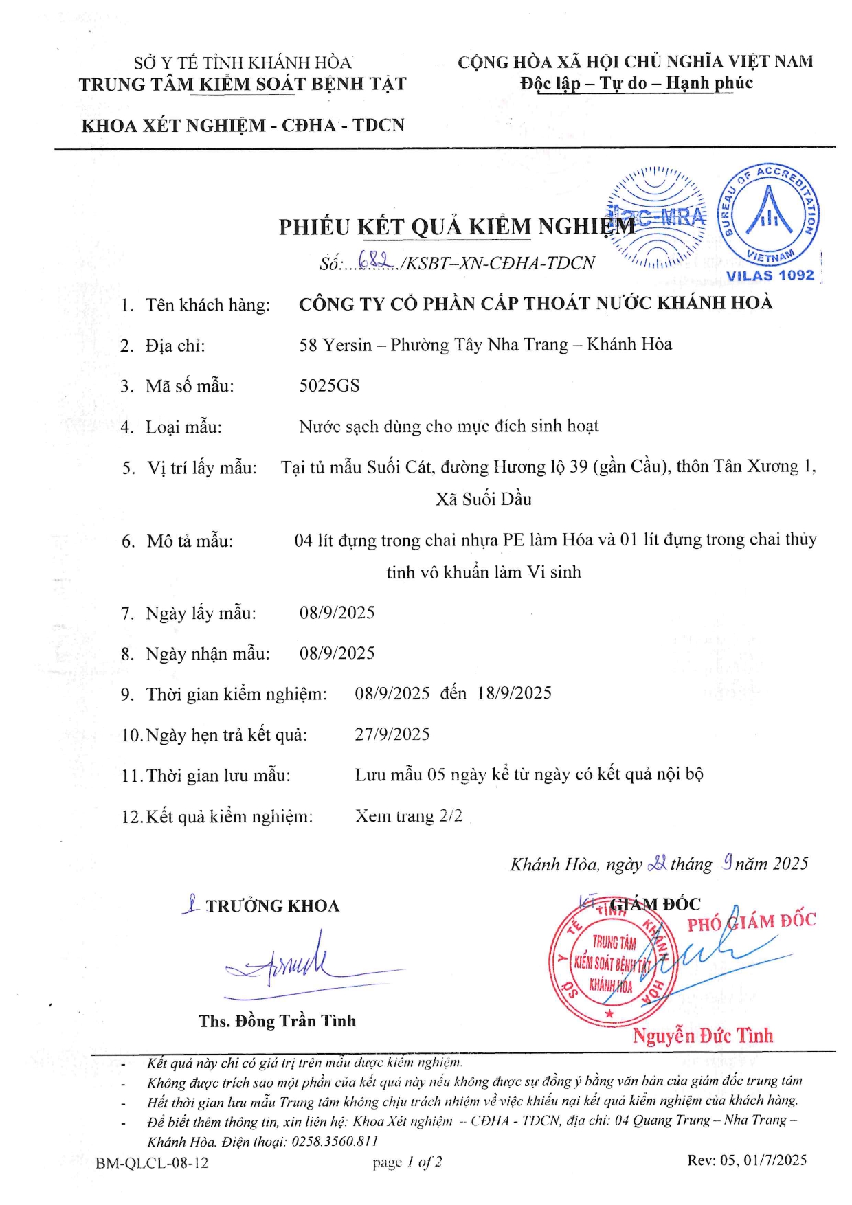V/v trả lời kết quả kiểm tra, giám sát ngoại kiểm chất lượng nước sạch sử dụng cho mục đích sinh hoạt năm 2025
