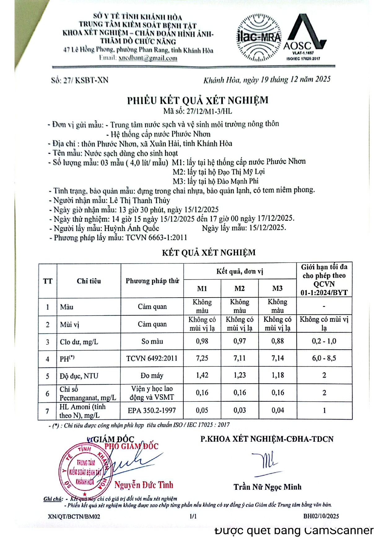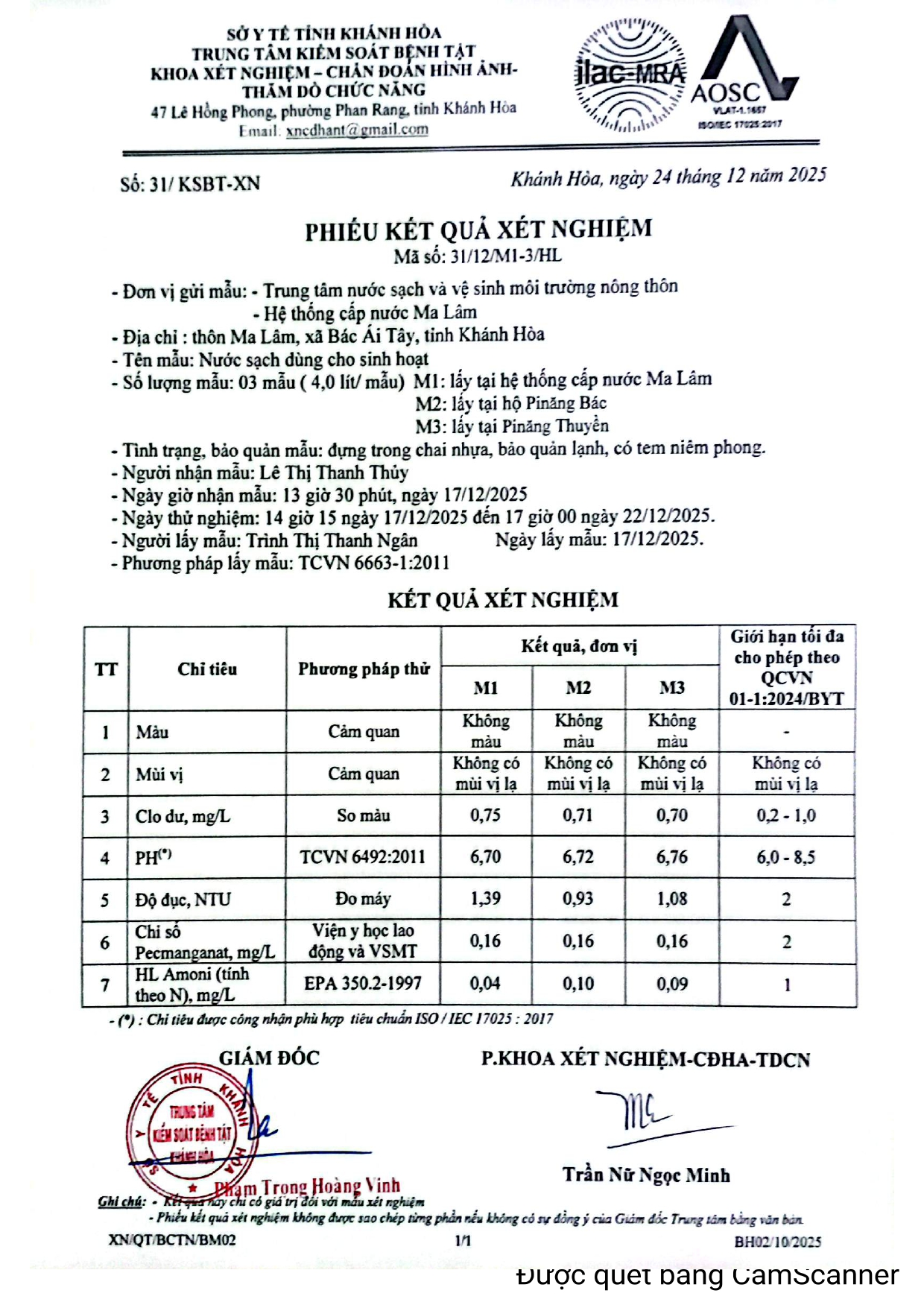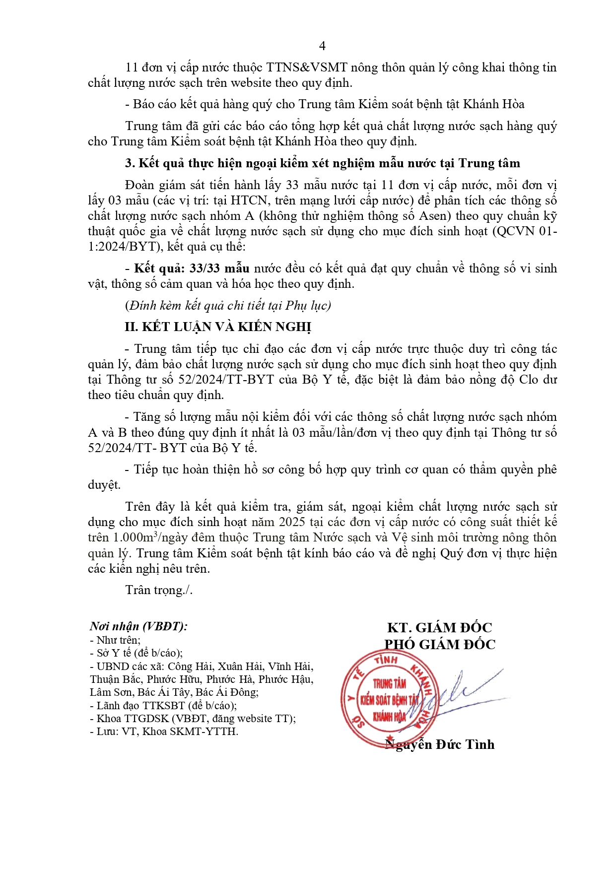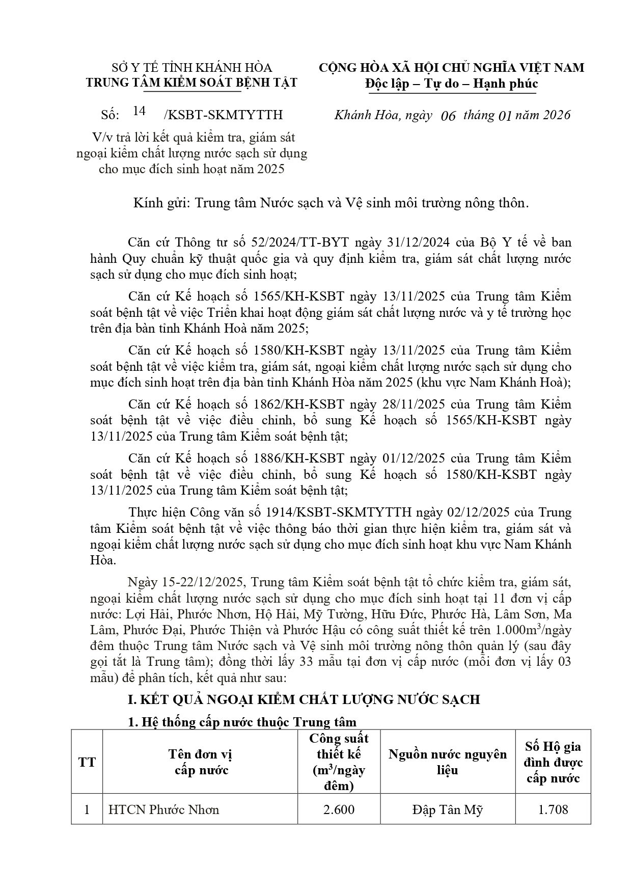 V/v trả lời kết quả kiểm tra, giám sát ngoại kiểm chất lượng nước sạch sử dụng cho mục đích sinh hoạt năm 2025