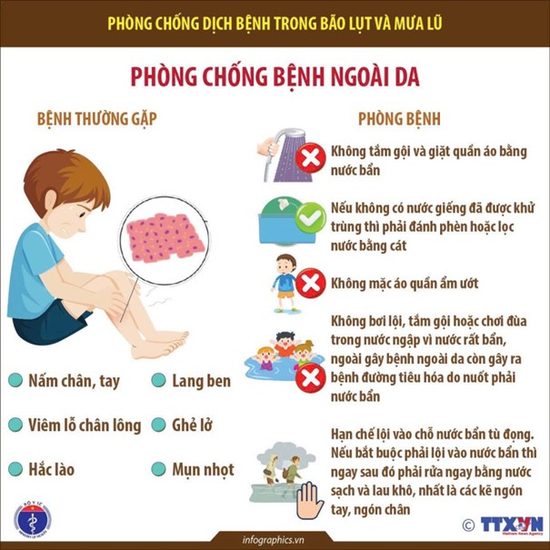 Thời tiết ẩm ướt và nước ngập kéo dài dễ gây ra các bệnh nấm chân, tay và nhiễm khuẩn ngoài da. Sở Y tế lưu ý người dân không tắm gội hay giặt quần áo bằng nước bẩn, không mặc đồ ẩm ướt và tránh tiếp xúc với vùng nước tù đọng. Trong trường hợp buộc phải lội nước, cần rửa sạch và lau khô tay chân ngay sau đó, đặc biệt là các kẽ ngón.