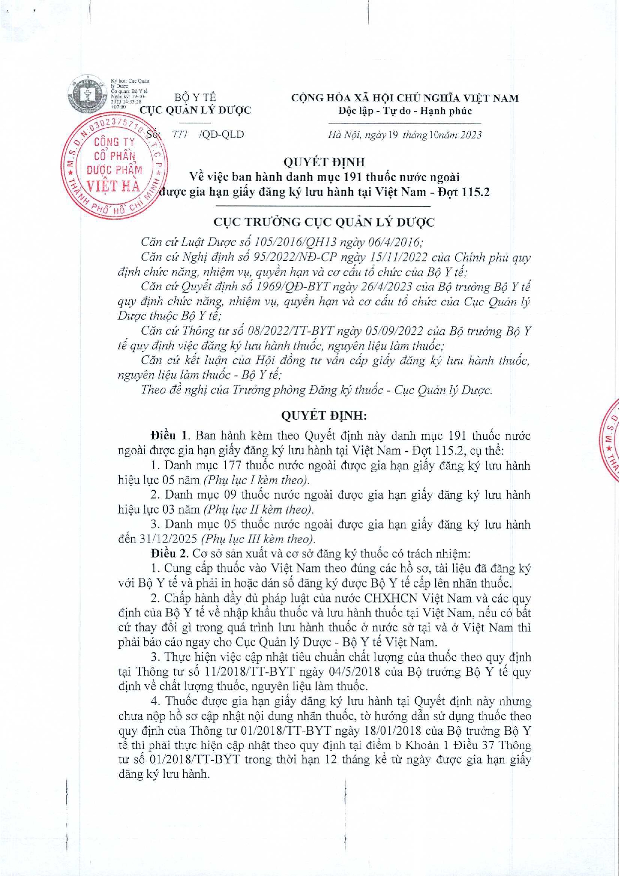 Quyết định Về việc thu hồi số công bố tiêu chuẩn áp dụng của thiết bị y tế thuộc loại A, B
