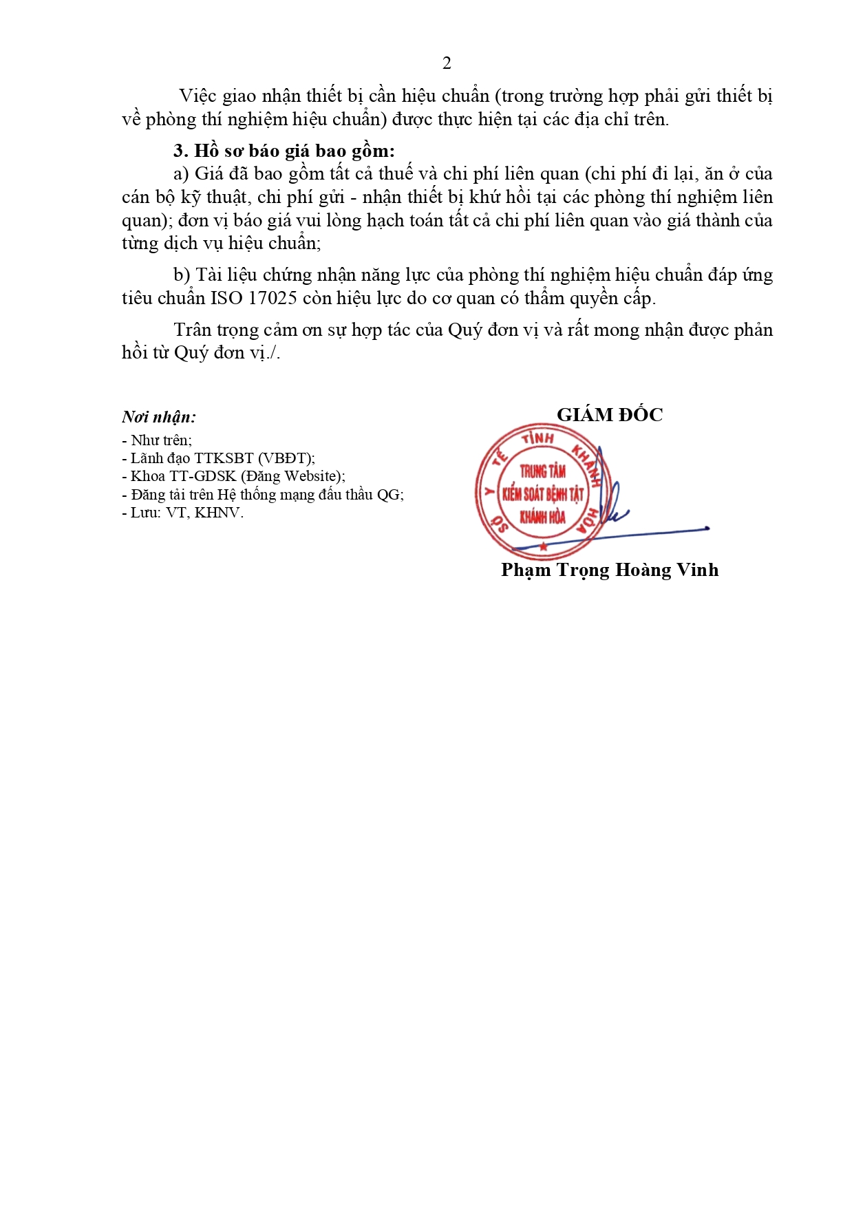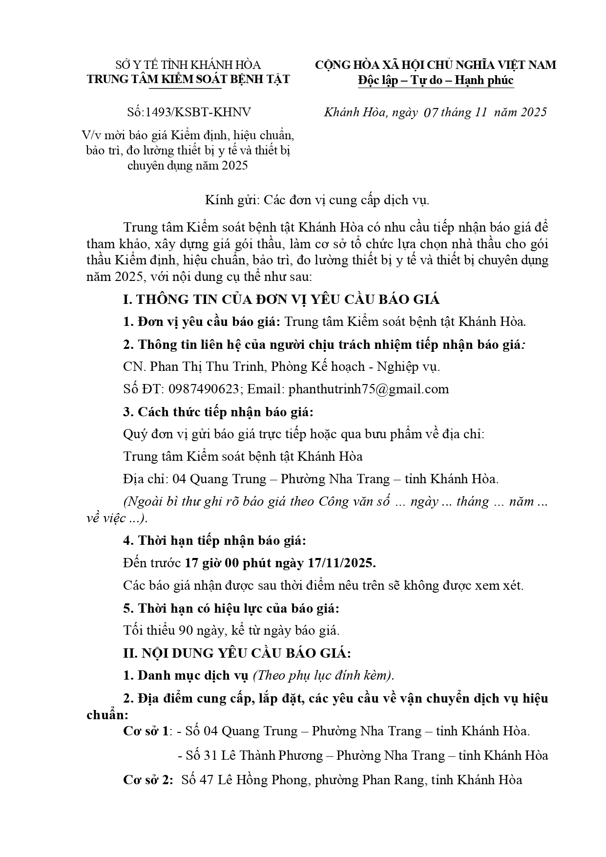 V/v mời báo giá Kiểm định, hiệu chuẩn, bảo trì, đo lường thiết bị y tế và thiết bị chuyên dụng năm 2025