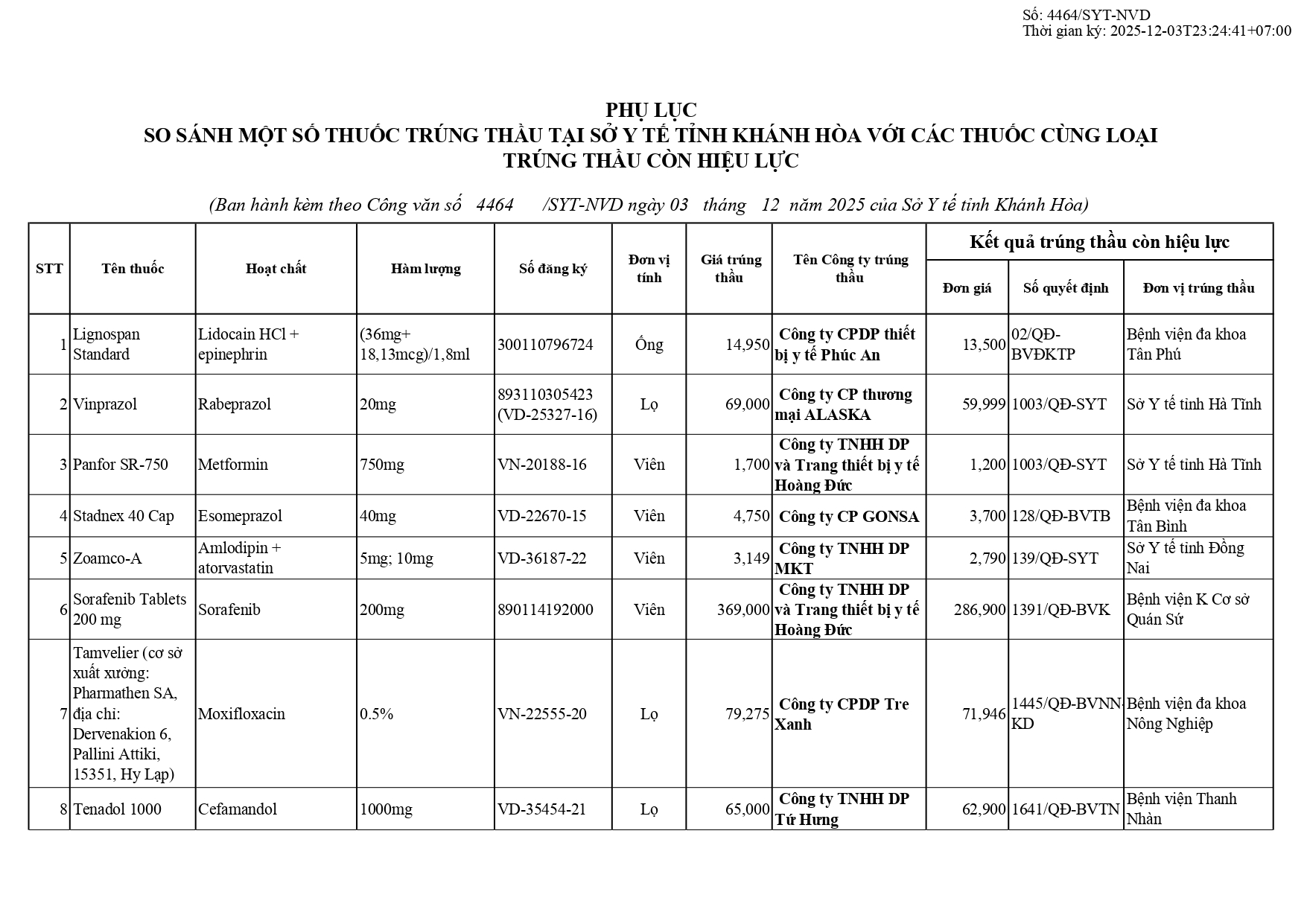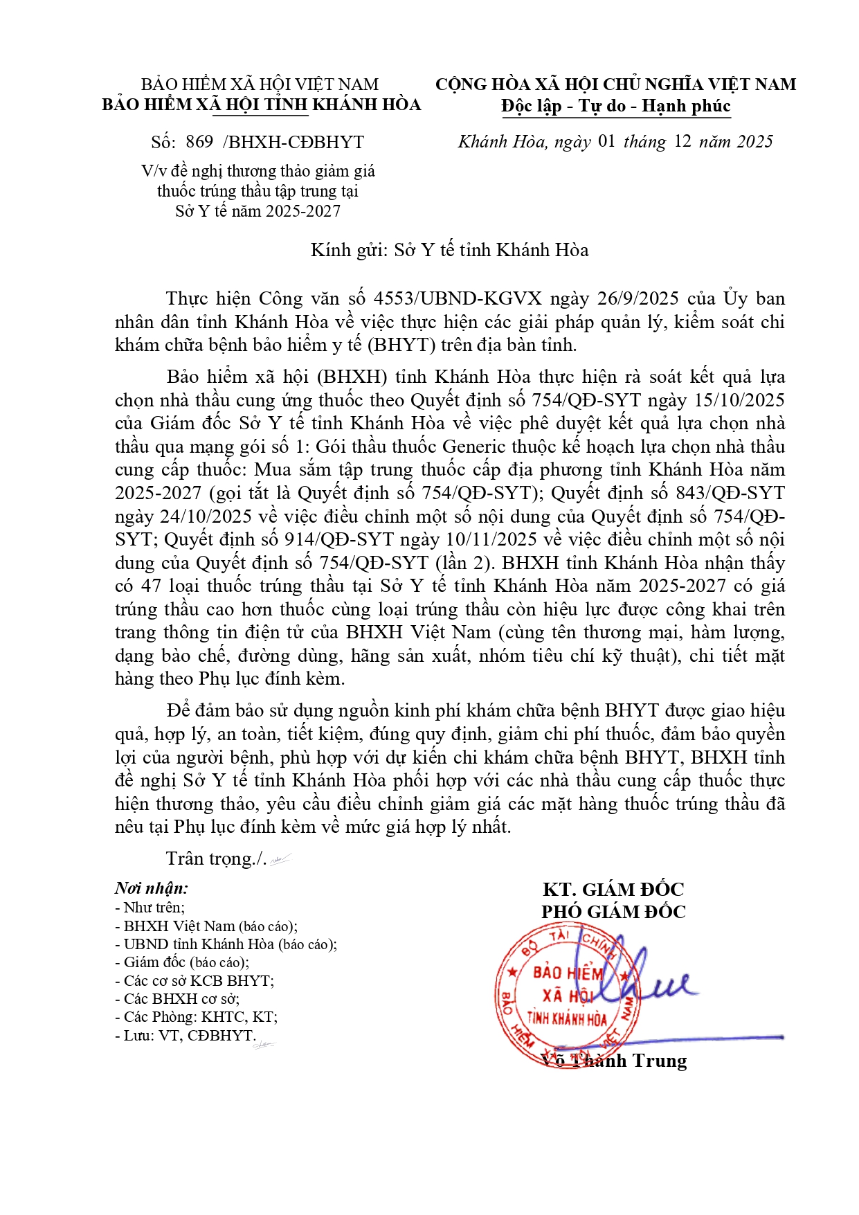 Quyết định Về việc điều chỉnh một số nội dung của Quyết định số 754/QĐ-SYT ngày 15/10/2025 của Sở Y tế về việc phê duyệt kết quả lựa chọn nhà thầu qua mạng gói số 1: Gói thầu thuốc Generic thuộc kế hoạch lựa chọn nhà thầu cung cấp thuốc: Mua sắm tập trung thuốc cấp địa phương tỉnh Khánh Hòa năm 2025-2027 (lần 2)