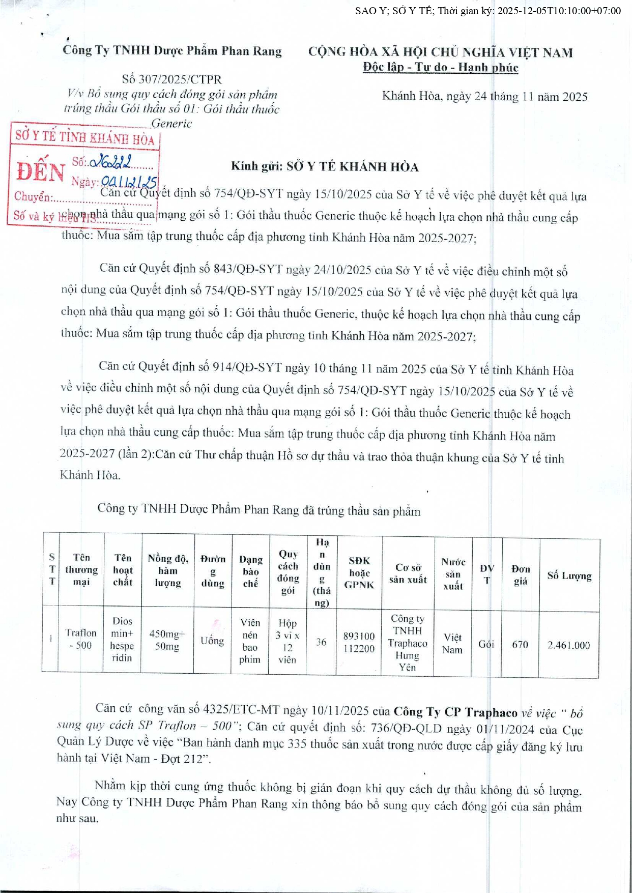 Quyết định Về việc điều chỉnh một số nội dung của Quyết định số 754/QĐ-SYT ngày 15/10/2025 của Sở Y tế về việc phê duyệt kết quả lựa chọn nhà thầu qua mạng gói số 1: Gói thầu thuốc Generic thuộc kế hoạch lựa chọn nhà thầu cung cấp thuốc: Mua sắm tập trung thuốc cấp địa phương tỉnh Khánh Hòa năm 2025-2027 (lần 2)