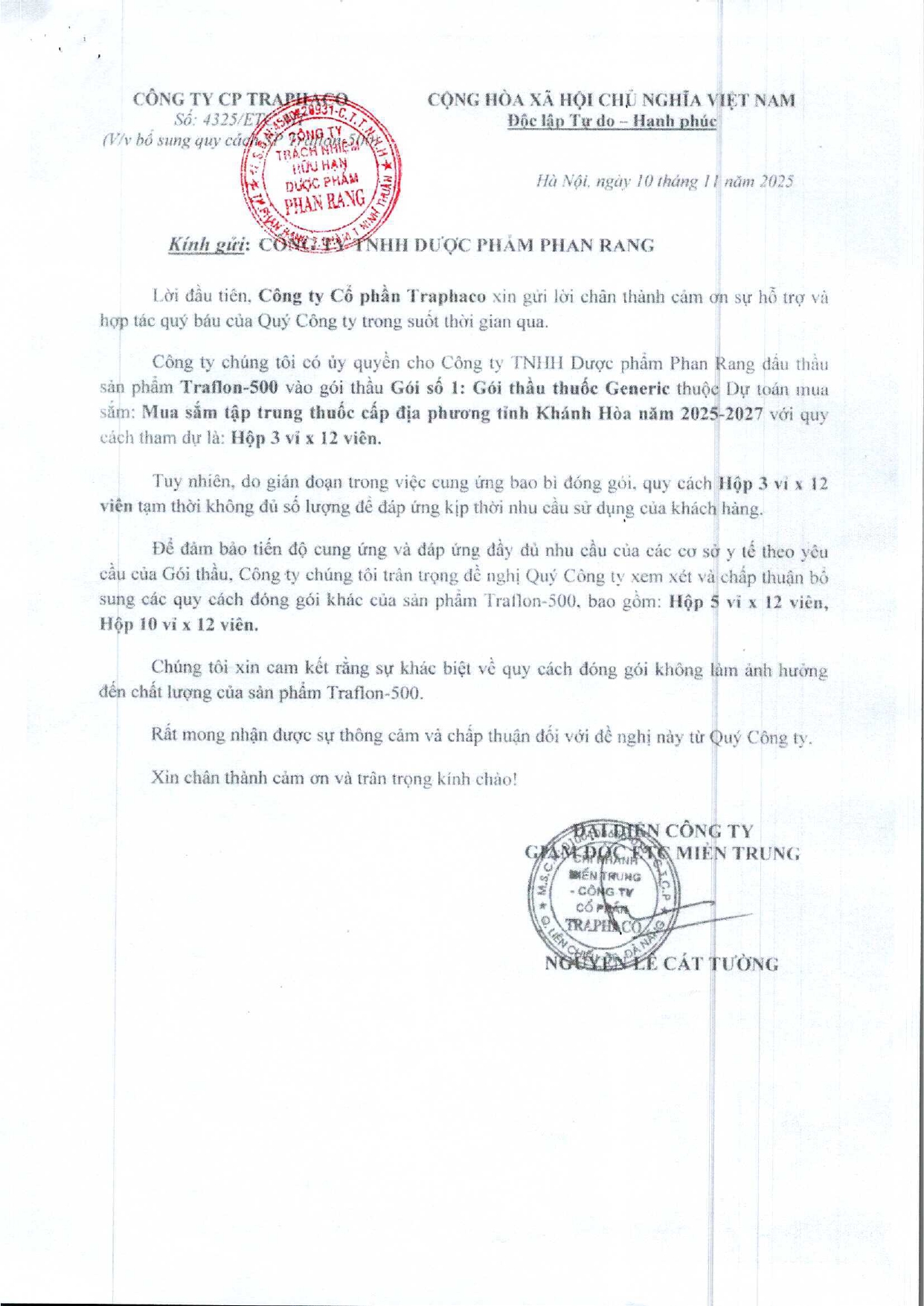 V/v bổ sung quy cách đóng gói của mặt hàng trúng thầu