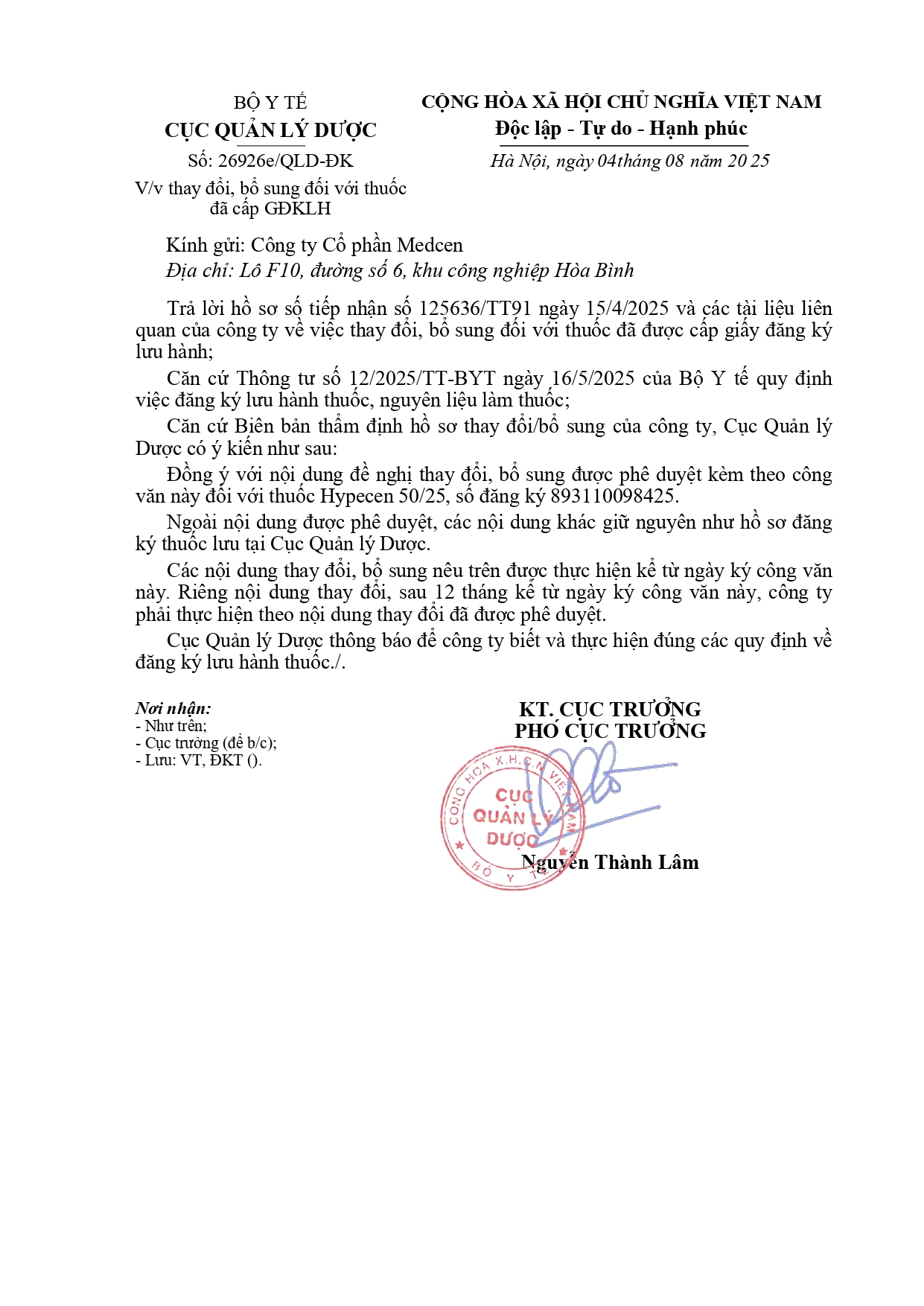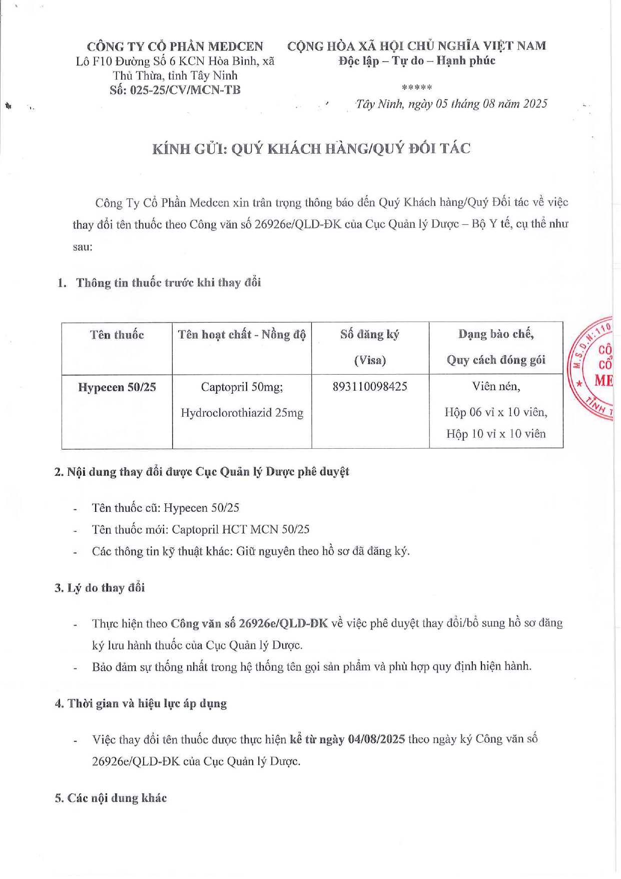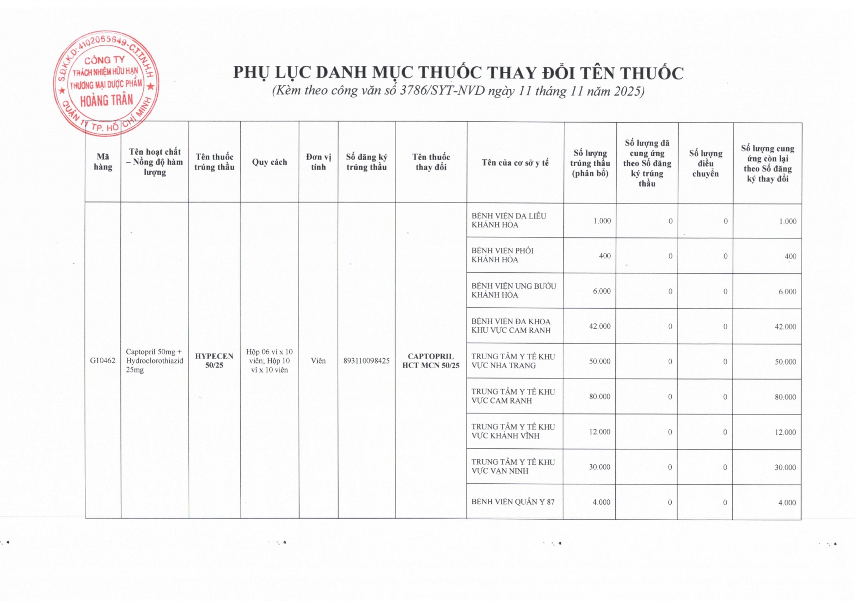 V/v thay đổi tên thuốc của mặt hàng trúng thầu