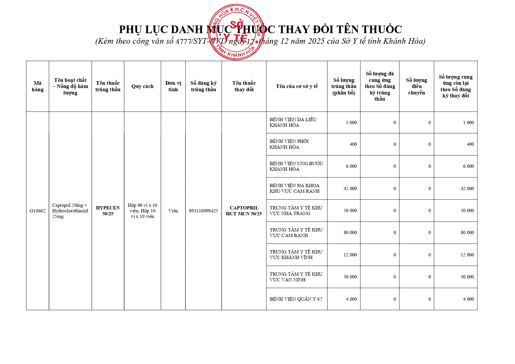 Quyết định Về việc điều chỉnh một số nội dung của Quyết định số 754/QĐ-SYT ngày 15/10/2025 của Sở Y tế về việc phê duyệt kết quả lựa chọn nhà thầu qua mạng gói số 1: Gói thầu thuốc Generic thuộc kế hoạch lựa chọn nhà thầu cung cấp thuốc: Mua sắm tập trung thuốc cấp địa phương tỉnh Khánh Hòa năm 2025-2027 (lần 2)
