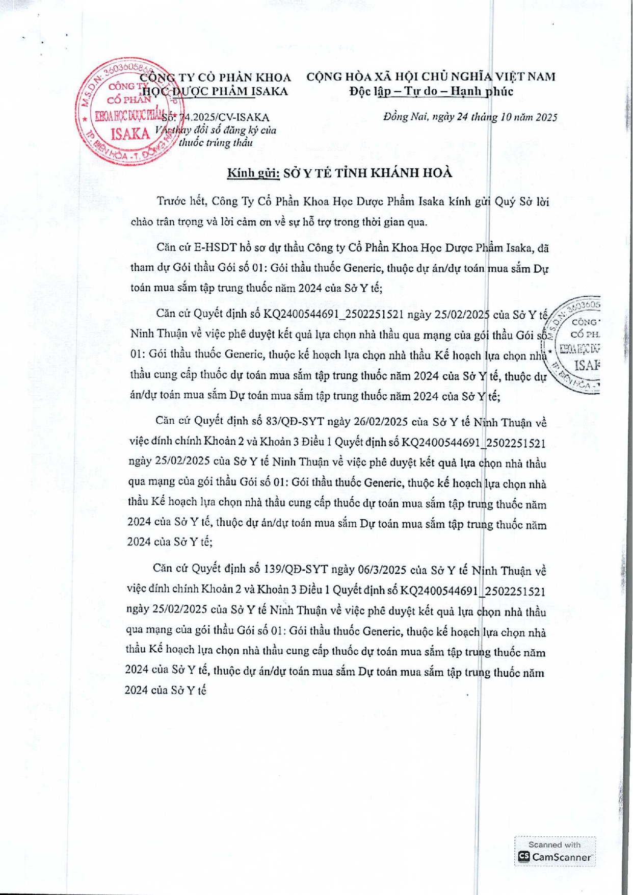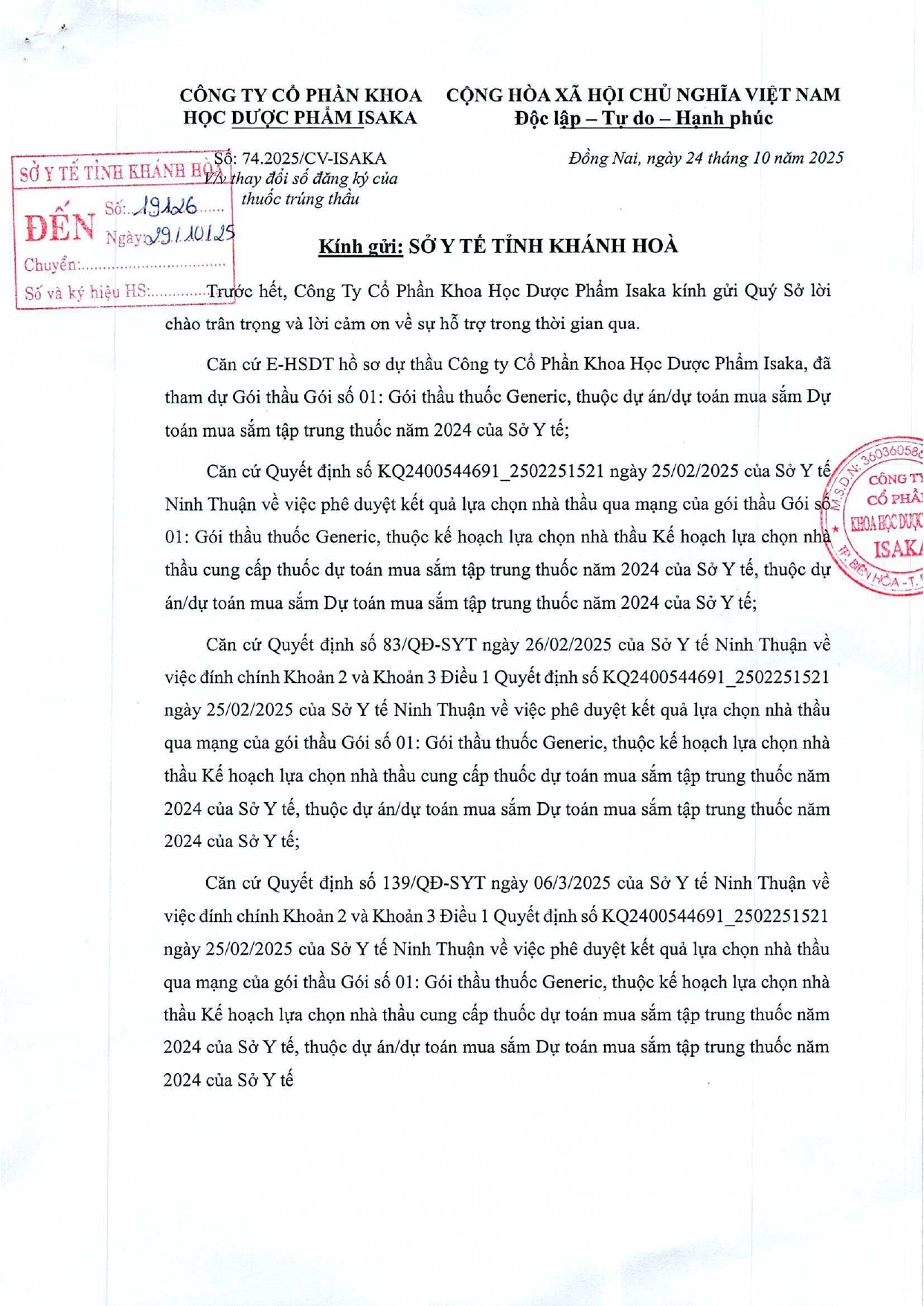 Quyết định Về việc điều chỉnh một số nội dung của Quyết định số 754/QĐ-SYT ngày 15/10/2025 của Sở Y tế về việc phê duyệt kết quả lựa chọn nhà thầu qua mạng gói số 1: Gói thầu thuốc Generic thuộc kế hoạch lựa chọn nhà thầu cung cấp thuốc: Mua sắm tập trung thuốc cấp địa phương tỉnh Khánh Hòa năm 2025-2027 (lần 2)