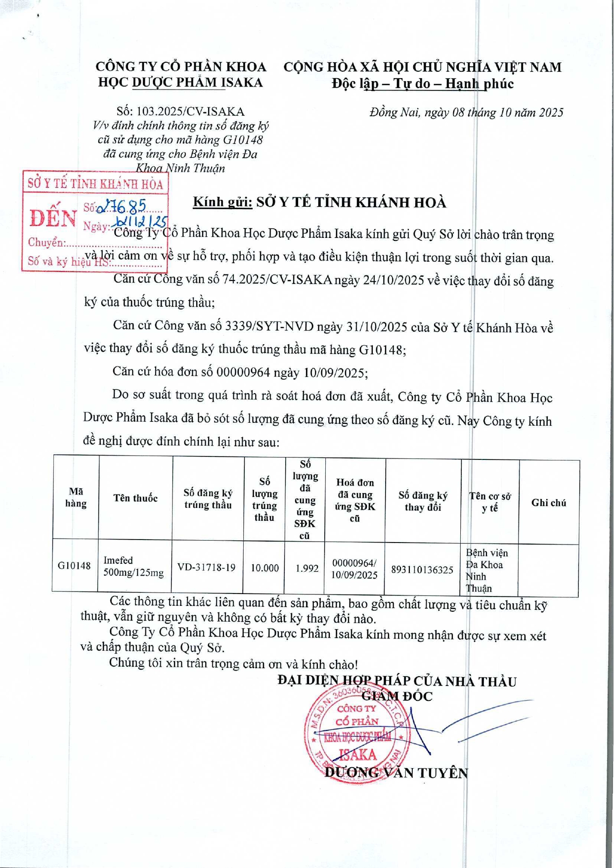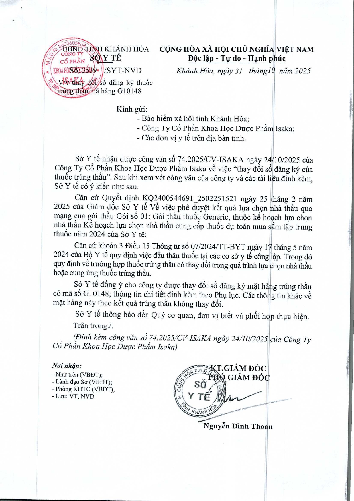 V/v thay đổi số đăng ký thuốc trúng thầu mã hàng G10148