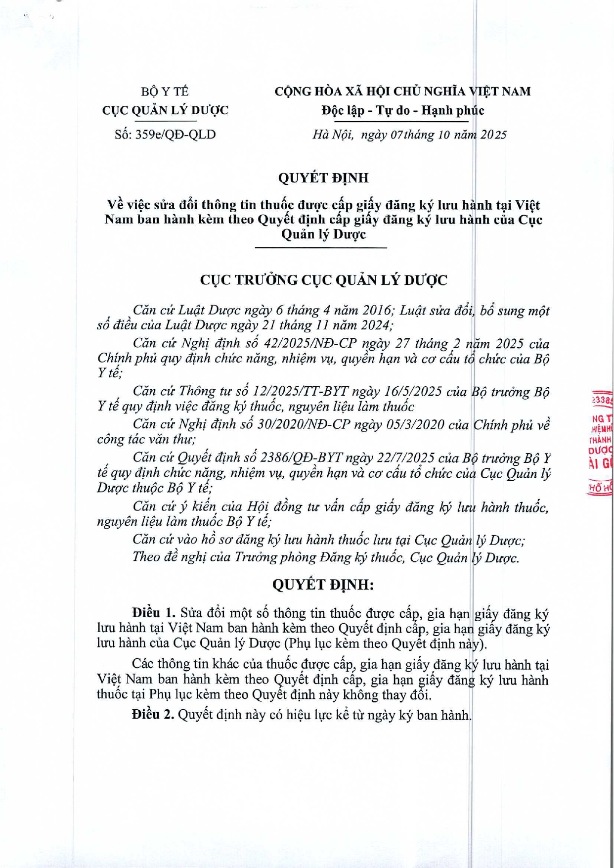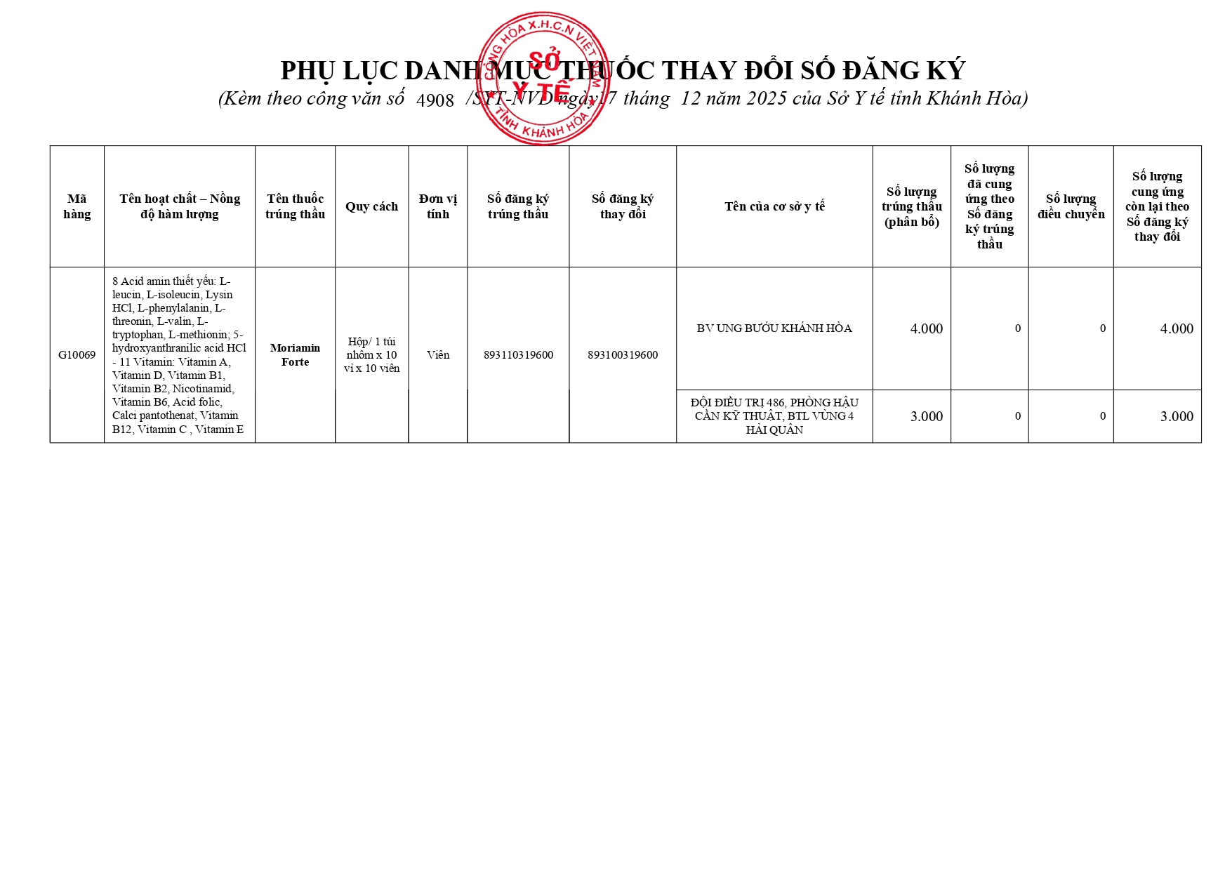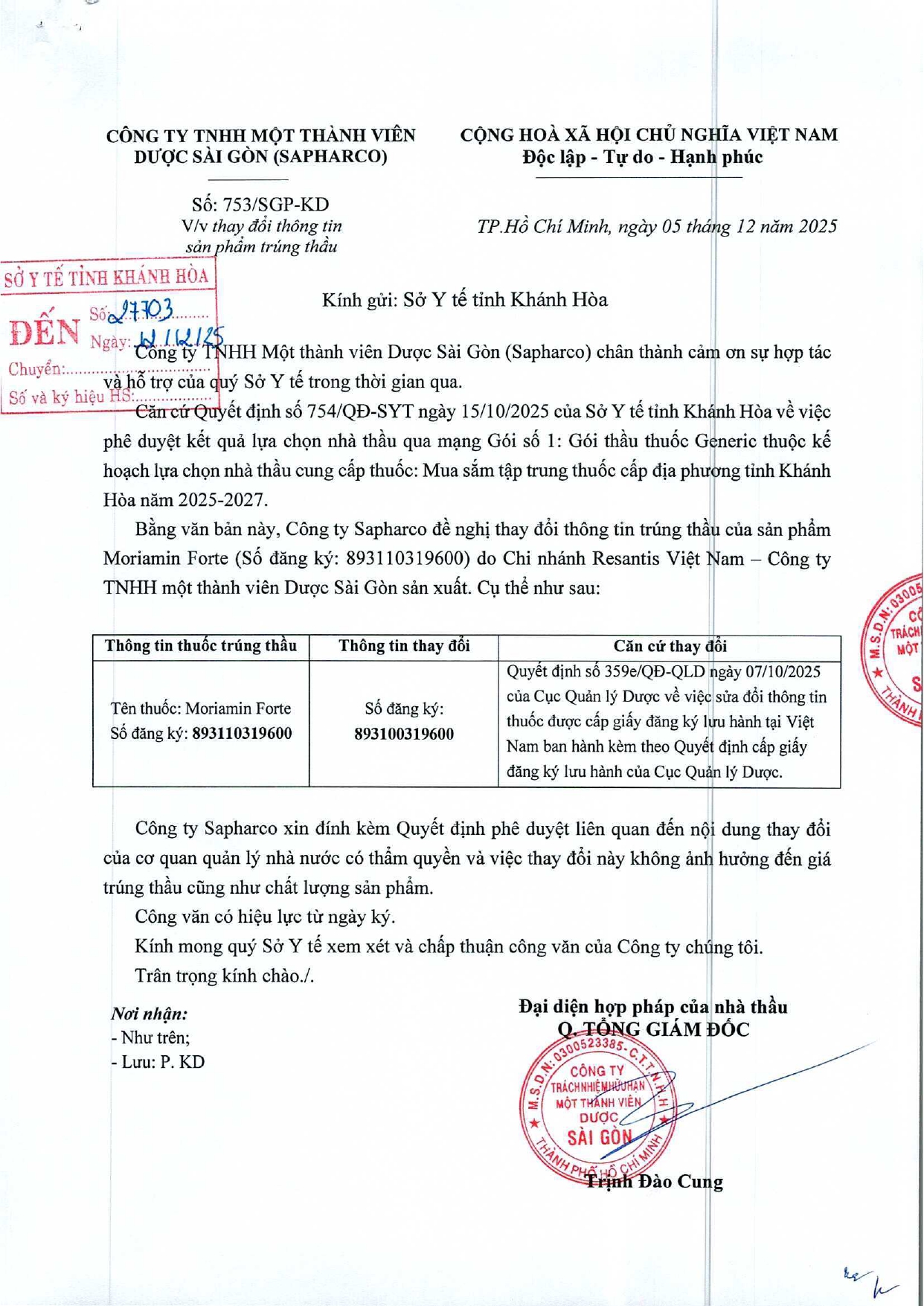 Quyết định Về việc điều chỉnh một số nội dung của Quyết định số 754/QĐ-SYT ngày 15/10/2025 của Sở Y tế về việc phê duyệt kết quả lựa chọn nhà thầu qua mạng gói số 1: Gói thầu thuốc Generic thuộc kế hoạch lựa chọn nhà thầu cung cấp thuốc: Mua sắm tập trung thuốc cấp địa phương tỉnh Khánh Hòa năm 2025-2027 (lần 2)