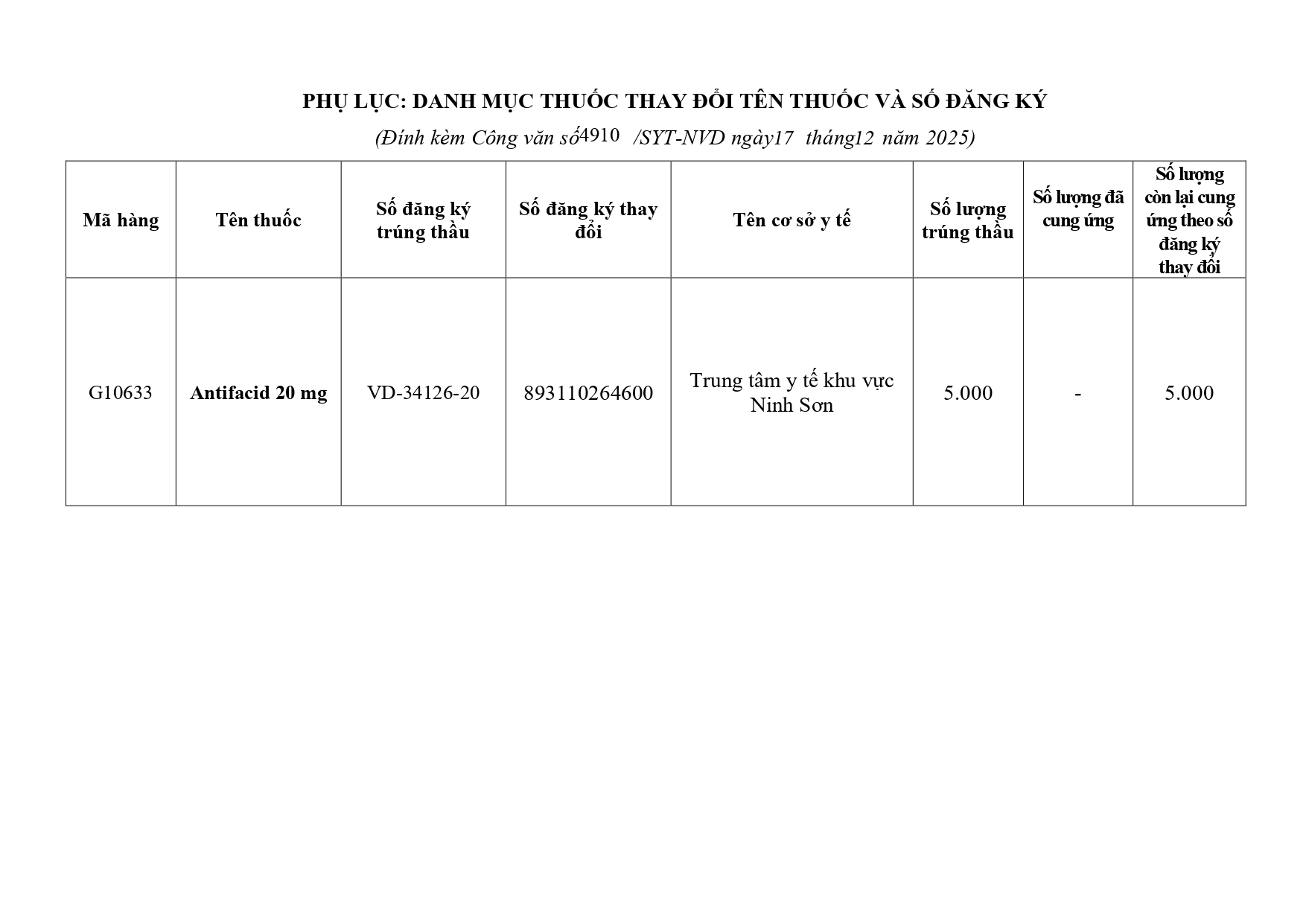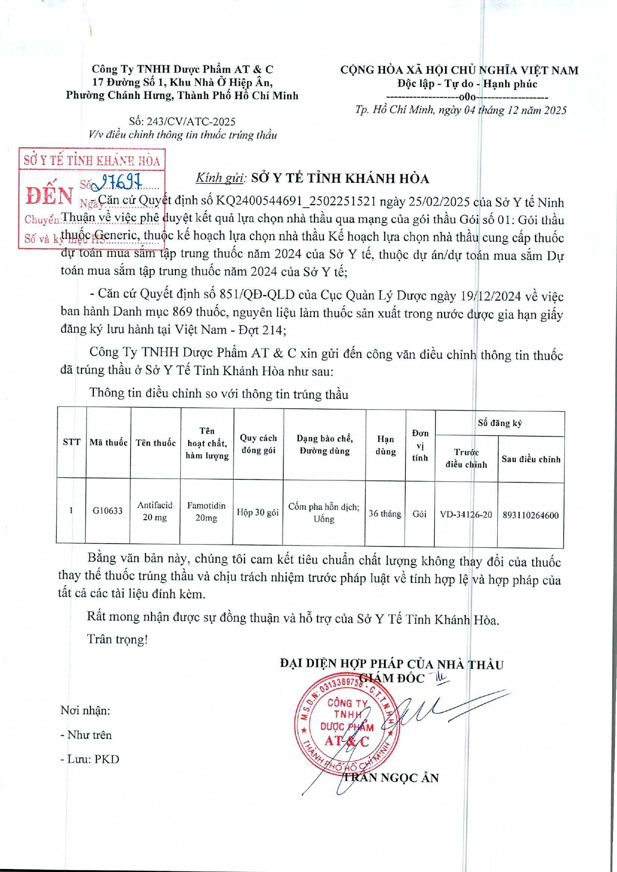 Quyết định Về việc điều chỉnh một số nội dung của Quyết định số 754/QĐ-SYT ngày 15/10/2025 của Sở Y tế về việc phê duyệt kết quả lựa chọn nhà thầu qua mạng gói số 1: Gói thầu thuốc Generic thuộc kế hoạch lựa chọn nhà thầu cung cấp thuốc: Mua sắm tập trung thuốc cấp địa phương tỉnh Khánh Hòa năm 2025-2027 (lần 2)