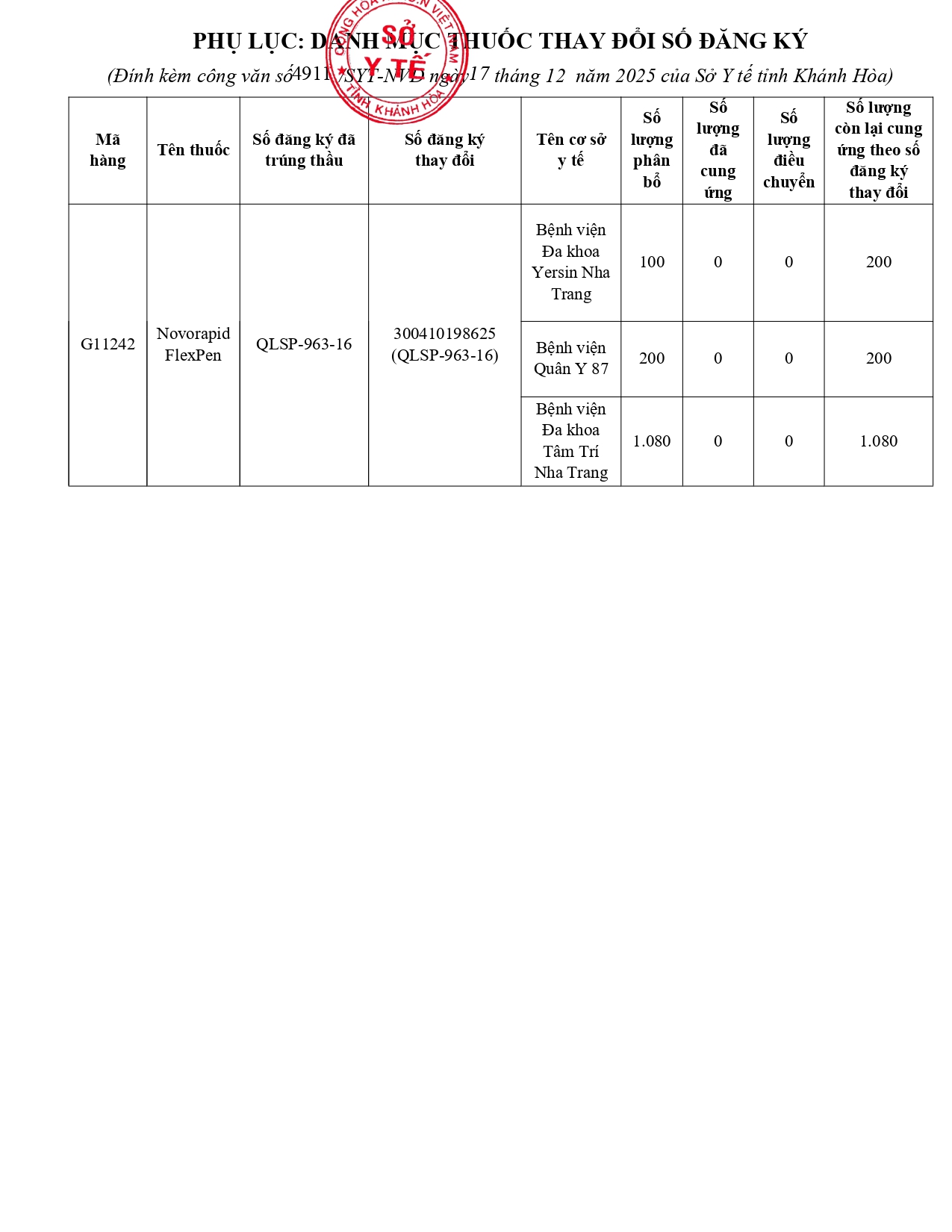 Quyết định Về việc điều chỉnh một số nội dung của Quyết định số 754/QĐ-SYT ngày 15/10/2025 của Sở Y tế về việc phê duyệt kết quả lựa chọn nhà thầu qua mạng gói số 1: Gói thầu thuốc Generic thuộc kế hoạch lựa chọn nhà thầu cung cấp thuốc: Mua sắm tập trung thuốc cấp địa phương tỉnh Khánh Hòa năm 2025-2027 (lần 2)
