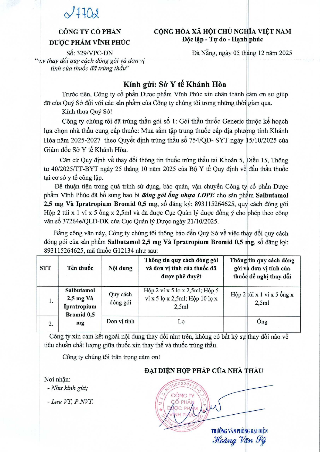 V/v thay đổi quy cách đóng gói, đơn vị tính của mặt hàng trúng thầu