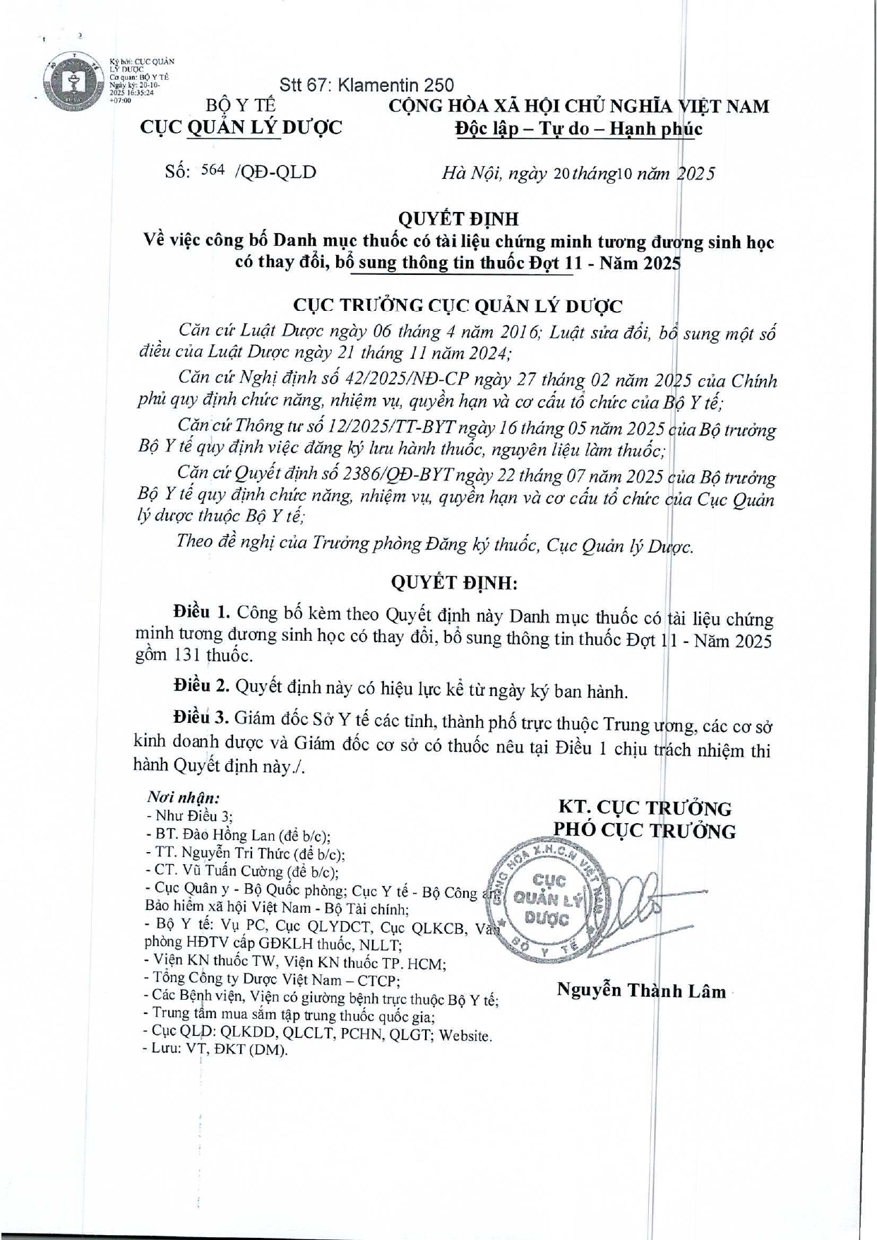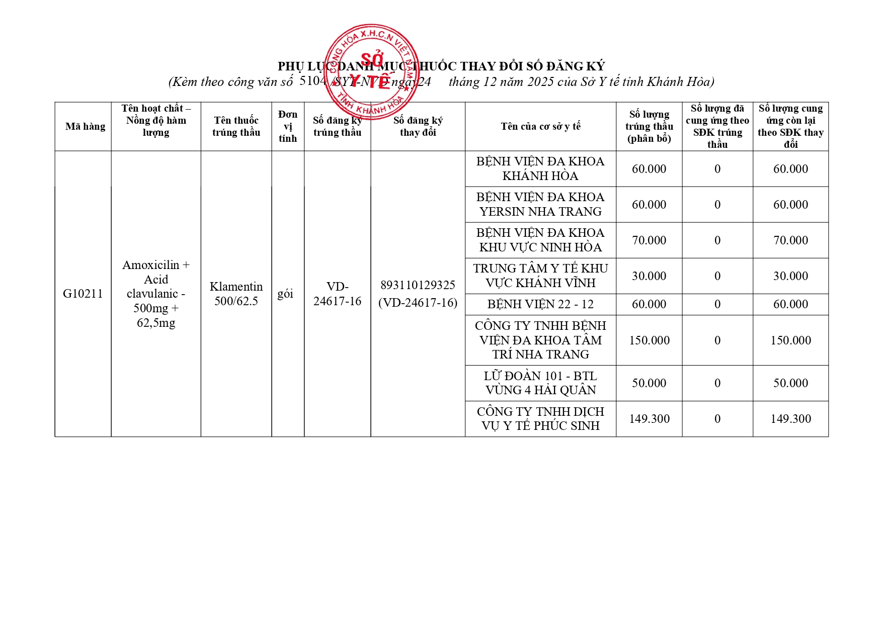 Quyết định Về việc điều chỉnh một số nội dung của Quyết định số 754/QĐ-SYT ngày 15/10/2025 của Sở Y tế về việc phê duyệt kết quả lựa chọn nhà thầu qua mạng gói số 1: Gói thầu thuốc Generic thuộc kế hoạch lựa chọn nhà thầu cung cấp thuốc: Mua sắm tập trung thuốc cấp địa phương tỉnh Khánh Hòa năm 2025-2027 (lần 2)