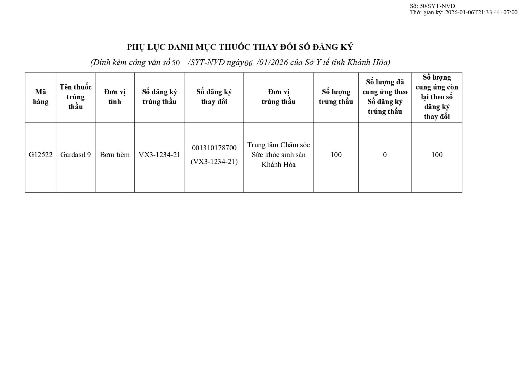 V/v thay đổi số đăng ký của mặt hàng trúng thầu