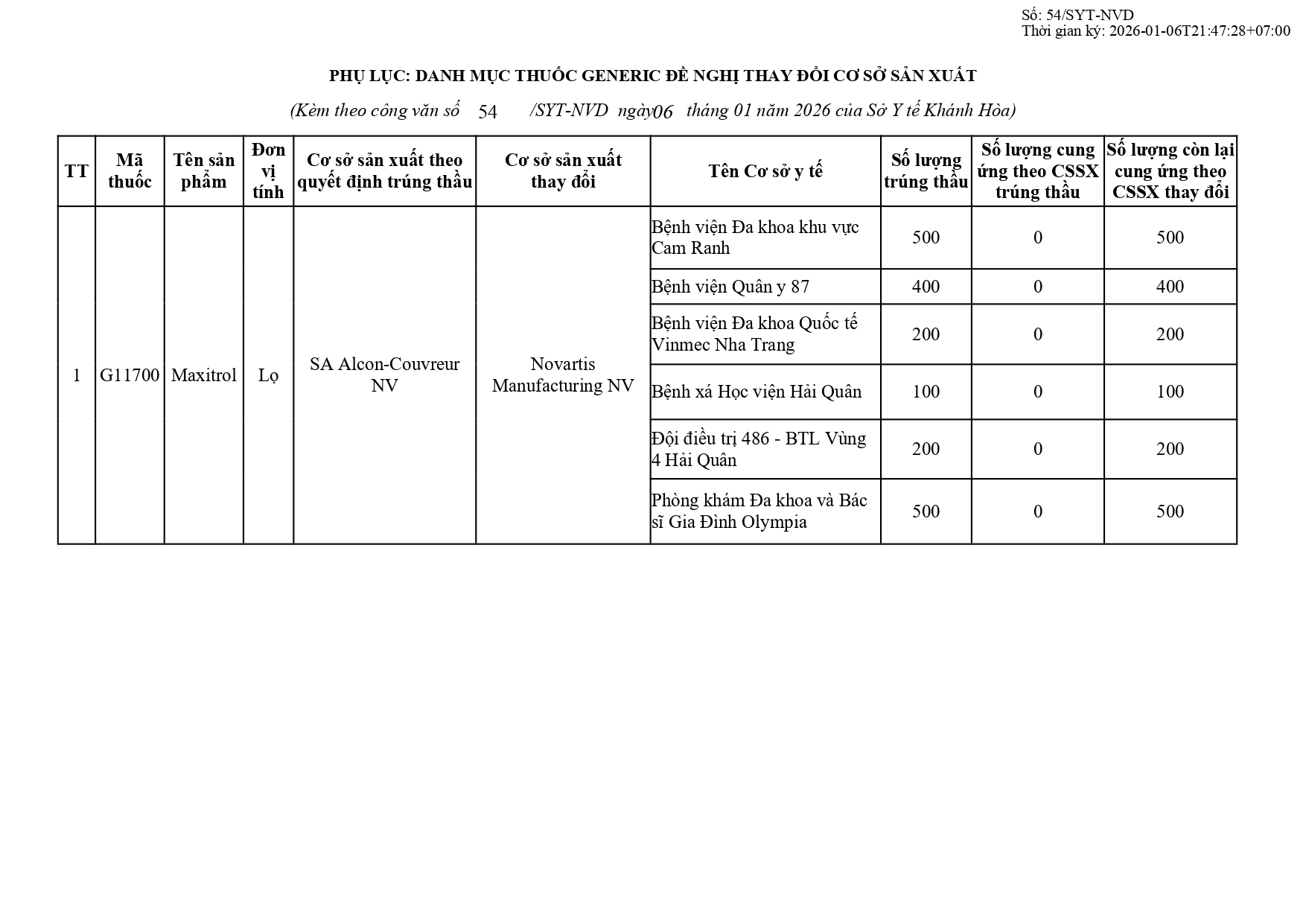 Quyết định Về việc điều chỉnh một số nội dung của Quyết định số 754/QĐ-SYT ngày 15/10/2025 của Sở Y tế về việc phê duyệt kết quả lựa chọn nhà thầu qua mạng gói số 1: Gói thầu thuốc Generic thuộc kế hoạch lựa chọn nhà thầu cung cấp thuốc: Mua sắm tập trung thuốc cấp địa phương tỉnh Khánh Hòa năm 2025-2027 (lần 2)