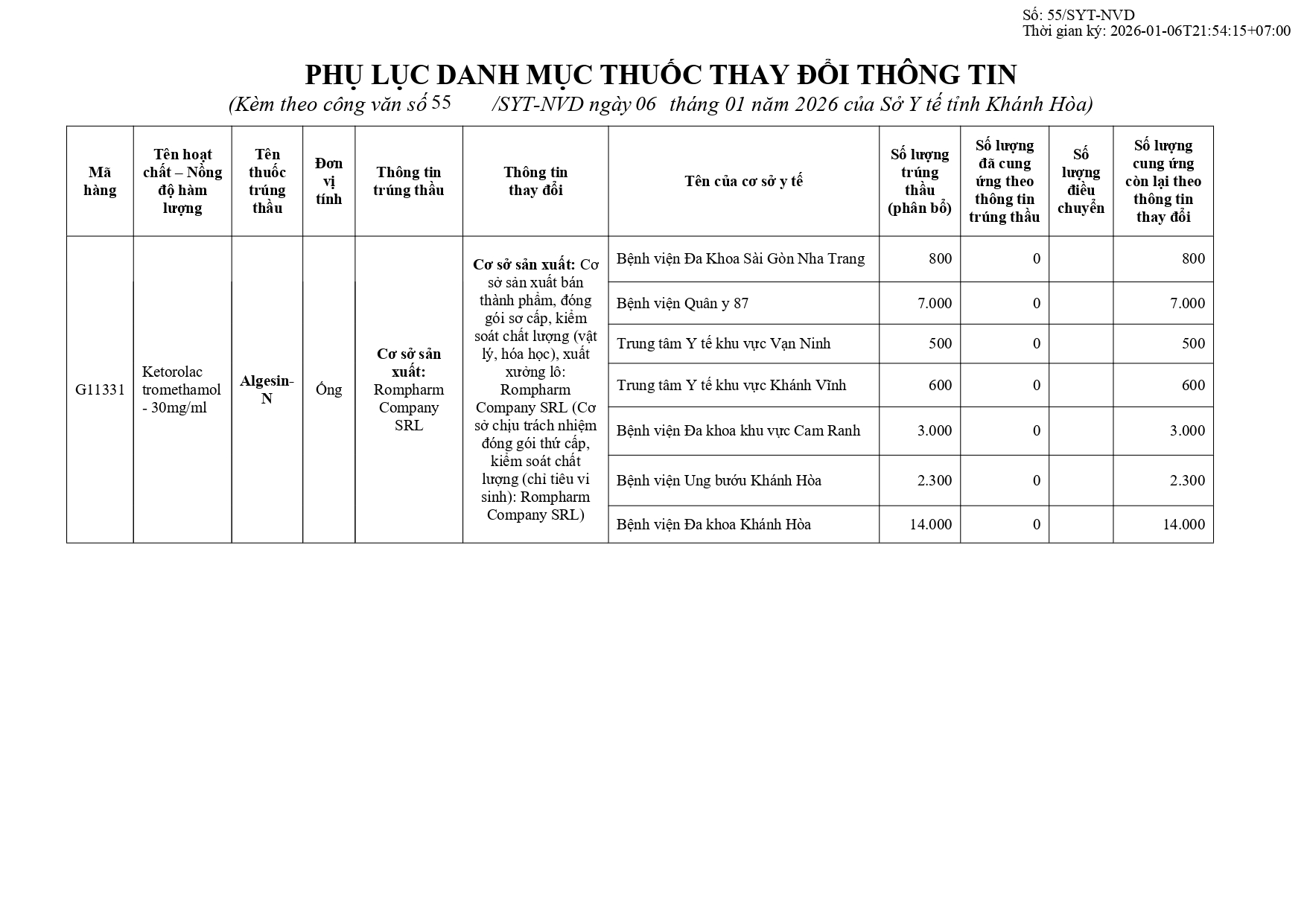 Quyết định Về việc điều chỉnh một số nội dung của Quyết định số 754/QĐ-SYT ngày 15/10/2025 của Sở Y tế về việc phê duyệt kết quả lựa chọn nhà thầu qua mạng gói số 1: Gói thầu thuốc Generic thuộc kế hoạch lựa chọn nhà thầu cung cấp thuốc: Mua sắm tập trung thuốc cấp địa phương tỉnh Khánh Hòa năm 2025-2027 (lần 2)