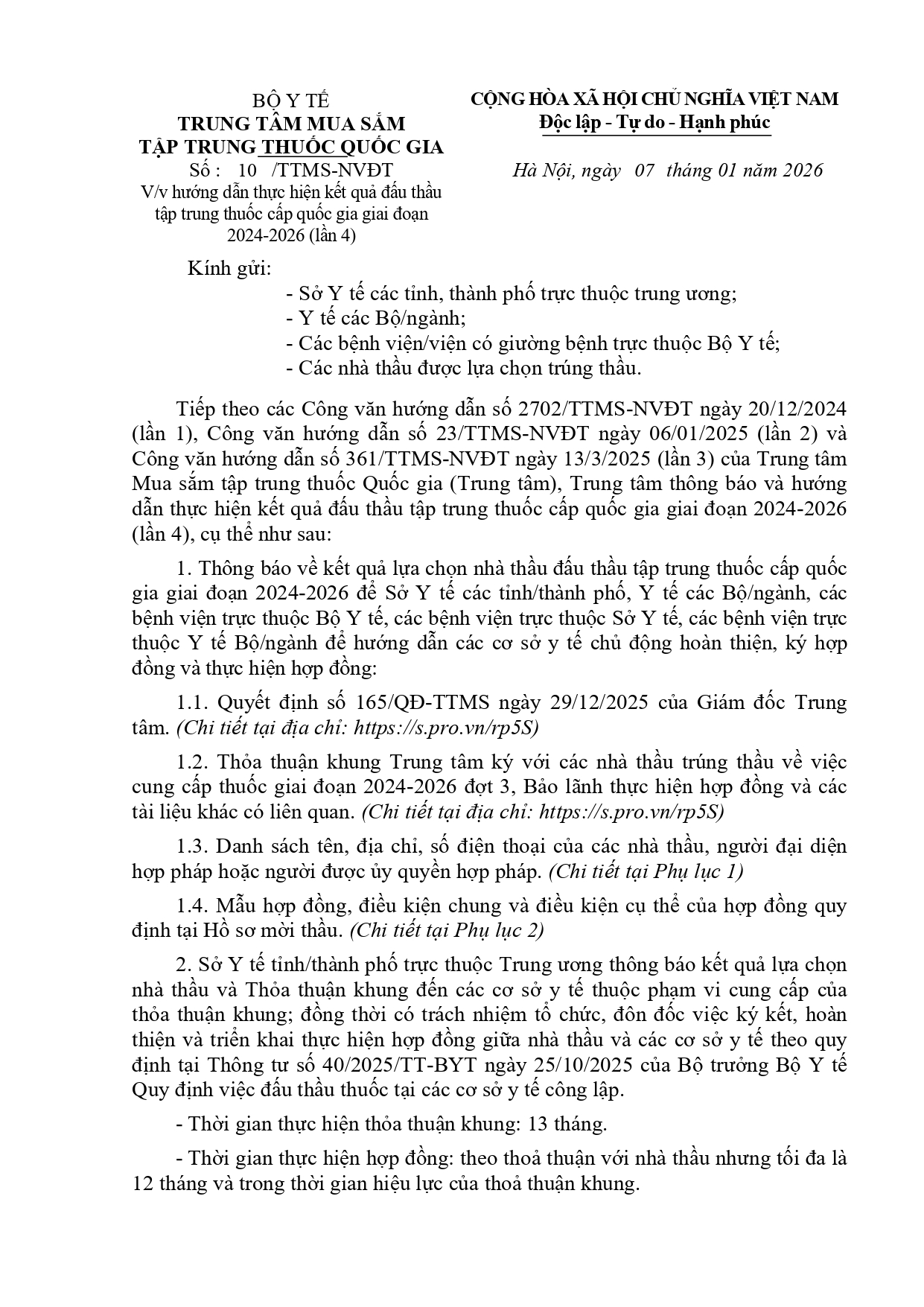 V/v hướng dẫn thực hiện kết quả đấu thầu tập trung thuốc cấp Quốc gia giai đoạn 2024-2026 (Lần 4)