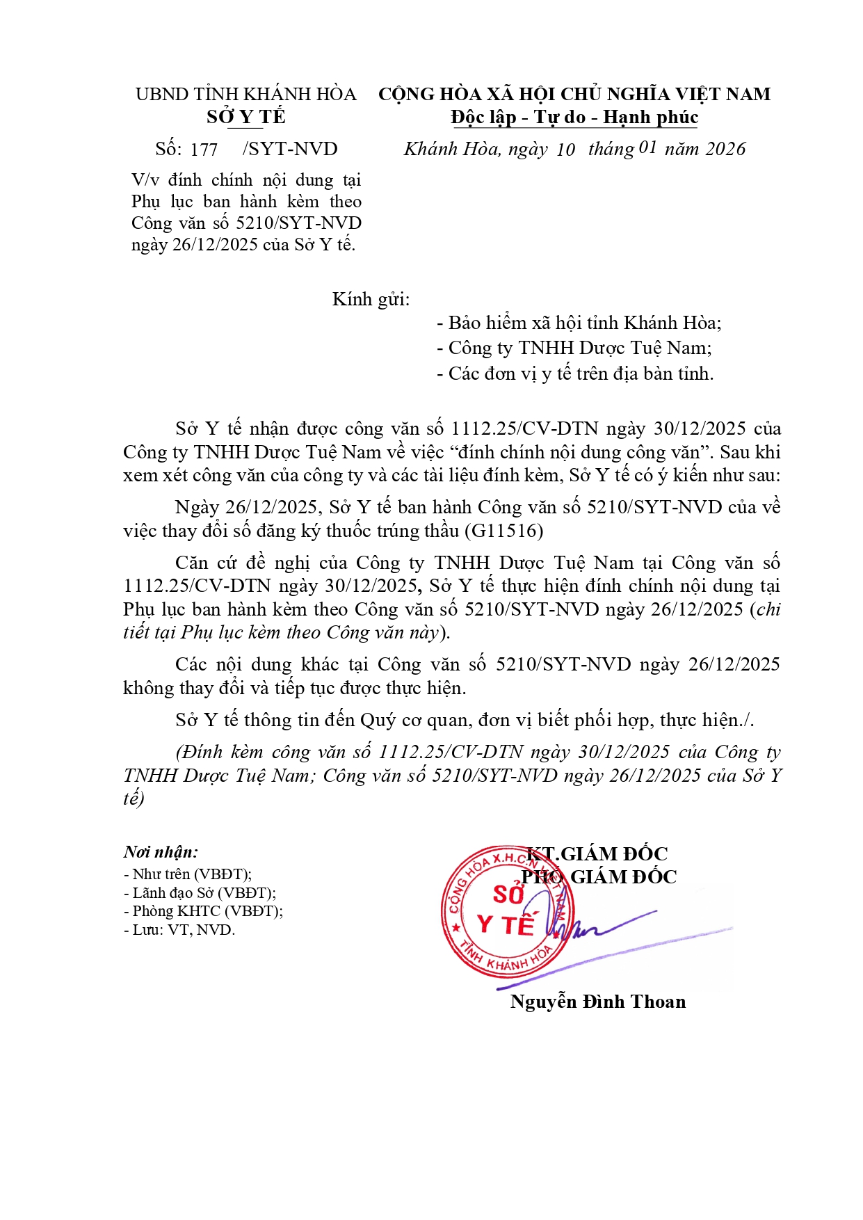Quyết định Về việc điều chỉnh một số nội dung của Quyết định số 754/QĐ-SYT ngày 15/10/2025 của Sở Y tế về việc phê duyệt kết quả lựa chọn nhà thầu qua mạng gói số 1: Gói thầu thuốc Generic thuộc kế hoạch lựa chọn nhà thầu cung cấp thuốc: Mua sắm tập trung thuốc cấp địa phương tỉnh Khánh Hòa năm 2025-2027