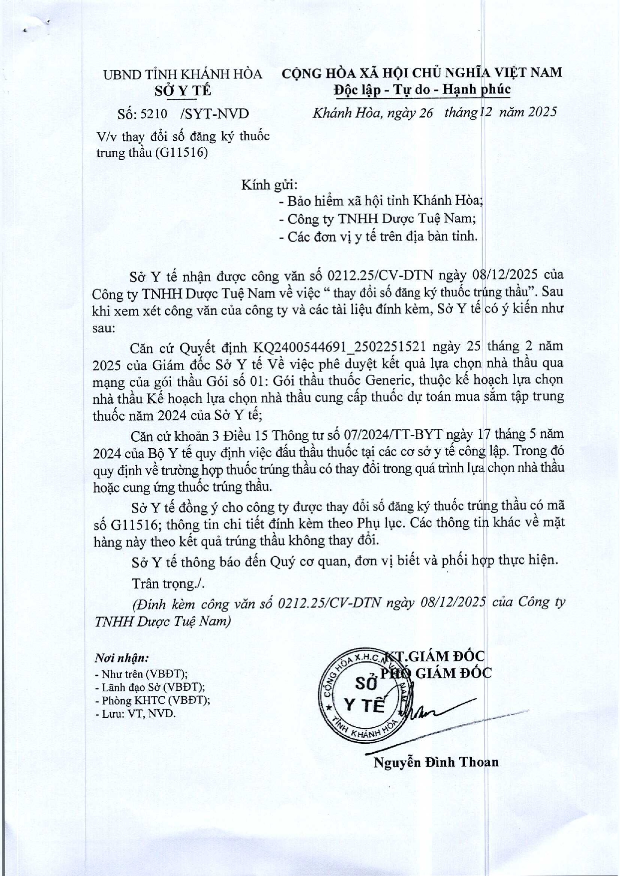 Quyết định Về việc điều chỉnh một số nội dung của Quyết định số 754/QĐ-SYT ngày 15/10/2025 của Sở Y tế về việc phê duyệt kết quả lựa chọn nhà thầu qua mạng gói số 1: Gói thầu thuốc Generic thuộc kế hoạch lựa chọn nhà thầu cung cấp thuốc: Mua sắm tập trung thuốc cấp địa phương tỉnh Khánh Hòa năm 2025-2027 (lần 2)