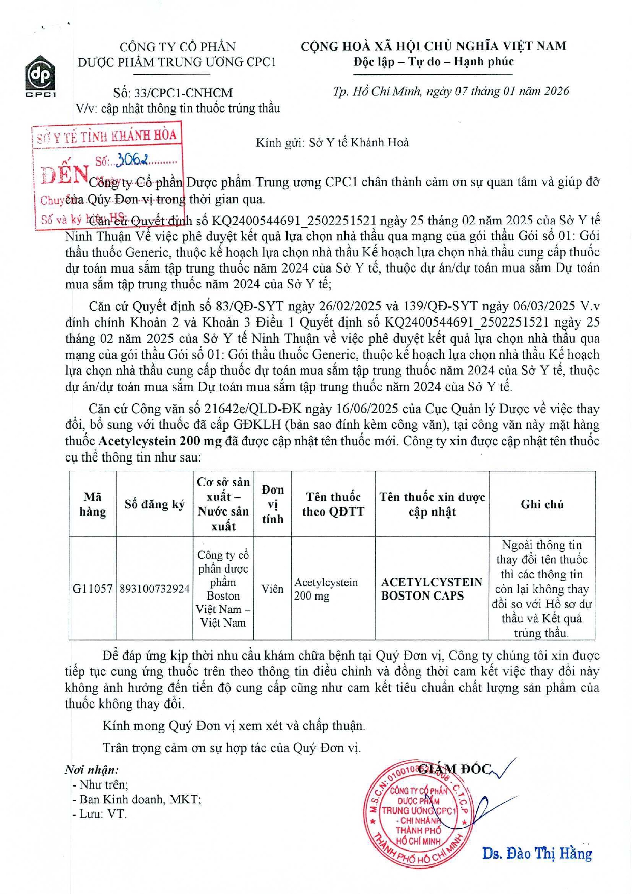 Quyết định Về việc điều chỉnh một số nội dung của Quyết định số 754/QĐ-SYT ngày 15/10/2025 của Sở Y tế về việc phê duyệt kết quả lựa chọn nhà thầu qua mạng gói số 1: Gói thầu thuốc Generic thuộc kế hoạch lựa chọn nhà thầu cung cấp thuốc: Mua sắm tập trung thuốc cấp địa phương tỉnh Khánh Hòa năm 2025-2027 (lần 2)