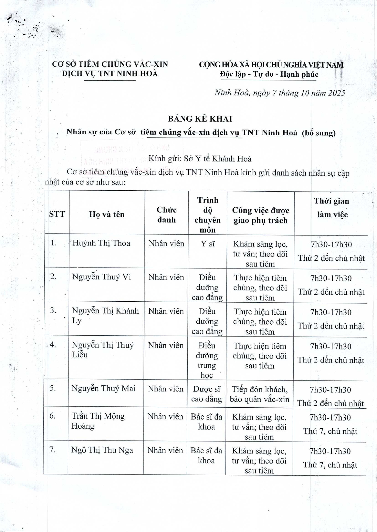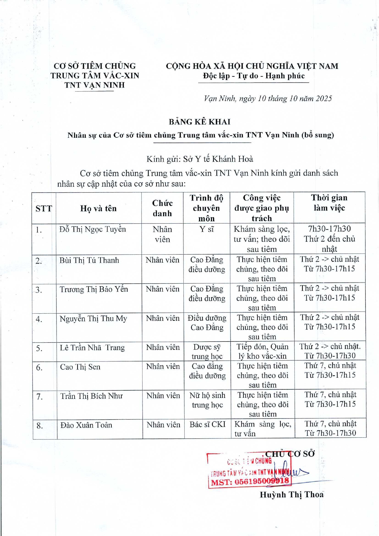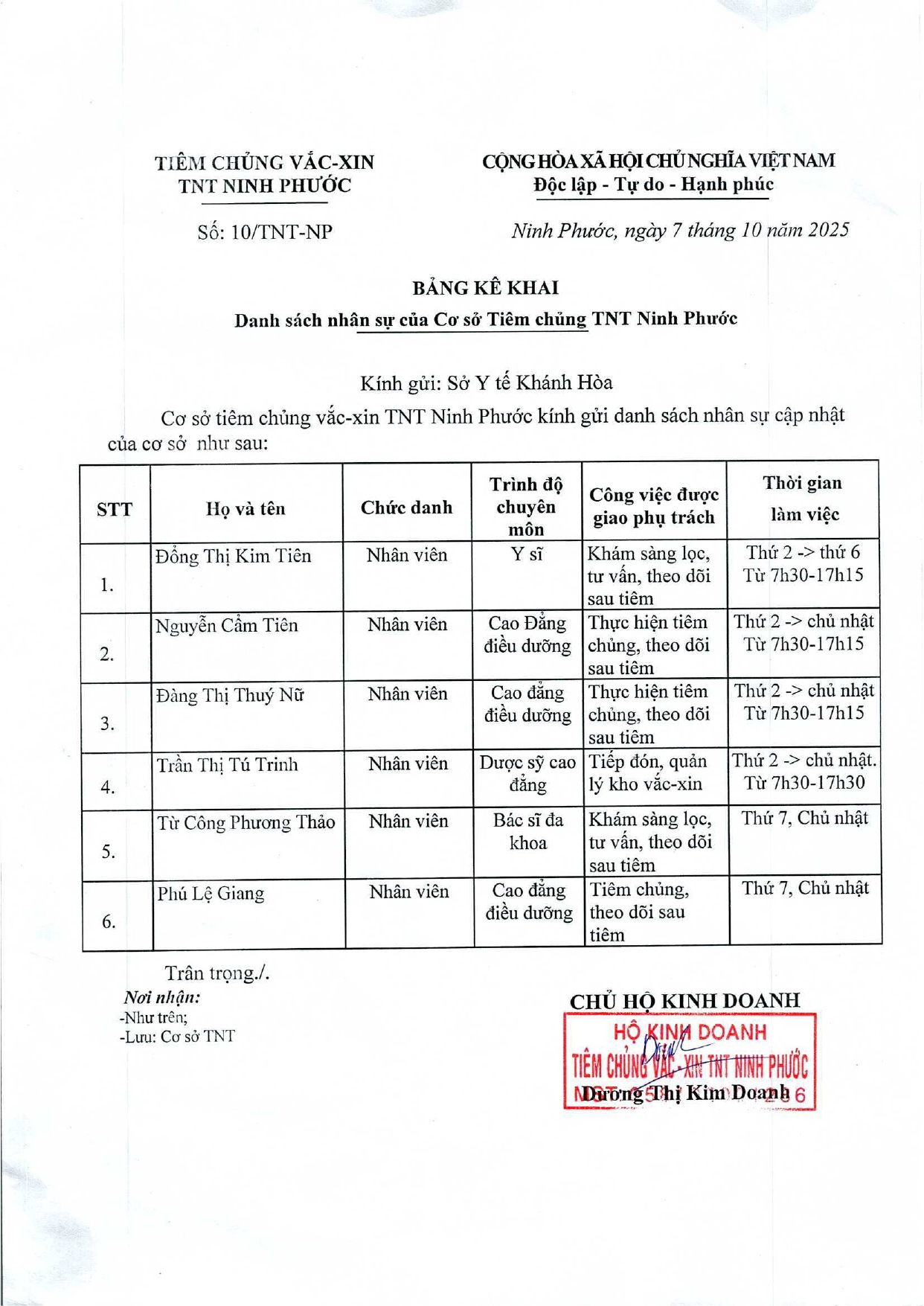 Bảng kê khai danh sách nhân sự của Cơ sở Tiêm chủng TNT Ninh Phước