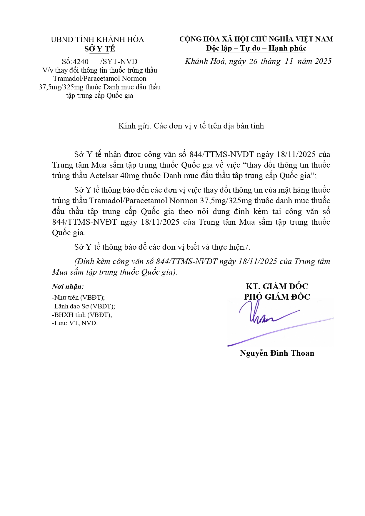 Quyết định Về việc điều chỉnh một số nội dung của Quyết định số 754/QĐ-SYT ngày 15/10/2025 của Sở Y tế về việc phê duyệt kết quả lựa chọn nhà thầu qua mạng gói số 1: Gói thầu thuốc Generic thuộc kế hoạch lựa chọn nhà thầu cung cấp thuốc: Mua sắm tập trung thuốc cấp địa phương tỉnh Khánh Hòa năm 2025-2027 (lần 2)