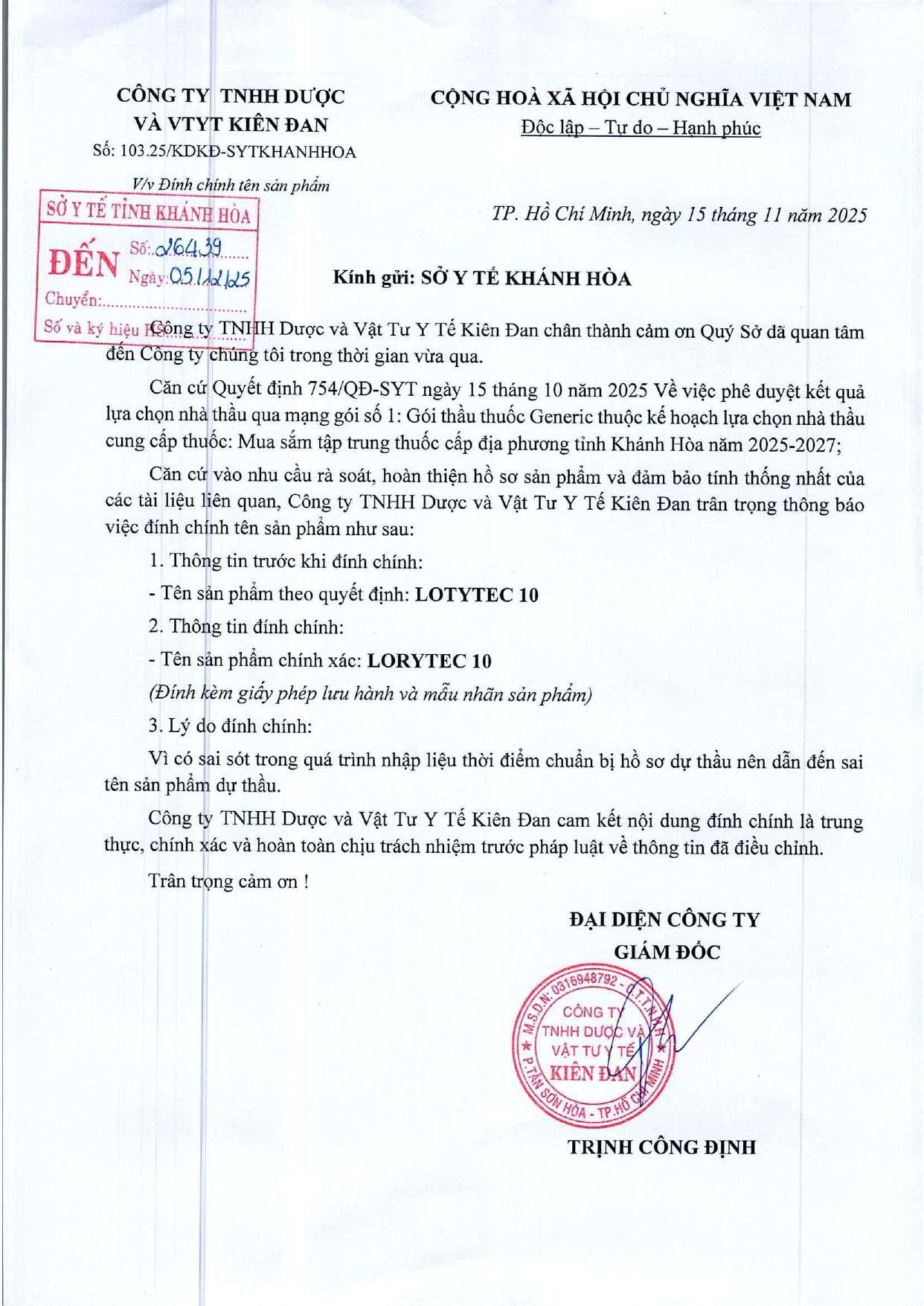 V/v điều chỉnh tên thuốc trúng thầu theo Quyết định số 754/QĐ-SYT ngày 15/10/2025