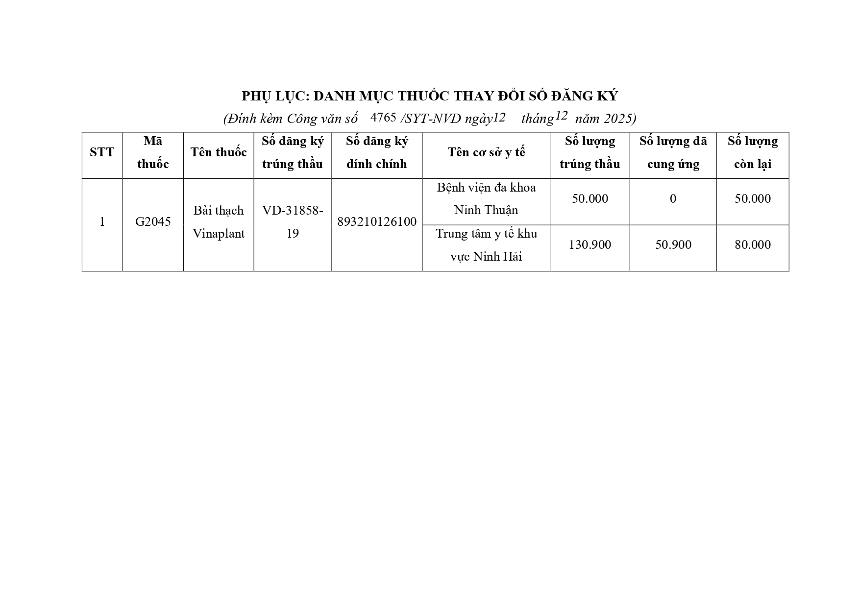 Quyết định Về việc điều chỉnh một số nội dung của Quyết định số 754/QĐ-SYT ngày 15/10/2025 của Sở Y tế về việc phê duyệt kết quả lựa chọn nhà thầu qua mạng gói số 1: Gói thầu thuốc Generic thuộc kế hoạch lựa chọn nhà thầu cung cấp thuốc: Mua sắm tập trung thuốc cấp địa phương tỉnh Khánh Hòa năm 2025-2027