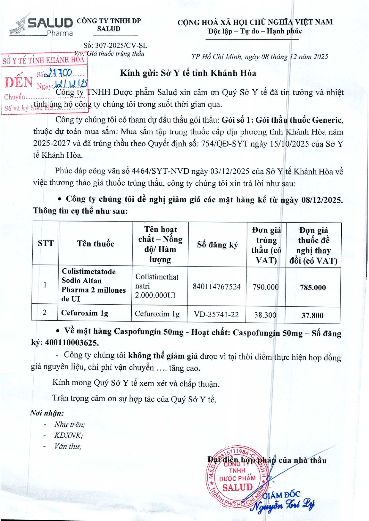 Quyết định Về việc điều chỉnh một số nội dung của Quyết định số 754/QĐ-SYT ngày 15/10/2025 của Sở Y tế về việc phê duyệt kết quả lựa chọn nhà thầu qua mạng gói số 1: Gói thầu thuốc Generic thuộc kế hoạch lựa chọn nhà thầu cung cấp thuốc: Mua sắm tập trung thuốc cấp địa phương tỉnh Khánh Hòa năm 2025-2027 (lần 2)
