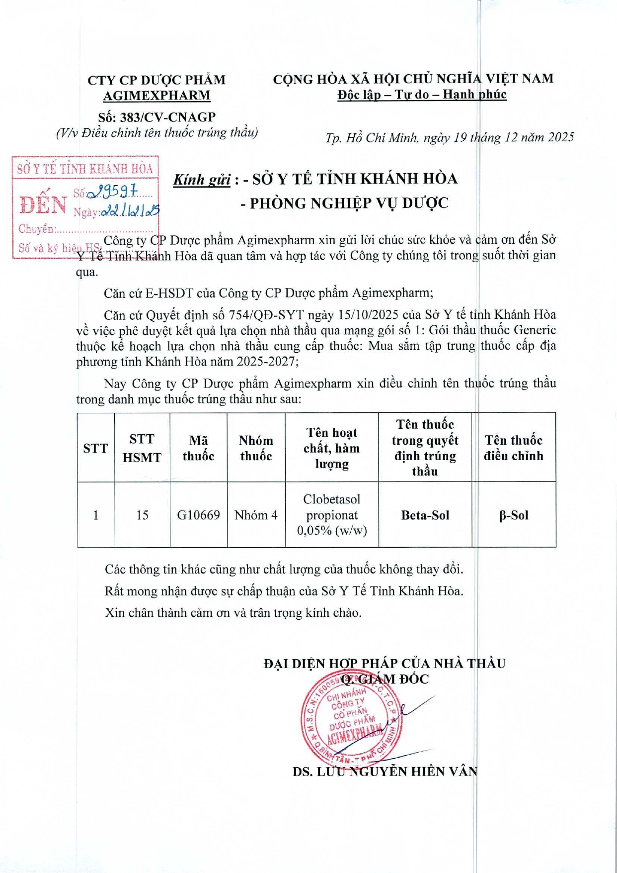 Quyết định Về việc điều chỉnh một số nội dung của Quyết định số 754/QĐ-SYT ngày 15/10/2025 của Sở Y tế về việc phê duyệt kết quả lựa chọn nhà thầu qua mạng gói số 1: Gói thầu thuốc Generic thuộc kế hoạch lựa chọn nhà thầu cung cấp thuốc: Mua sắm tập trung thuốc cấp địa phương tỉnh Khánh Hòa năm 2025-2027 (lần 2)