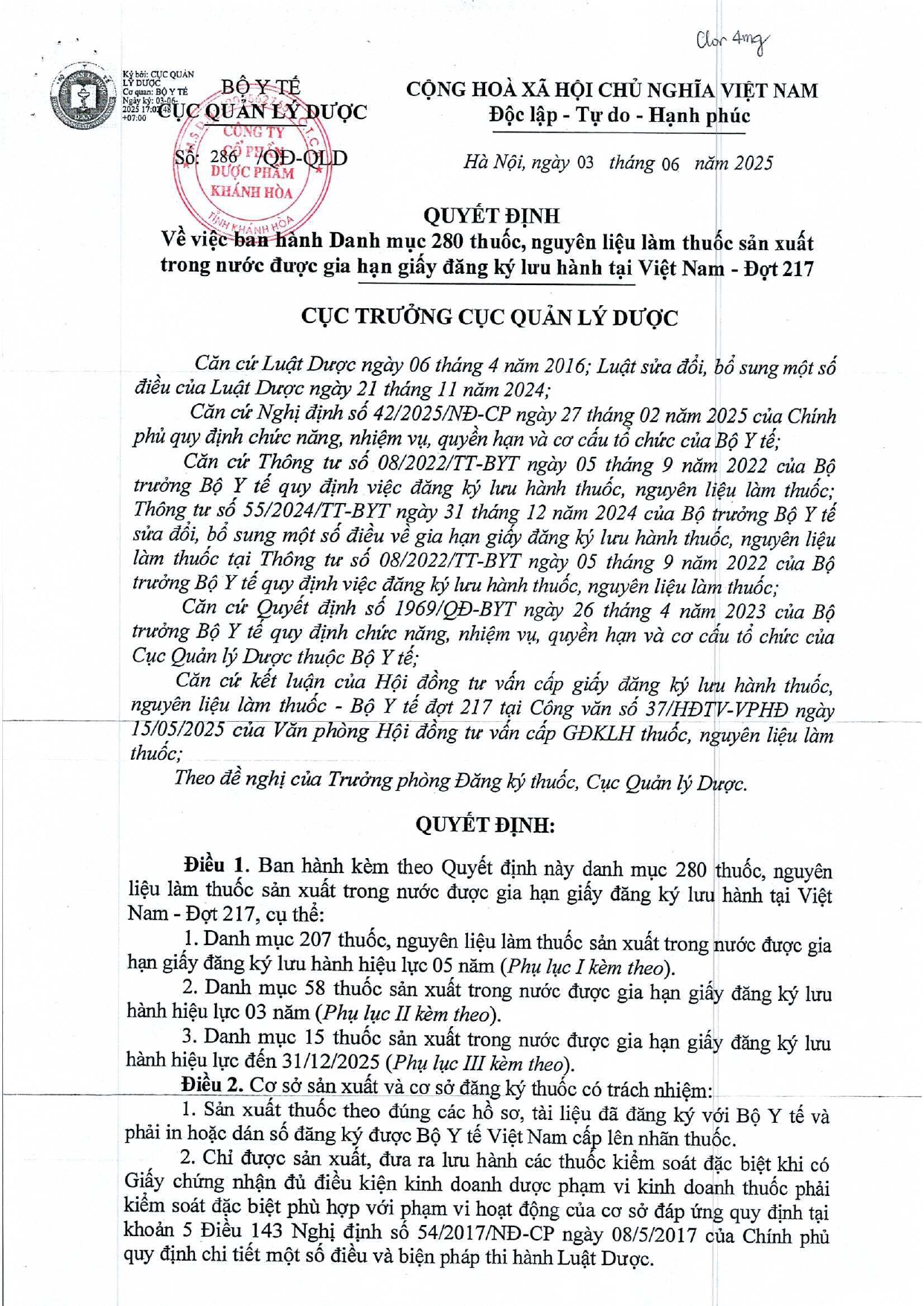 Quyết định Về việc phê duyệt kết quả lựa chọn nhà thầu qua mạng gói số 1: Gói thầu thuốc Generic thuộc kế hoạch lựa chọn nhà thầu cung cấp thuốc: Mua sắm tập trung thuốc cấp địa phương tỉnh Khánh Hòa năm 2025-2027