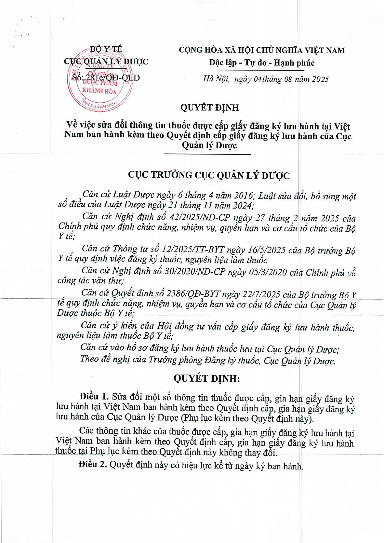 Quyết định Về việc điều chỉnh một số nội dung của Quyết định số 754/QĐ-SYT ngày 15/10/2025 của Sở Y tế về việc phê duyệt kết quả lựa chọn nhà thầu qua mạng gói số 1: Gói thầu thuốc Generic thuộc kế hoạch lựa chọn nhà thầu cung cấp thuốc: Mua sắm tập trung thuốc cấp địa phương tỉnh Khánh Hòa năm 2025-2027 (lần 2)