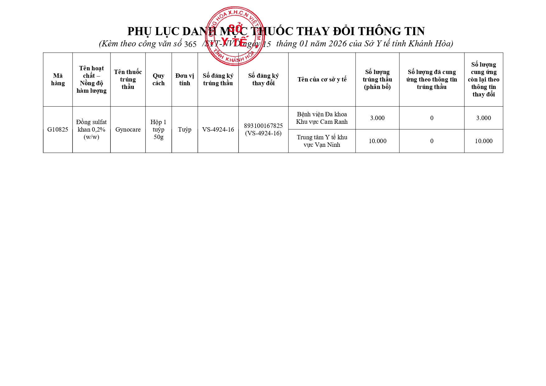 Quyết định Về việc điều chỉnh một số nội dung của Quyết định số 754/QĐ-SYT ngày 15/10/2025 của Sở Y tế về việc phê duyệt kết quả lựa chọn nhà thầu qua mạng gói số 1: Gói thầu thuốc Generic thuộc kế hoạch lựa chọn nhà thầu cung cấp thuốc: Mua sắm tập trung thuốc cấp địa phương tỉnh Khánh Hòa năm 2025-2027 (lần 2)