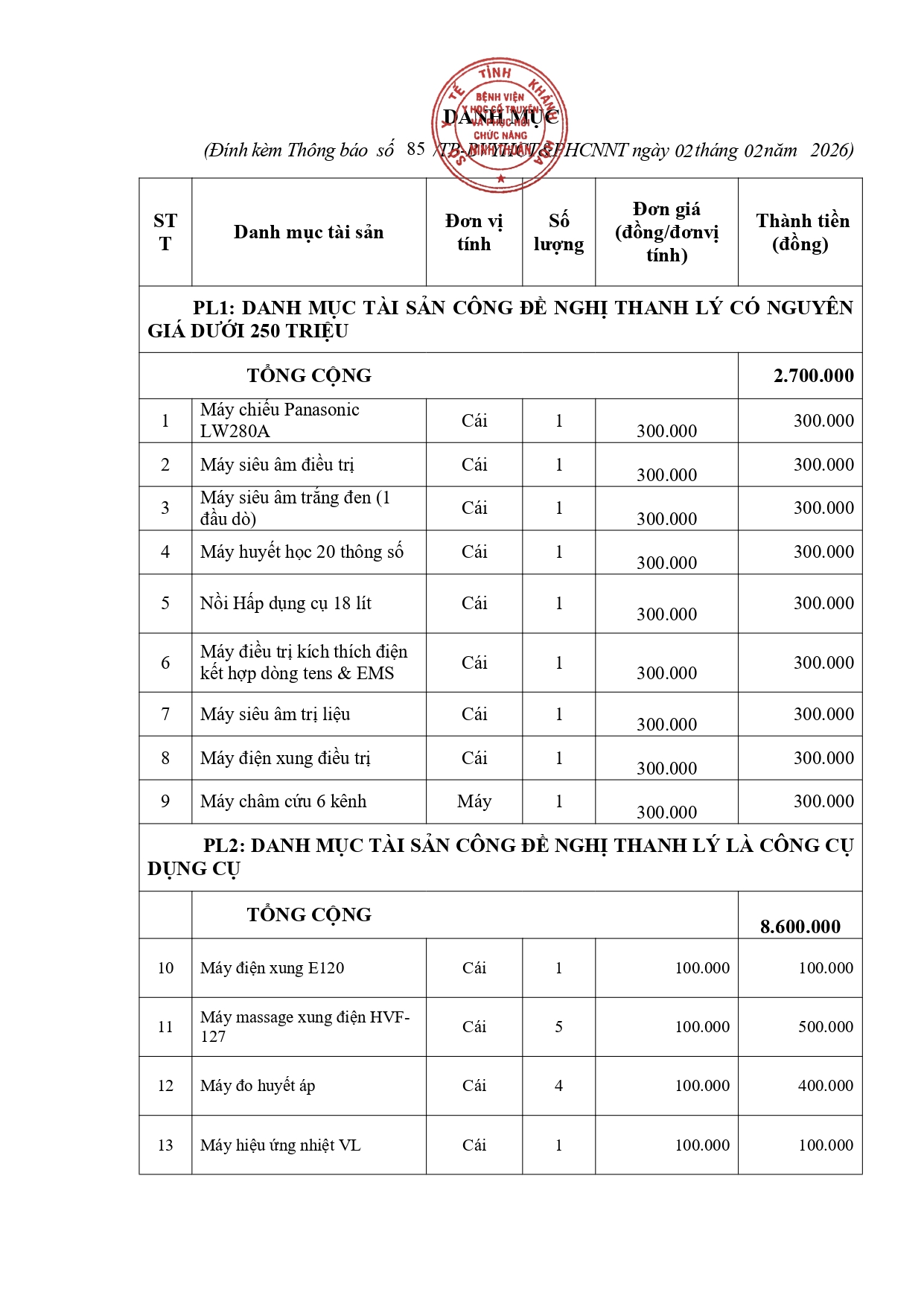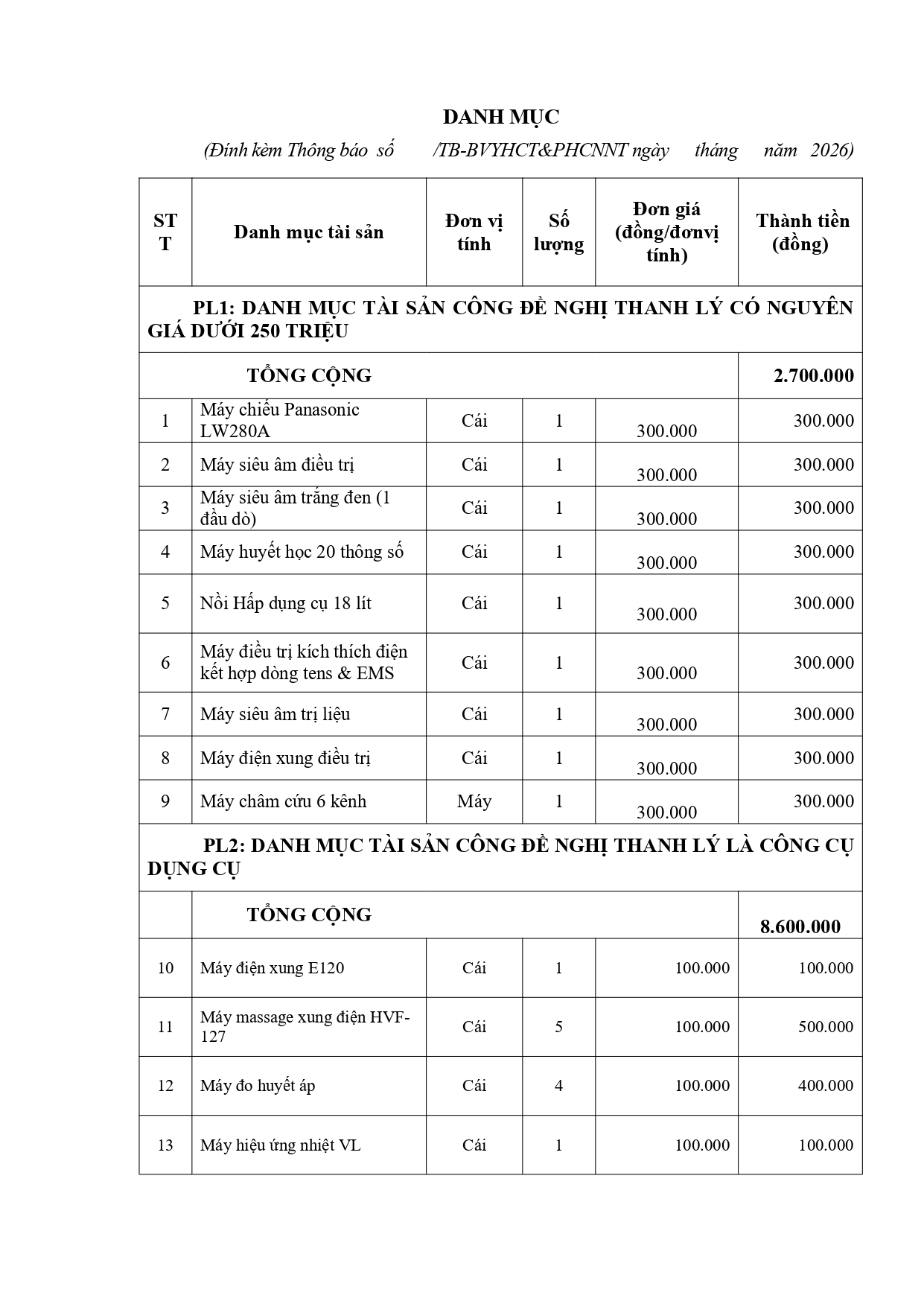 THÔNG BÁO Về việc bán thanh lý tài sản công theo hình thức chỉ định